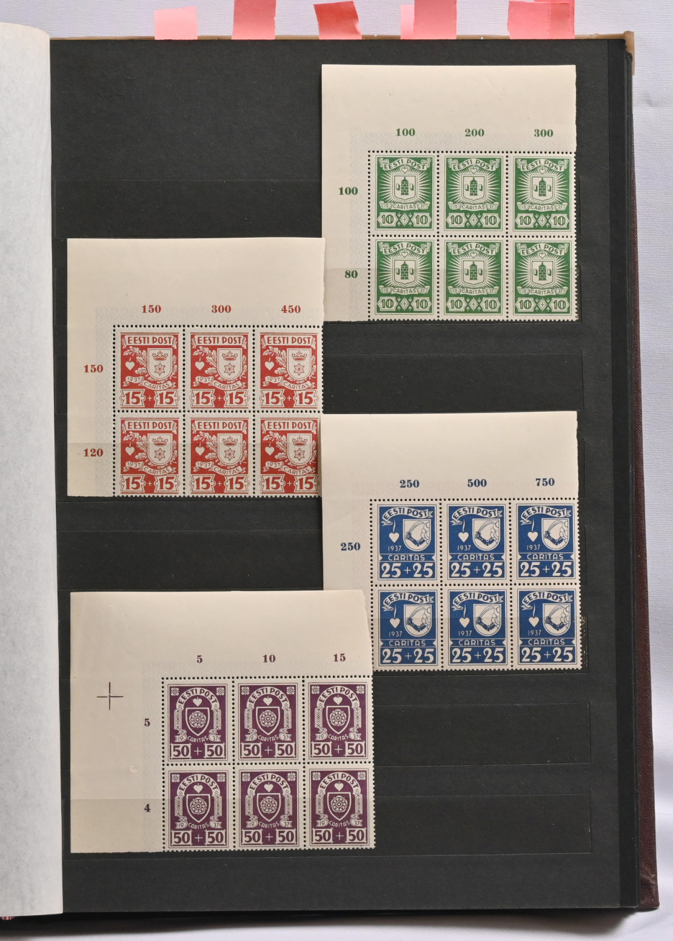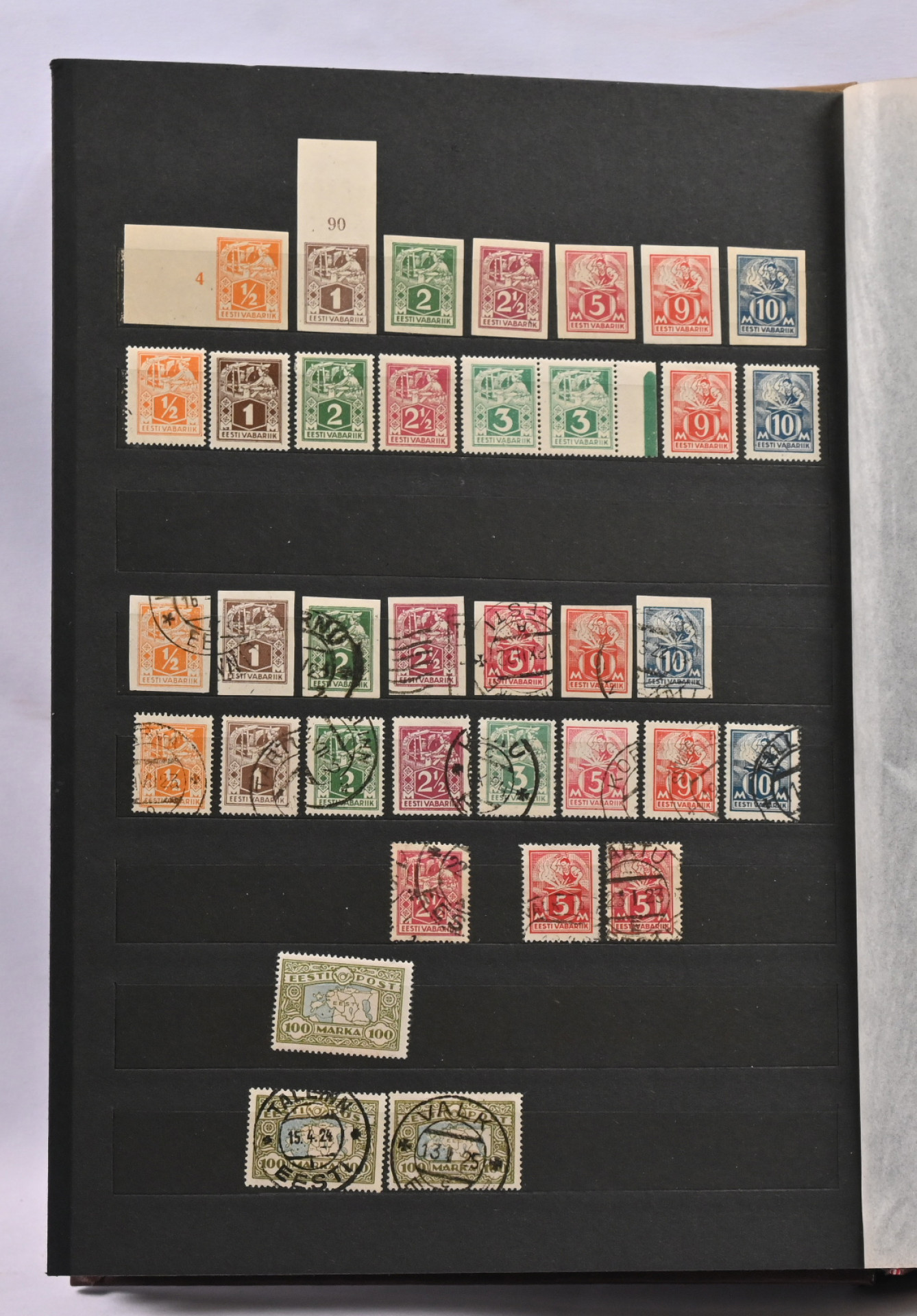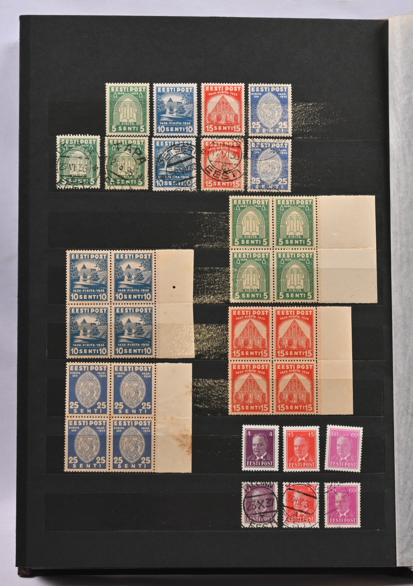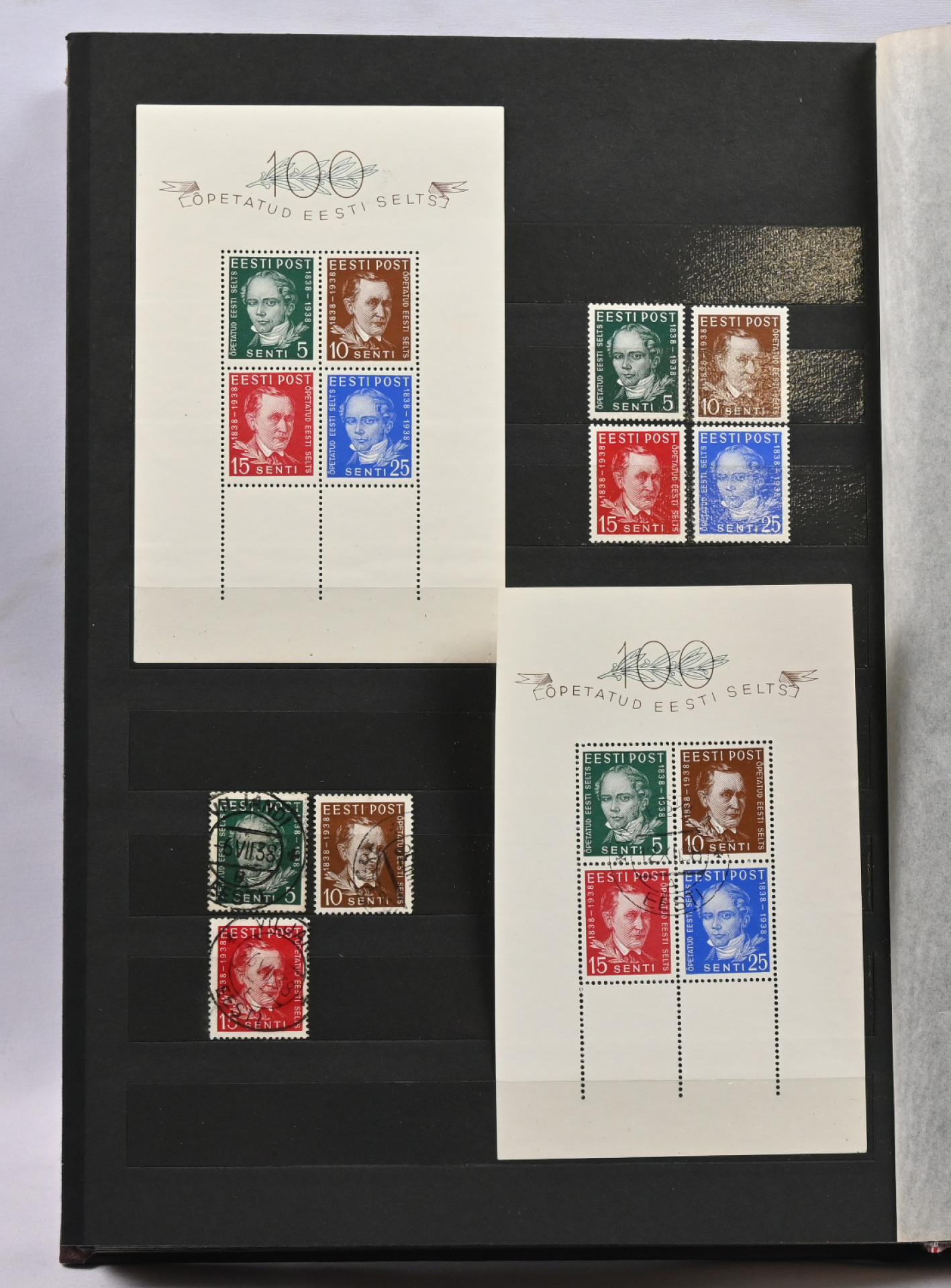 1918 - 1940 Hyvä **/*/o kokoelma säiliökirjassa. Käytännössä täydellinen päälajien osalta. Suurin osa merkeistä sekä leimattuna että käyttämättömänä (**/*). Kaikki pienoisarkit, Caritas-merkkien ryhmiä (mm. 1937 postituoreet kuusilot), kaikki Päts-merkit postituoreena jne. Jotkut käyttämättömistä merkeistä saaneet kosteutta ja ovat osin tarttuneet kiinni sivuihin. Irrotettaessa saattaa tarttua mustaa paperia. Kuitenkin hieno kokoelma. Nähtävä!