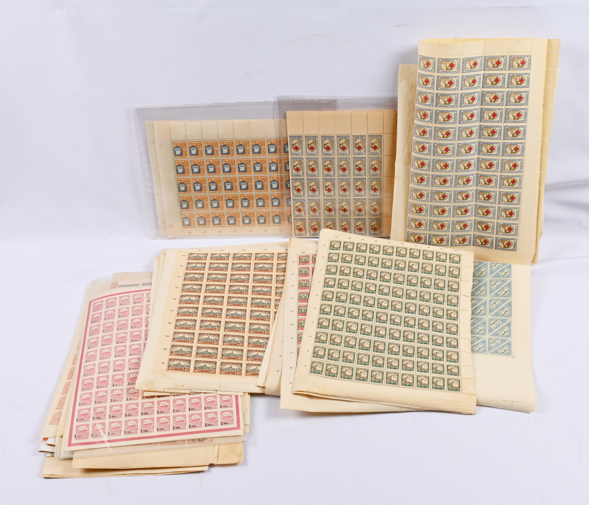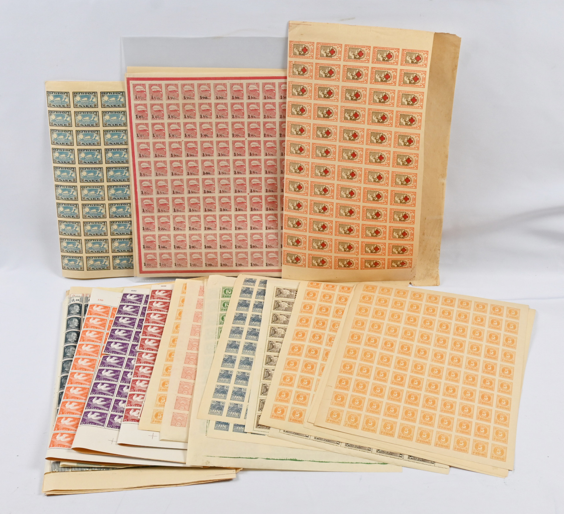 1919 - 1940 iso erä arkkeja ja isompia arkin osia, n. 50 kappaletta, mm. 1921 Punainen Risti 5/7 markkaa kaksi arkkia joista molemmista yhdeltä pystyriviltä puuttuu vaakahammaste (Mi 30A Uw), Mi 48A, 49A ja 51A arkit, Mi 63-67 arkkisarja, Mi 152 ja 155 arkit jne. Osa arkkien hammasteista auennut, jotkut arkit auenneet paljonkin.