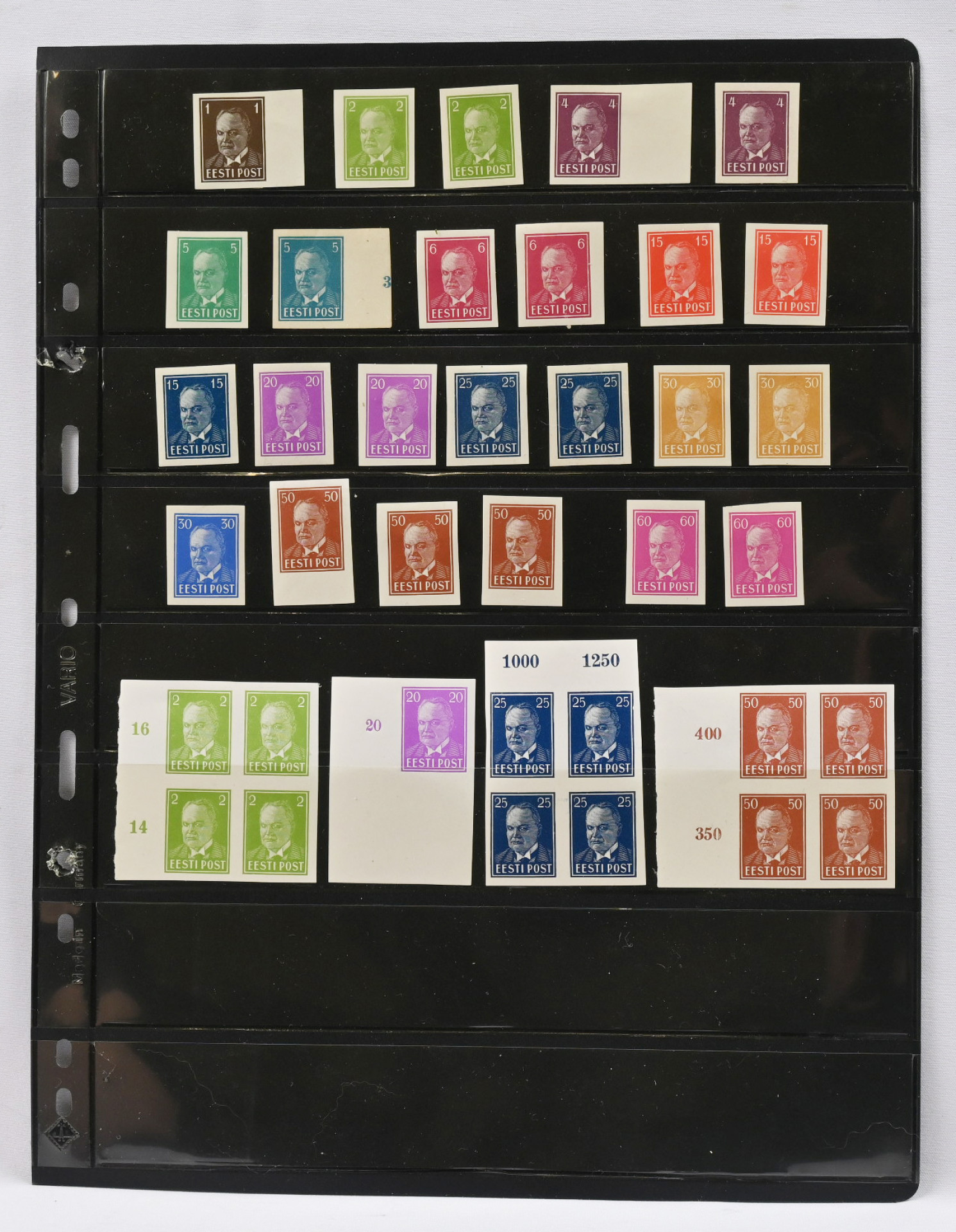 1936 - 1940 Päts, hieno erä hammastamattomia vedoksia, 25 irtomerkkiä sekä kolme nelilöä
