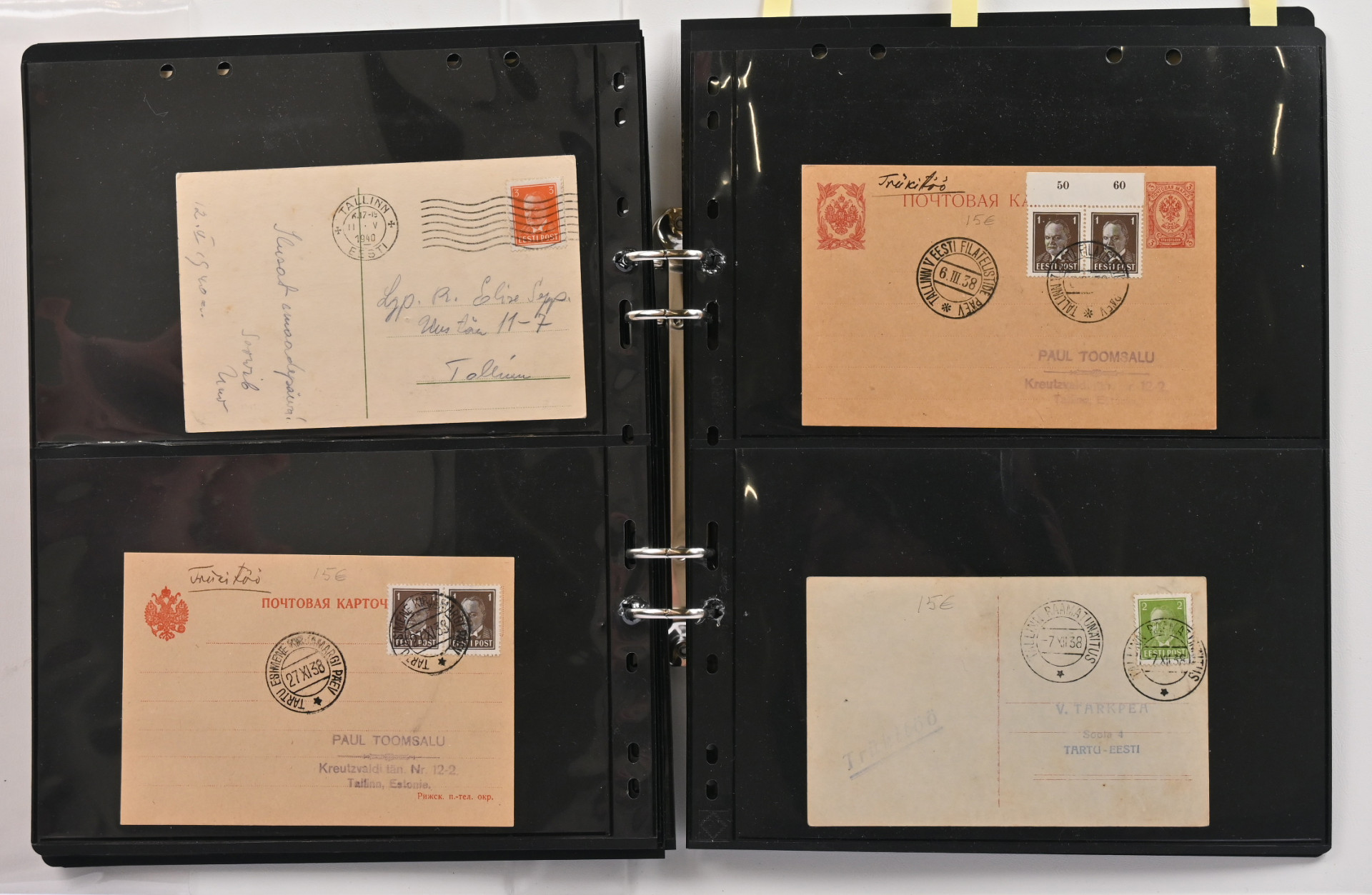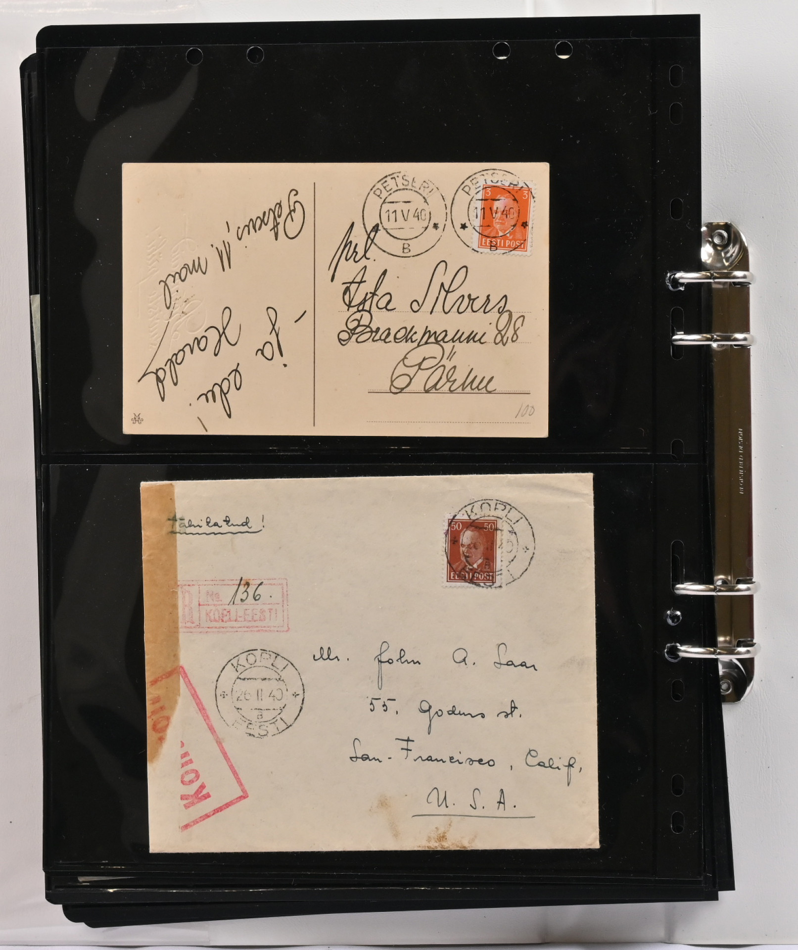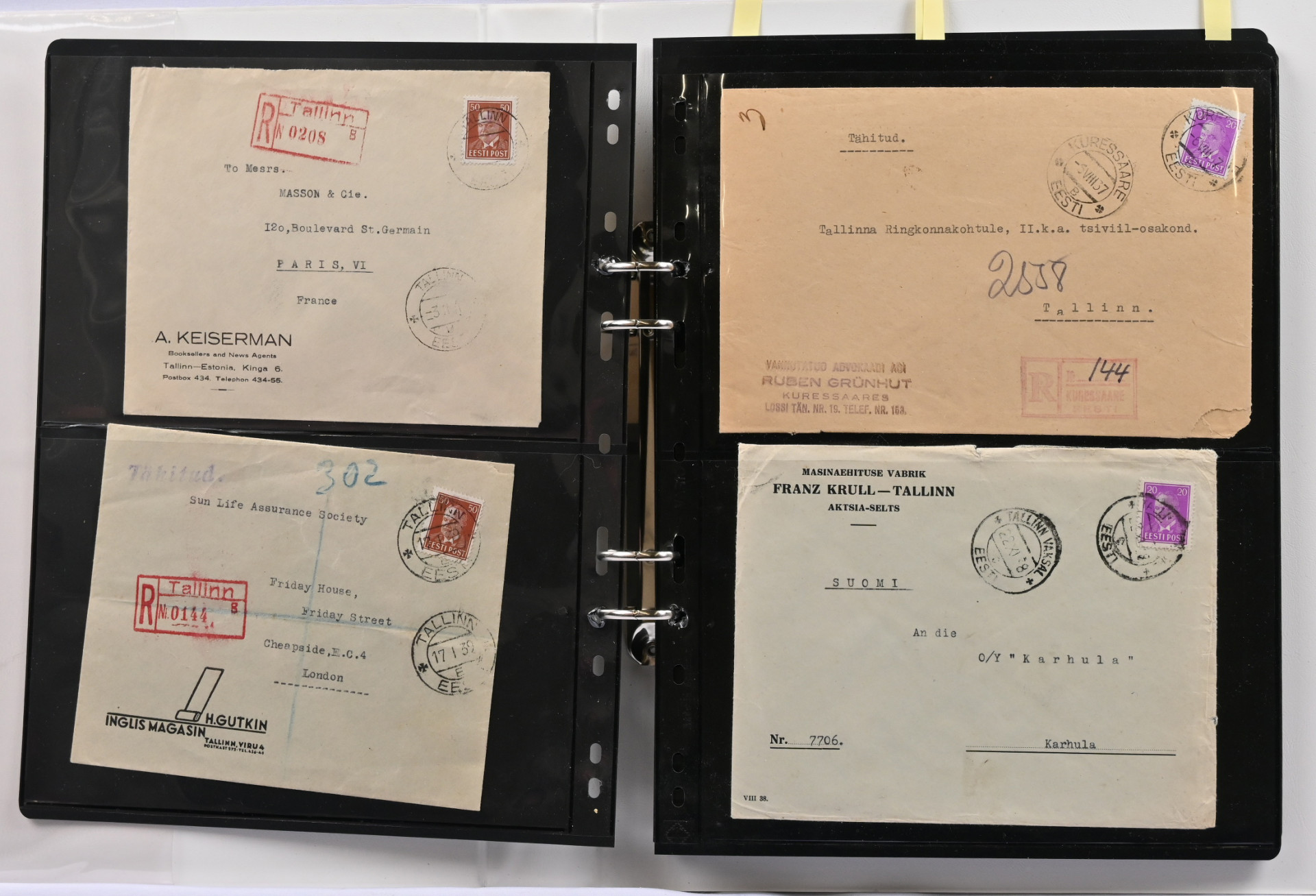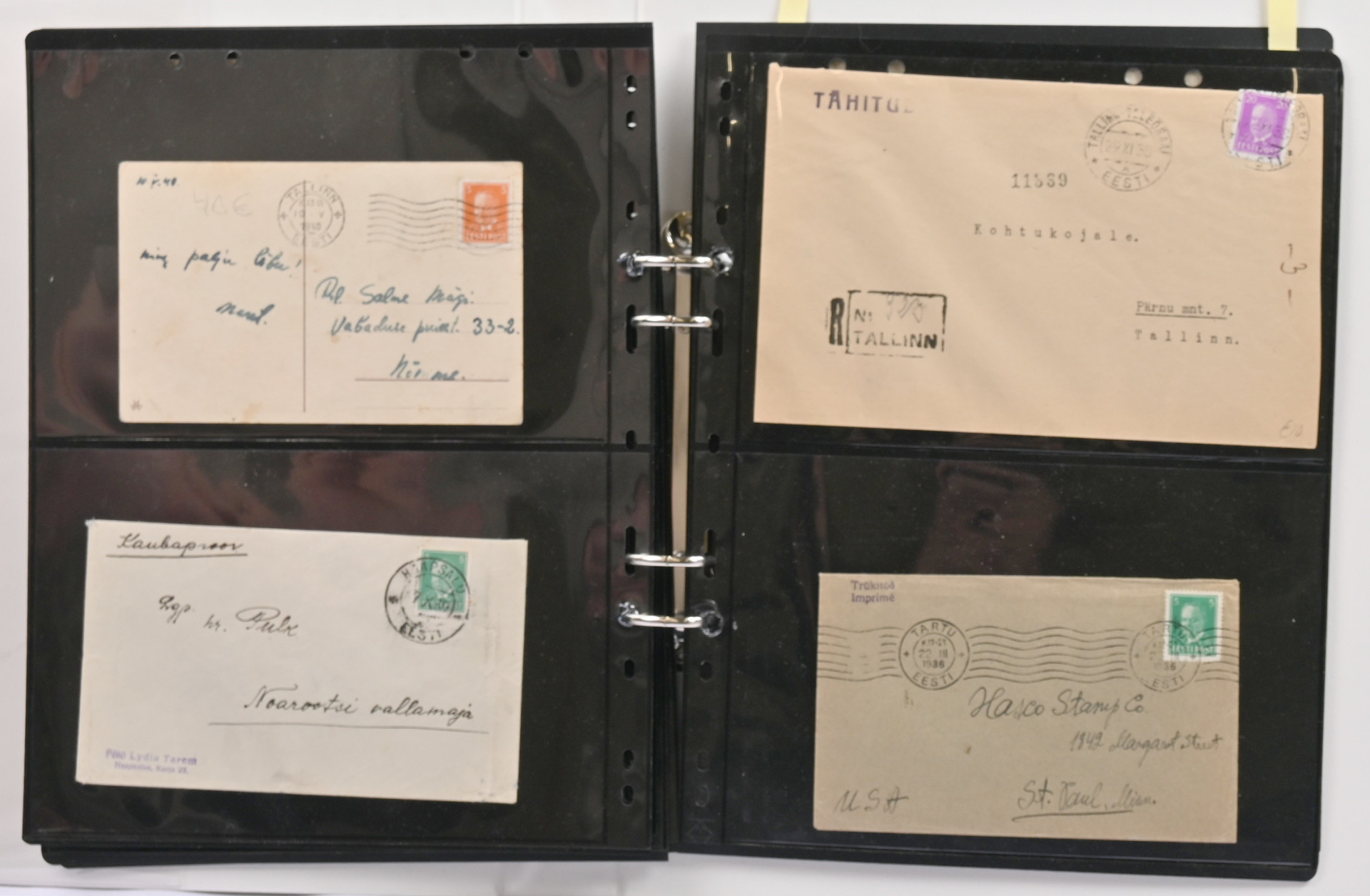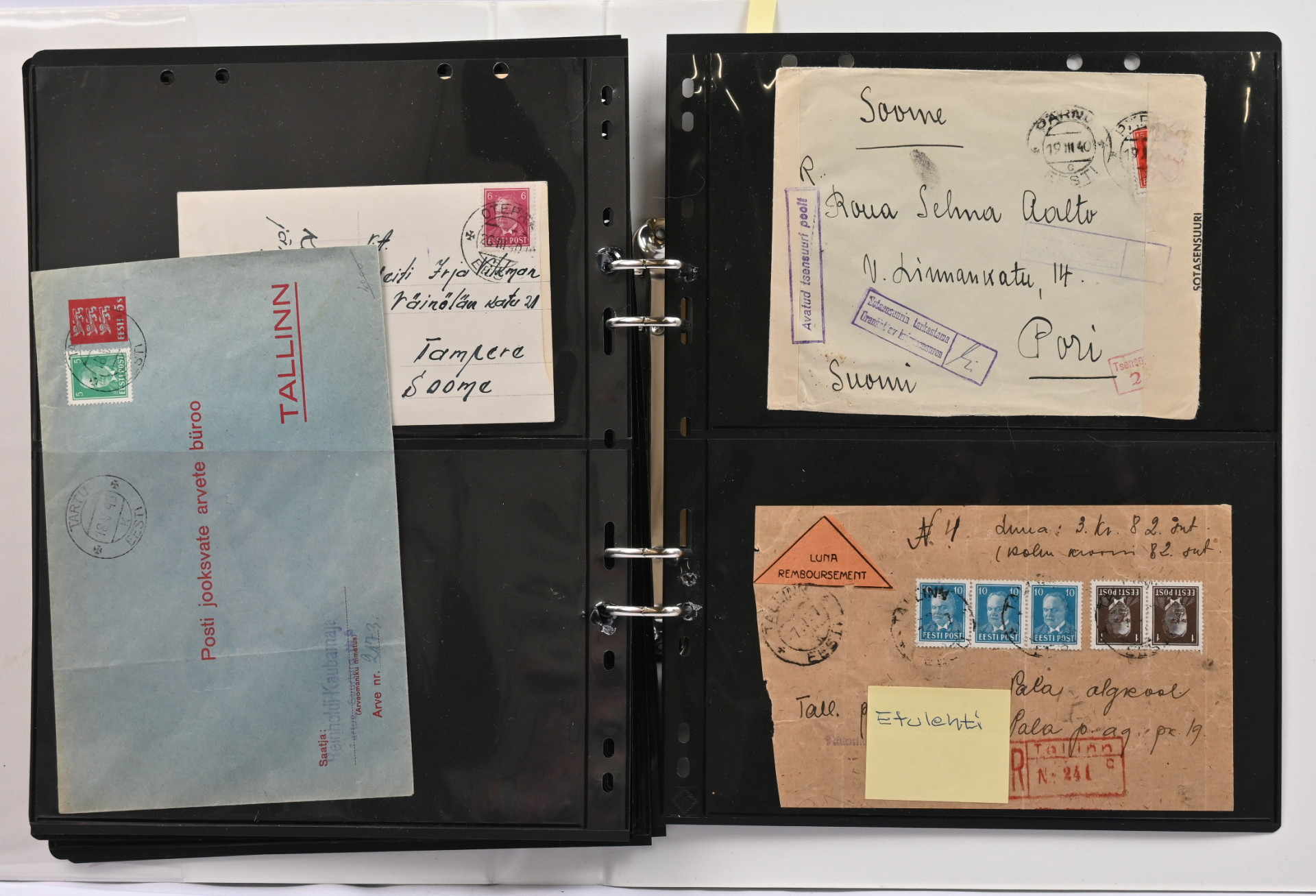 1936 - 1940 Päts, mielenkiintoinen postilähetyserä albumissa. 27 lähetystä sekä yksi etulehti, mm. kirjattuja, ulkomaille kuten Ranskaan, Englantiin, Suomeen, Sveitsiin, USA:han, sensuuria, yksi ehiö lisämerkillä, painotuote USA:han ym. kiintoisaa