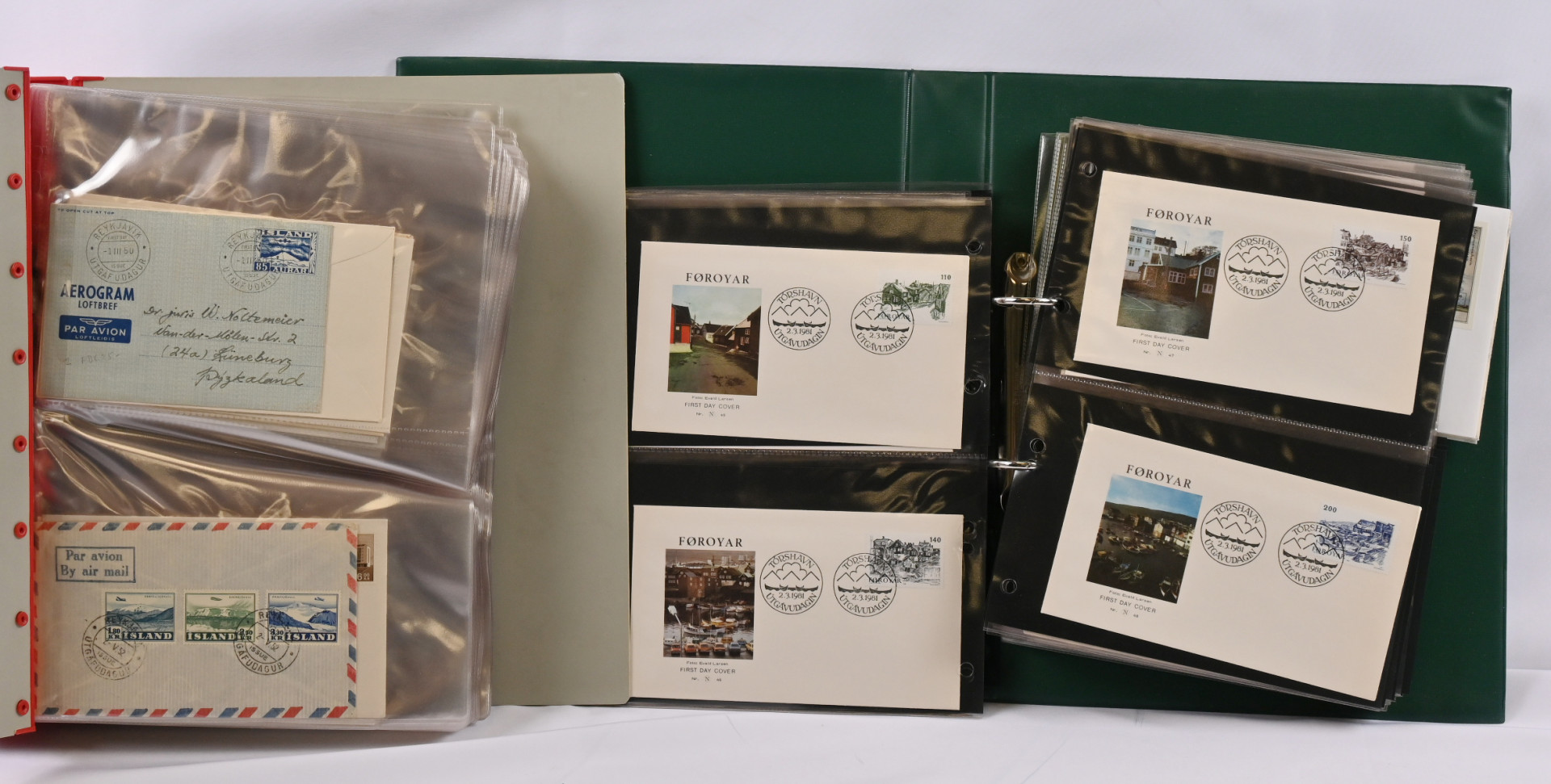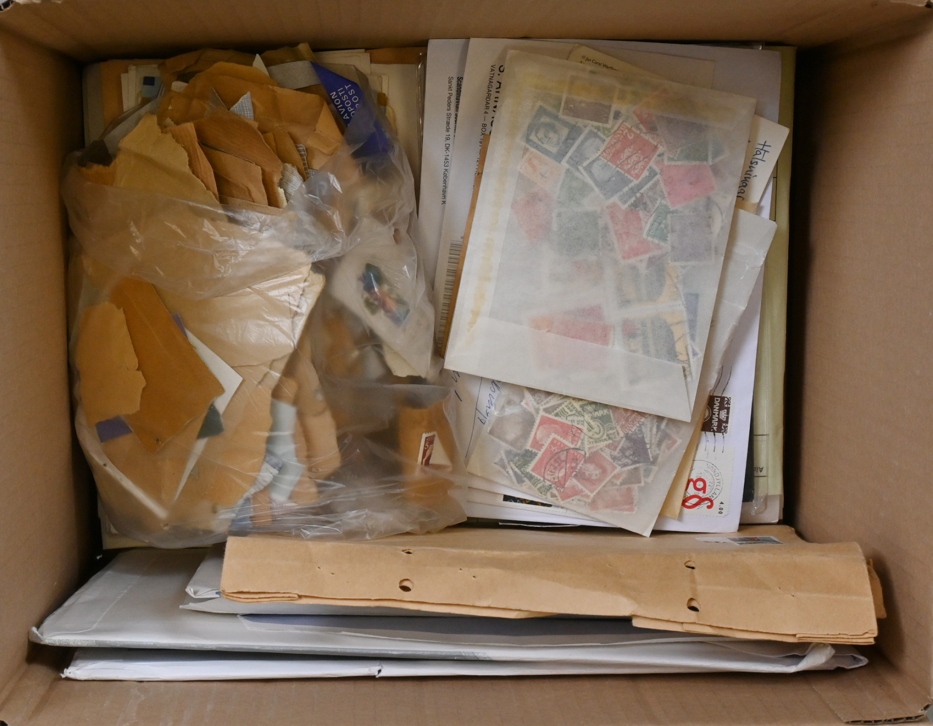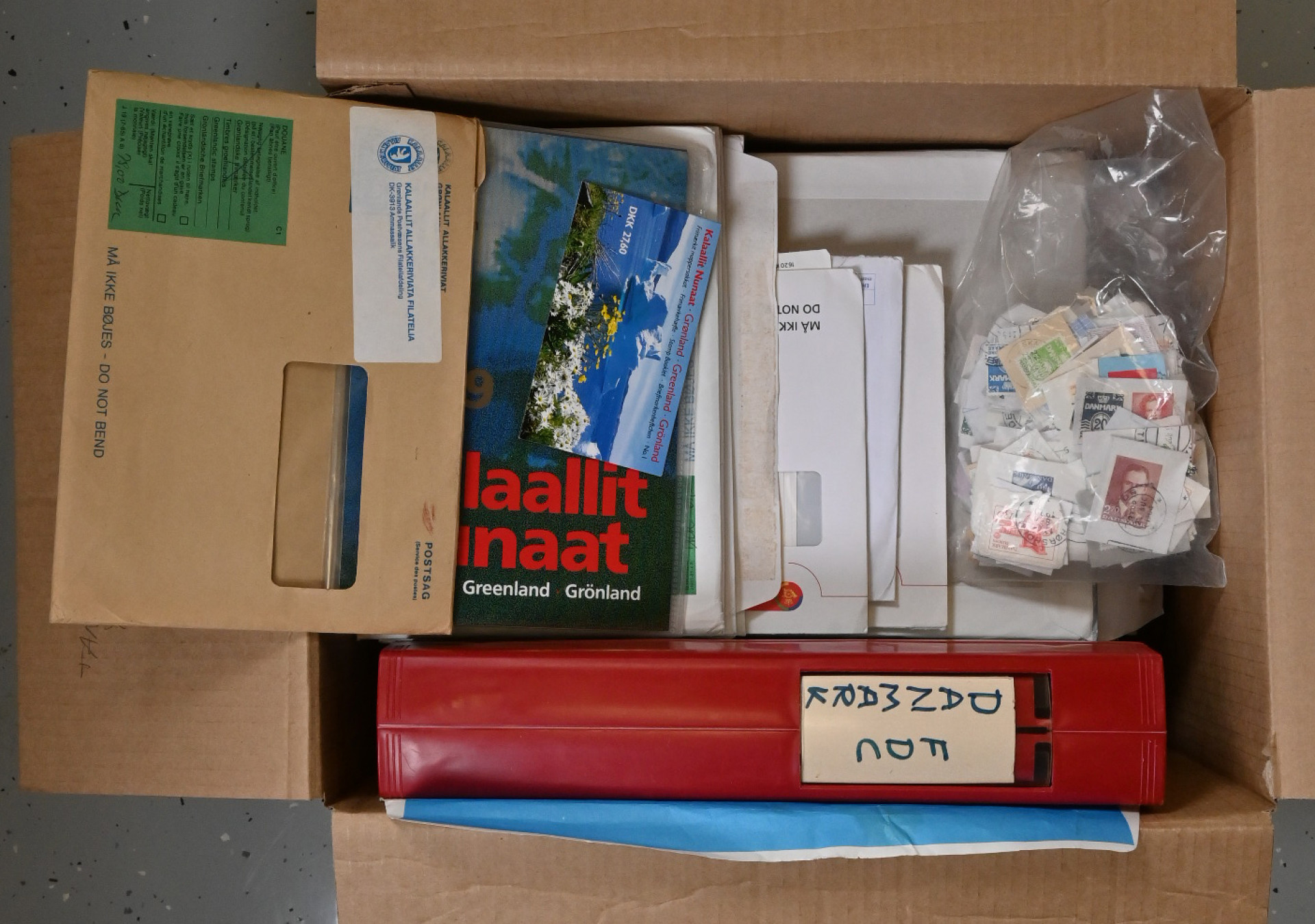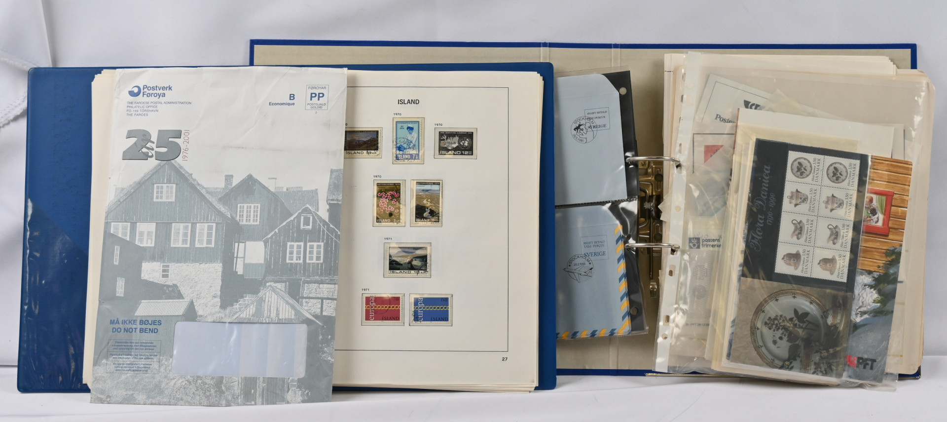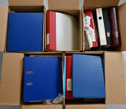 Norja, Islanti, Tanska, Grönlanti ja Färsaaret, JÄTTIERÄ materiaalia viidessä laatikossa, yhteensä yli 55 KG!! Mukana valtava määrä postien uutuuspalveluista tilattua materiaalia vielä kirjekuorissa mainoksineen, mm. merkkejä ja vuosilajitelmia, lisäksi kokoelmia kansioissa, tyhjiä/lähes tyhjiä kansioita, massaa, postilähetyksiä ym. ym. Vanhaa ja uudempaa materiaalia, järjesteltävää pitkäksi aikaa!