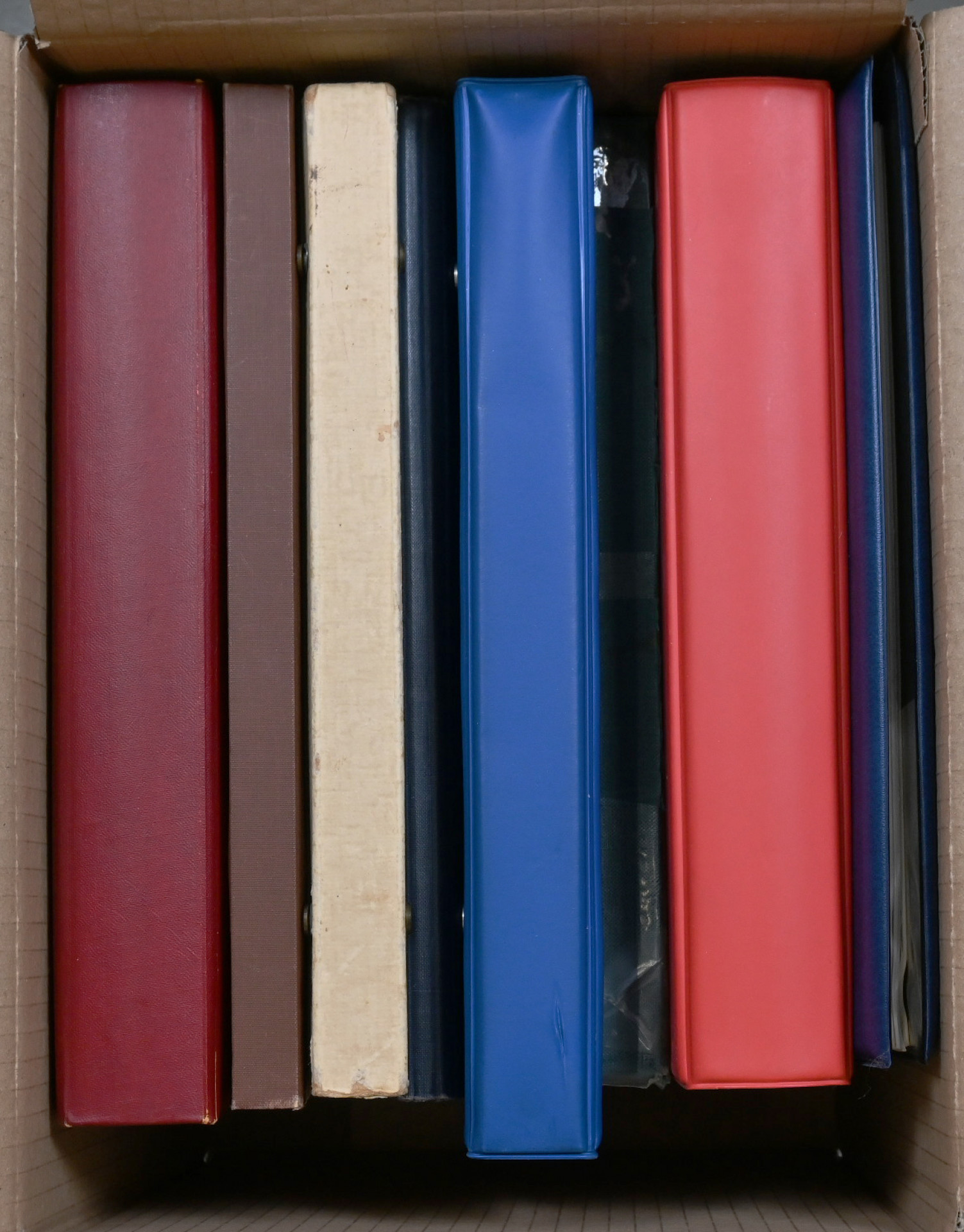 Kahdeksassa säiliökirjassa/albumissa sekalainen materiaali, mm. koko maailma-albumeita, vaatimaton Ruotsi-kokoelma, USA jne.