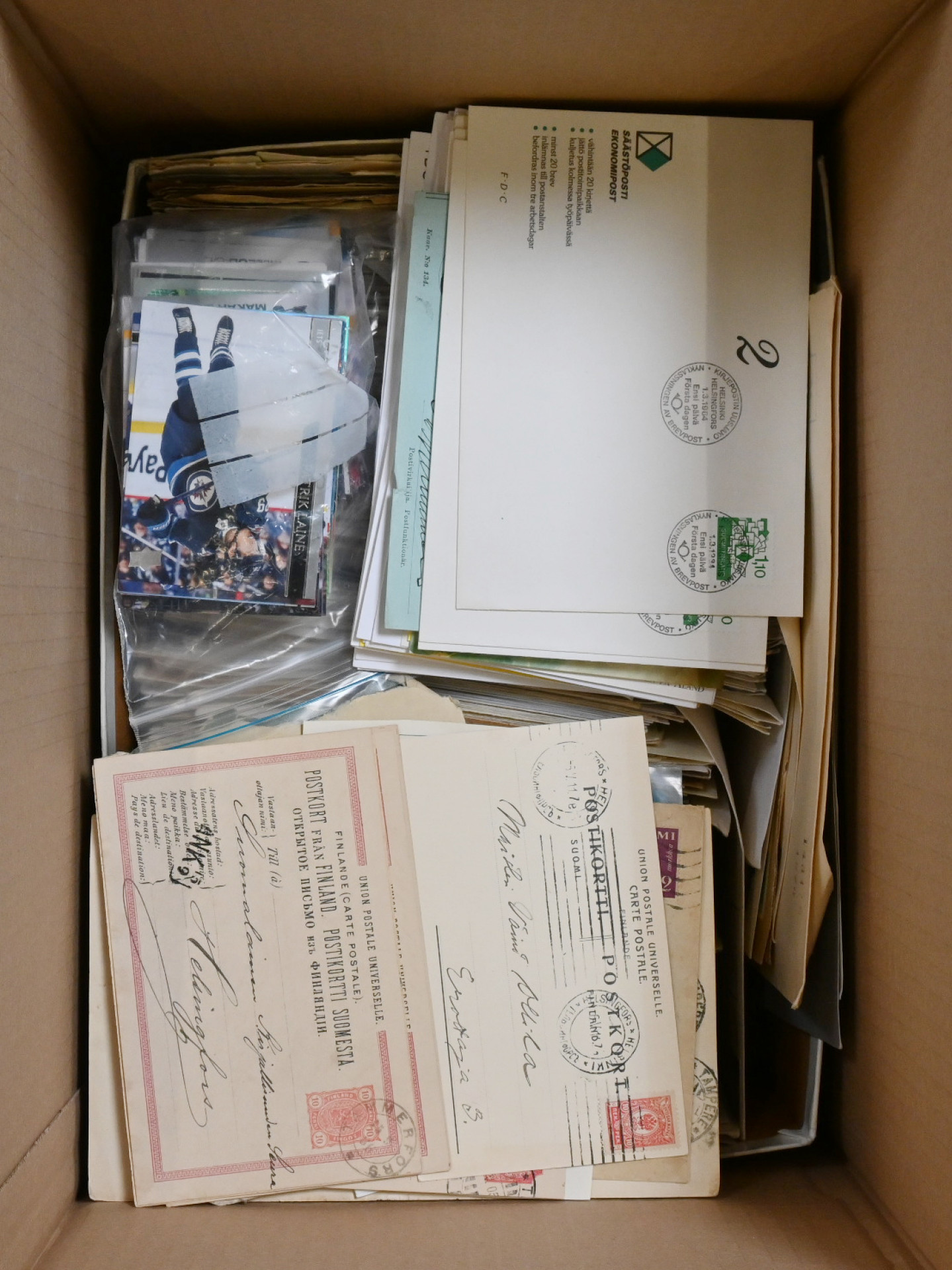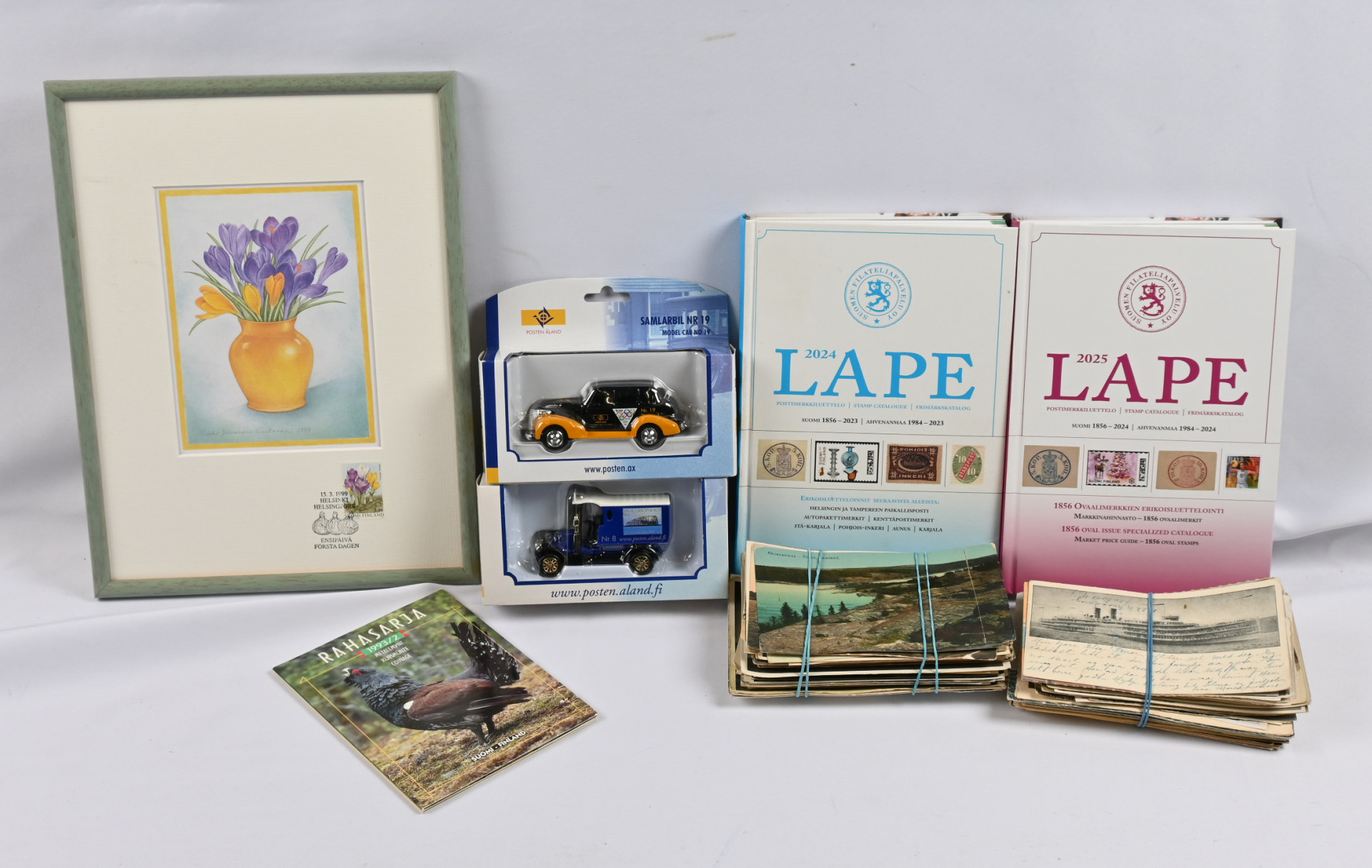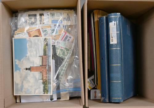 Kahdessa laatikossa sekalainen materiaali Suomea ja ulkomaita. Mukana mm. jäännöskokoelmat Portugalista ja Suomesta, runsaasti kuoria ja postikortteja, LAPE 2024 ja 2025 postimerkkiluettelot, kaksi Ahvenanmaan Postin keräilyautoa, pieni nippu jääkiekkokortteja, hiukan irtomerkkejä ja leikettä jne. Yhteensä yli 10 KG