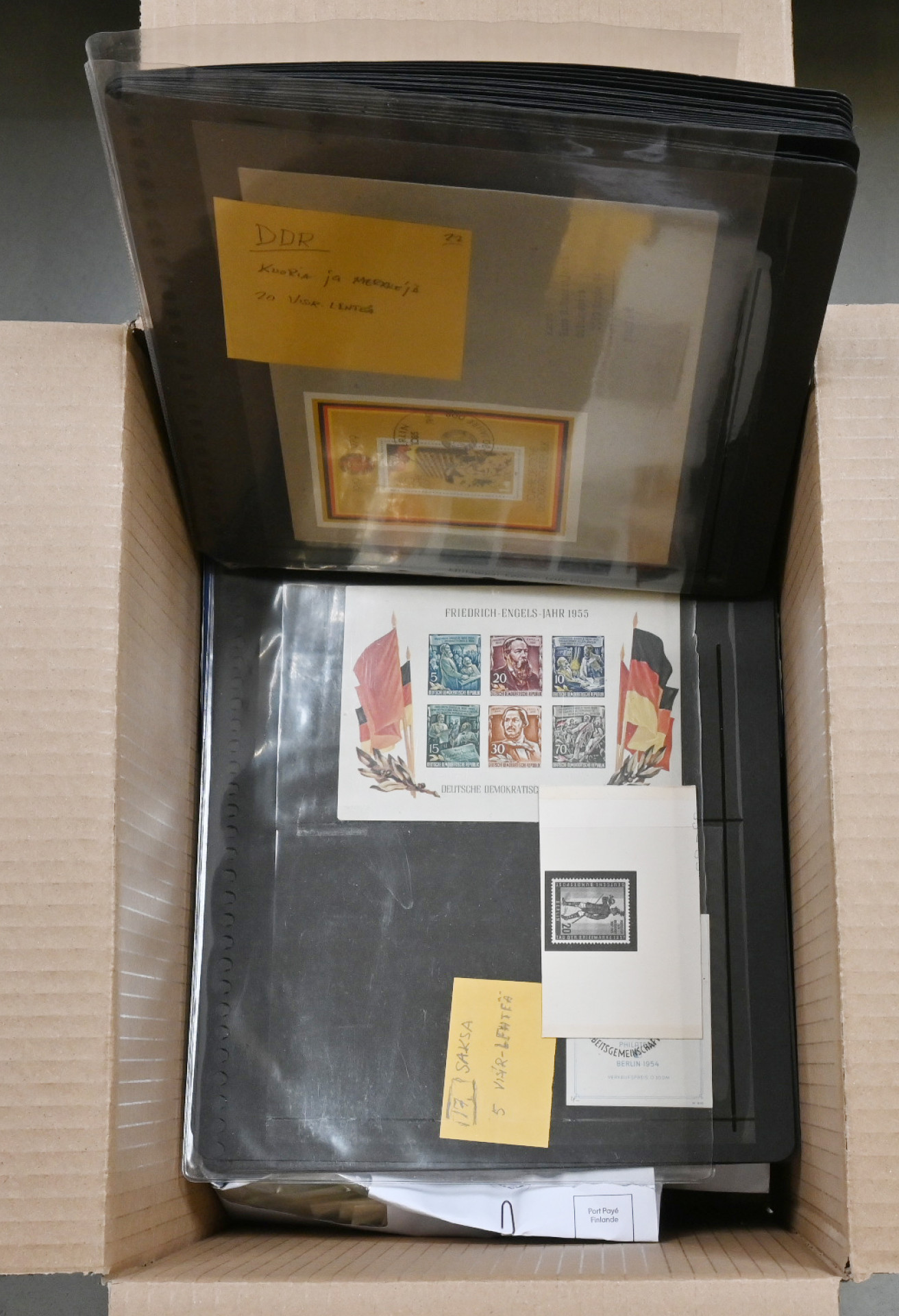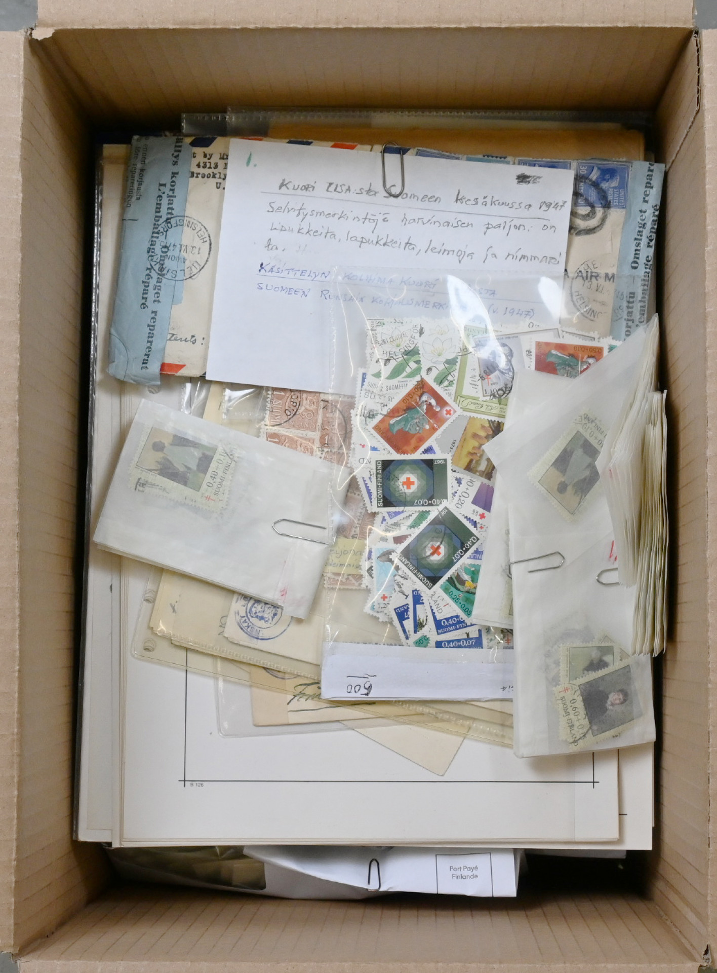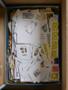 Keräilijän kaapista sekalainen materiaali yli 3 KG laatikossa: leikettä sisältäen hiukan modernia Suomi-leikettä, nippu Suomeen tulleita lähetyksiä, Nigerian massamerkkejä pergamiinipusseissa, Saksaa varastosivuilla (pääosin DDR), Suomen ja Ahvenanmaan 1980 - 1990-lukujen materiaalia kokoelmalehdillä, suomalaisia Punaisen Ristin ja tuberkuloosin leimattuja merkkejä pusseissä, vähän ulkomaiden postilähetyksiä jne. Tukimista pitkäksi aikaa!