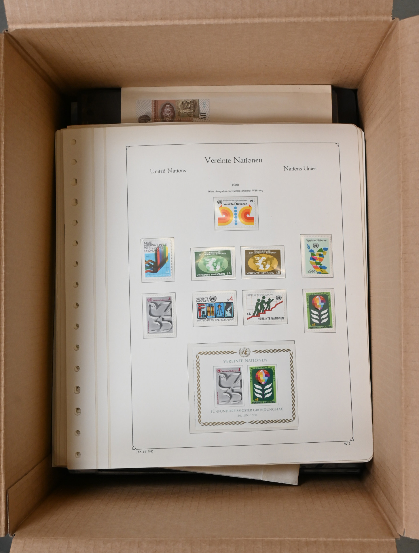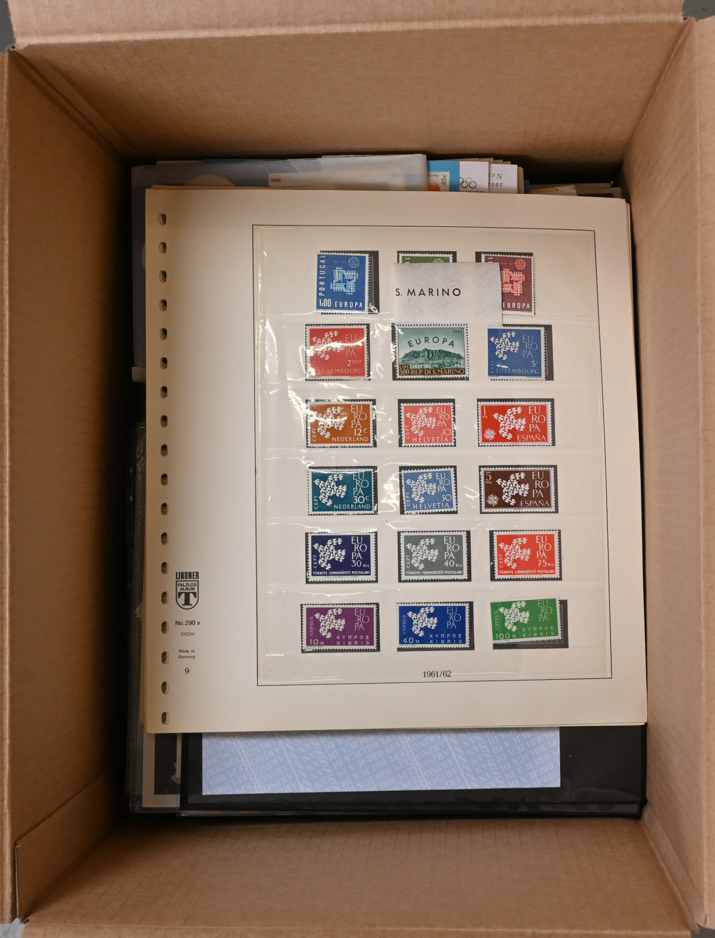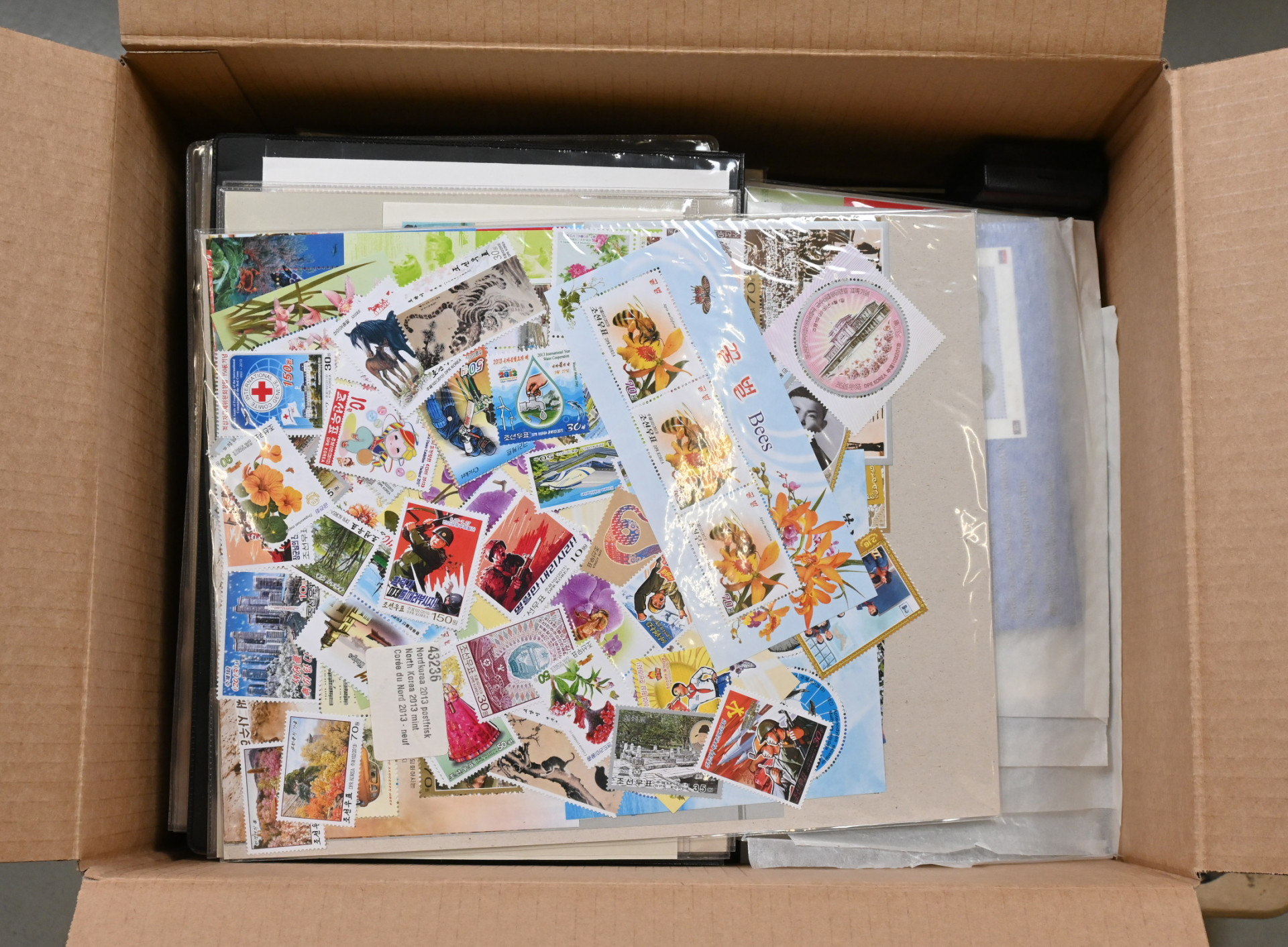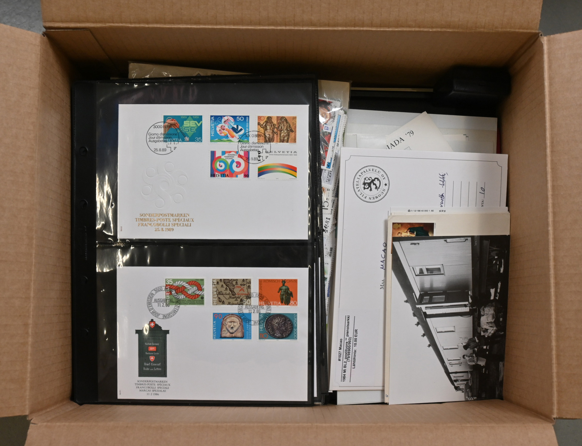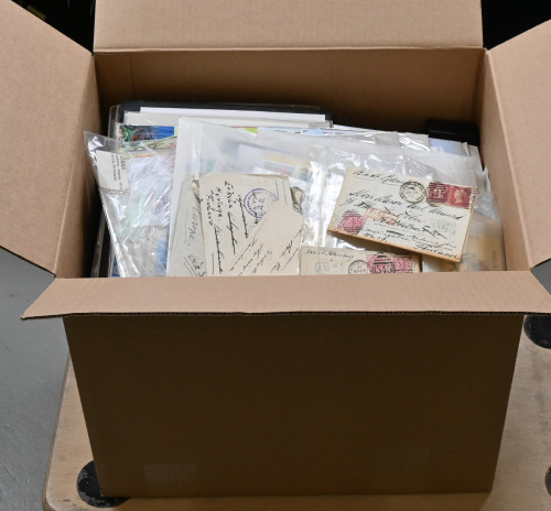 Koko maailma, värikäs aineisto yli 13 KG:n laatikossa. Monenlaista materiaalia, pääosin uudempaa värikästä aihemateriaalia sisältäen mm. iso nippu meksikolaisia kokonaisia arkkeja (samaa merkkiä useita arkkeja), Vatikaanin arkkeja mapissa, paljon sekalaisia FDC- ym. kuoria hienoin aihein monista eri maista, uusia merkkejä pergamiinipusseissa, isoja postimerkkipakkauksia, merkkejä varastosivuilla, YK:n materiaalia säiliökirjassa sekä kokoelmasivuilla, Sveitsin Pro Juventute -vihkoja, muutama vanha englantilainen postilähetys ym .ym. Tekemistä ja lajittelemista pitkäksi aikaa!