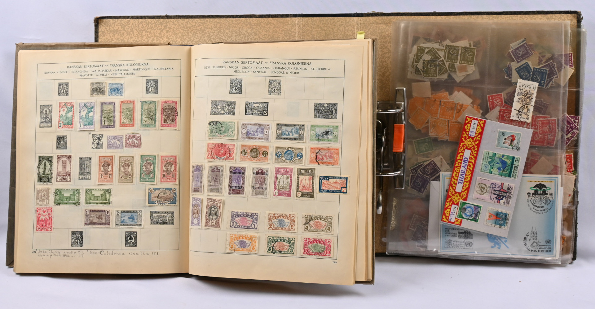 Pieni koko maailma-albumi jossa lähinnä vanhempaa materiaalia eri maista, mm. siirtomaita. Lisäksi mappi jossa lähinnä suomalaisia käyttösarjojen merkkejä alkaen kotkamerkeistä, lisäksi pieni säiliökirja ulkomaiden merkkejä sekä toinen pieni säiliökirja jossa lähinnä suomalaisia vanhempia ja uudempia kirjeensulkijoita