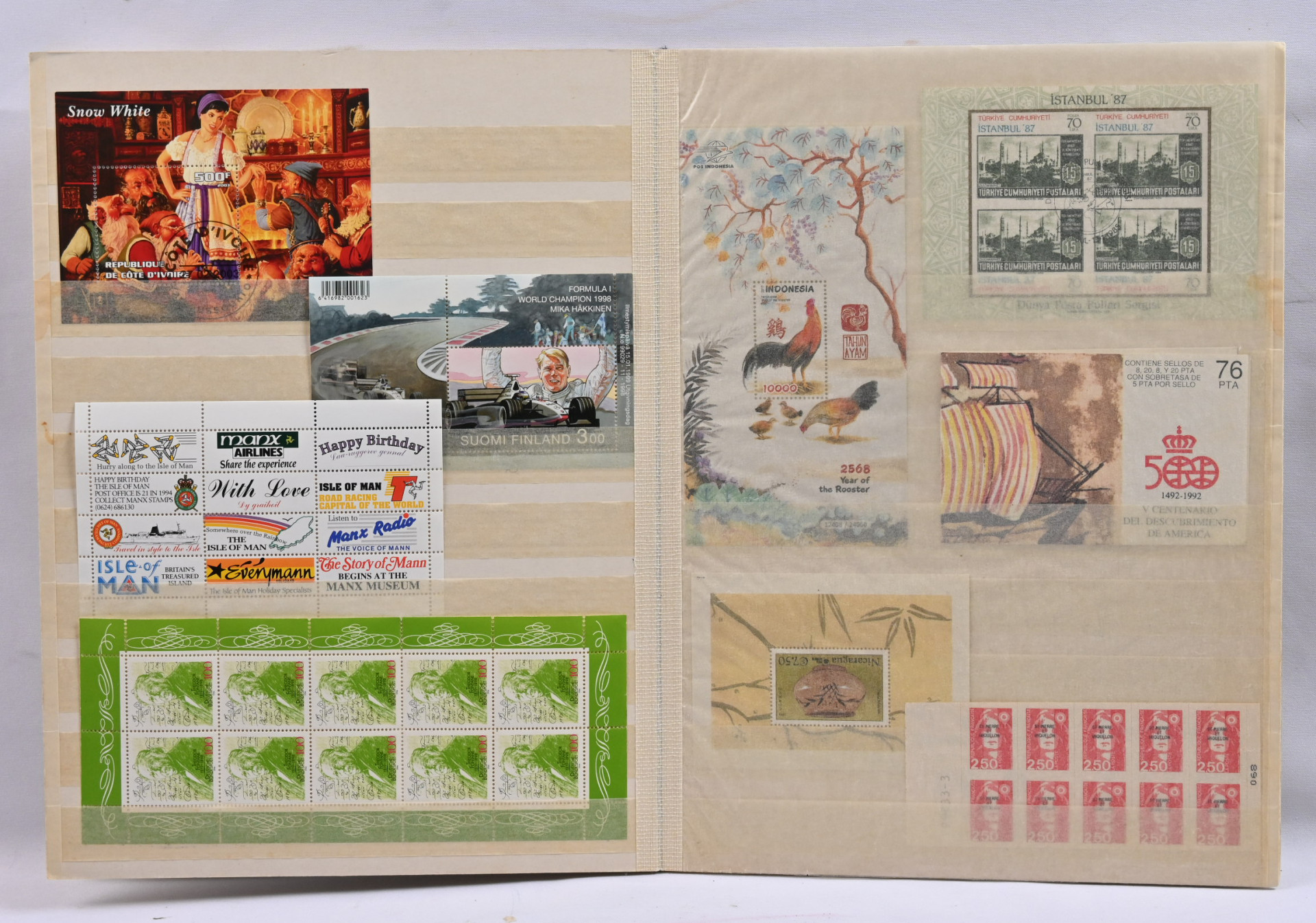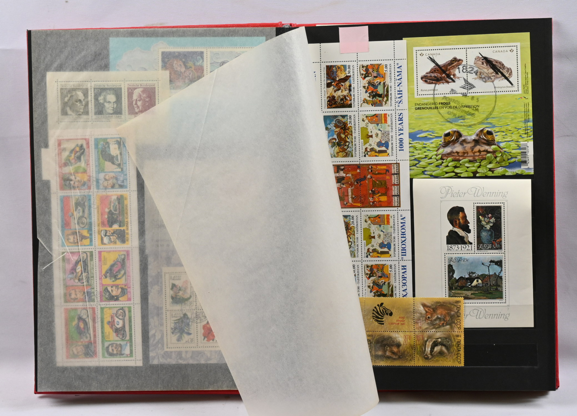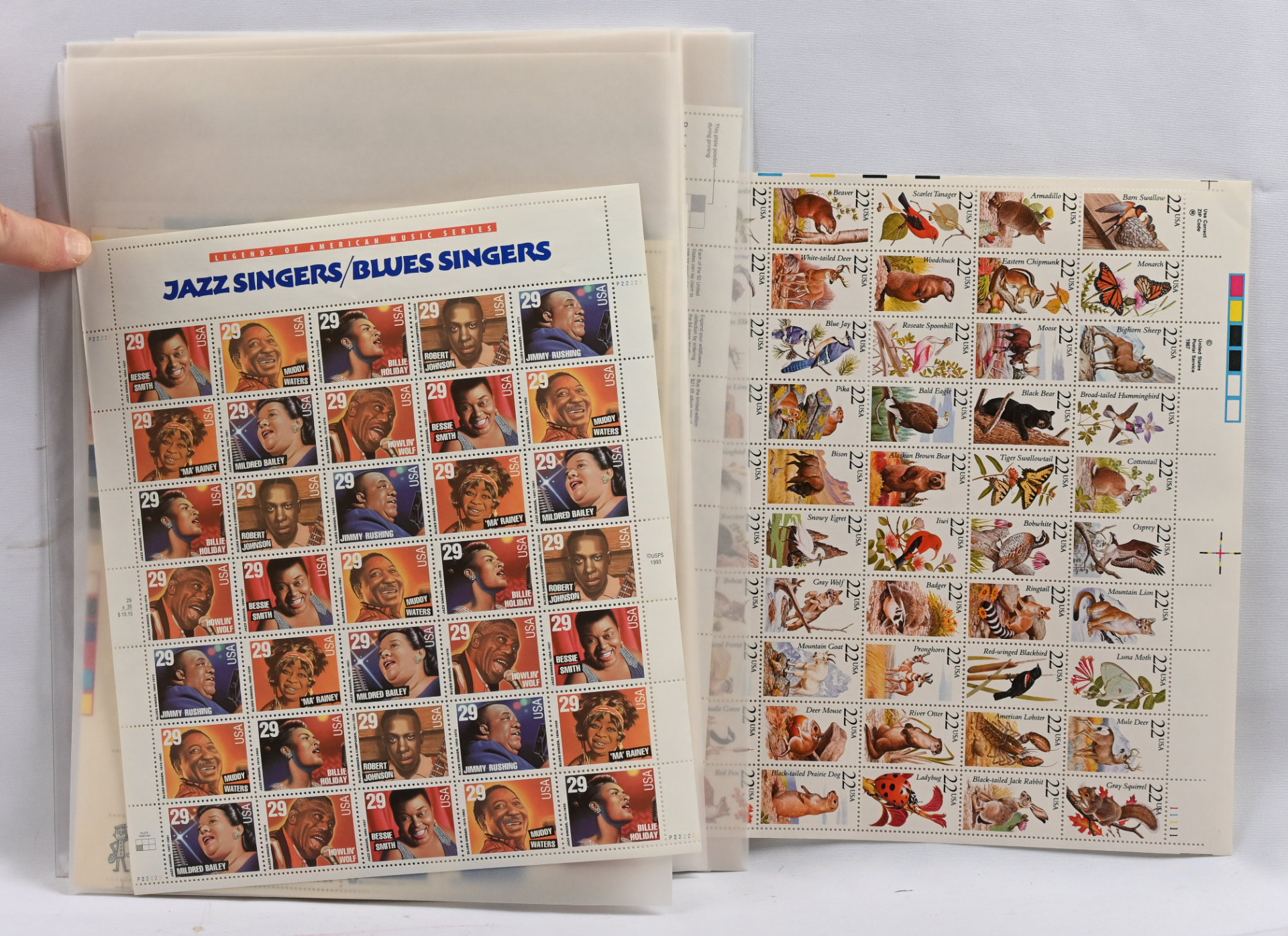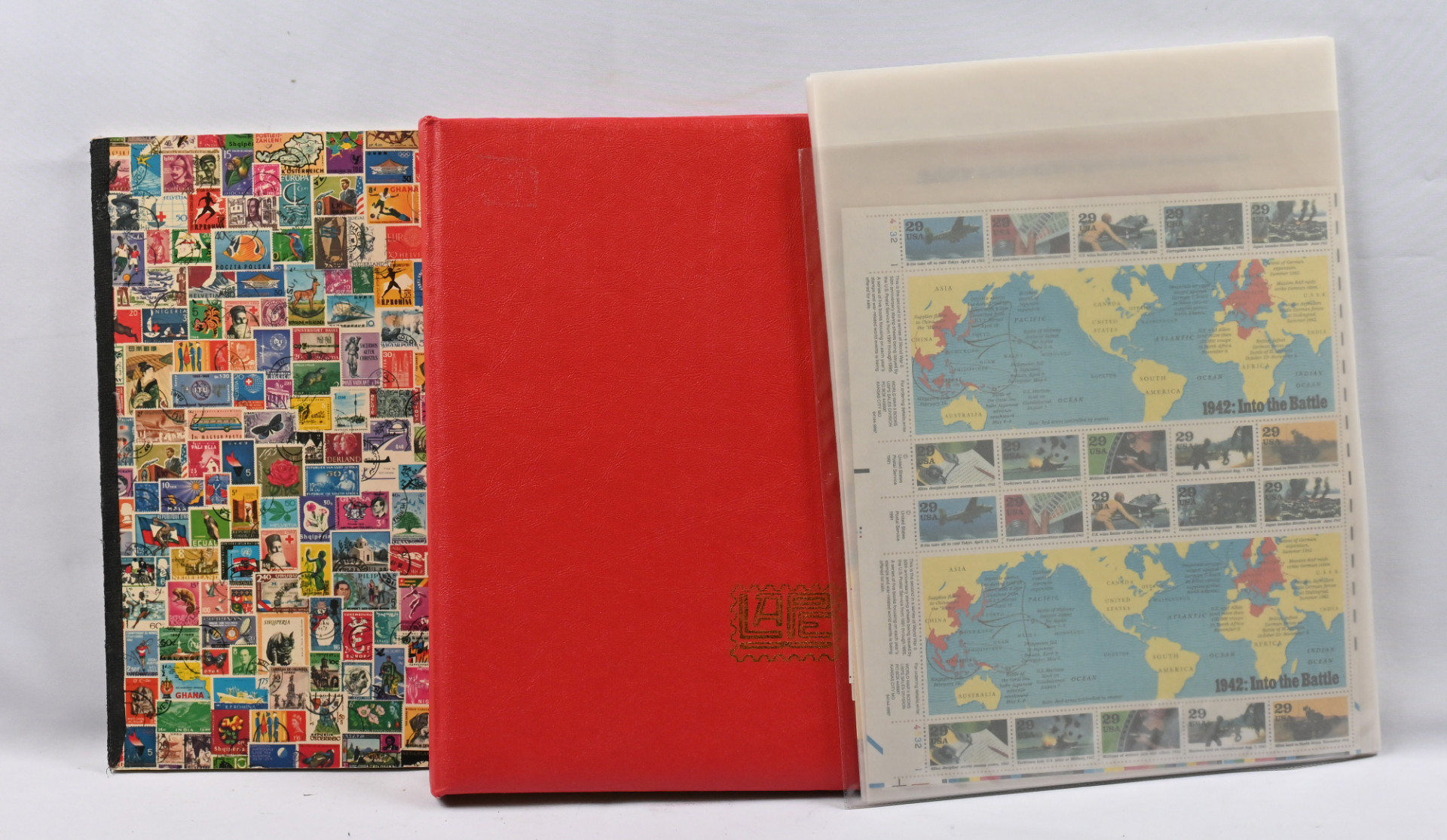 Pienoisarkkeja ym. yli 100 kappaletta kahdessa säiliökirjassa, lisäksi USA:n isokokoisia arkkeja 17 kappaletta. Monia värikkäitä aihejulkaisuja