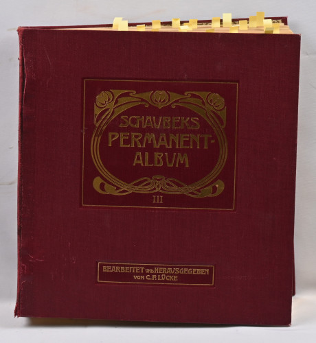 Schaubekin vanha Permanent-albumi Afrikan ja Australian maiden merkeille, kansiossa paikat merkeille vuoteen 1924 asti. Runsas materiaali sisältäen monipuolisesti materiaalia eri maista ja alueista, siirtomaita, pieniä saarivaltioita, kiehtovia päällepainamia jne. Leimattua ja leimaamatonta materiaalia. Kansio normaalia paremmassa kunnossa, lehdet erittäin hyvässä kunnossa. Korkea luetteloarvo - kiintoisa!