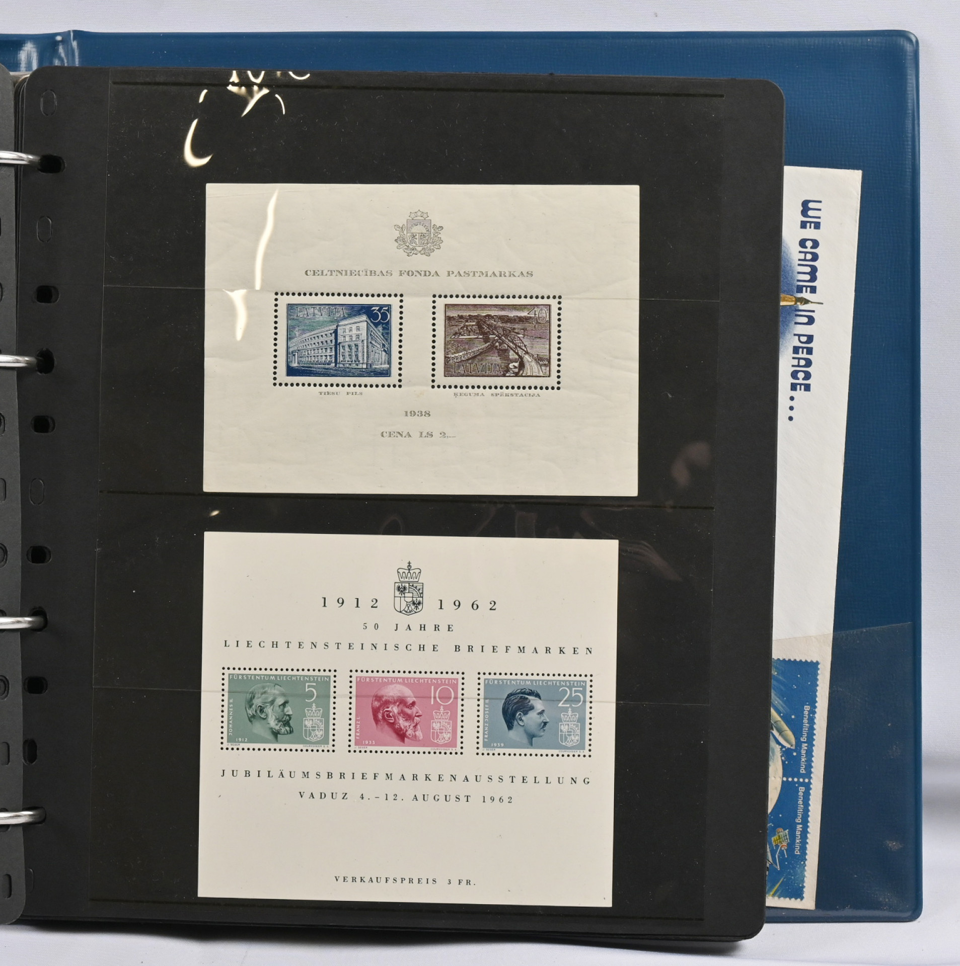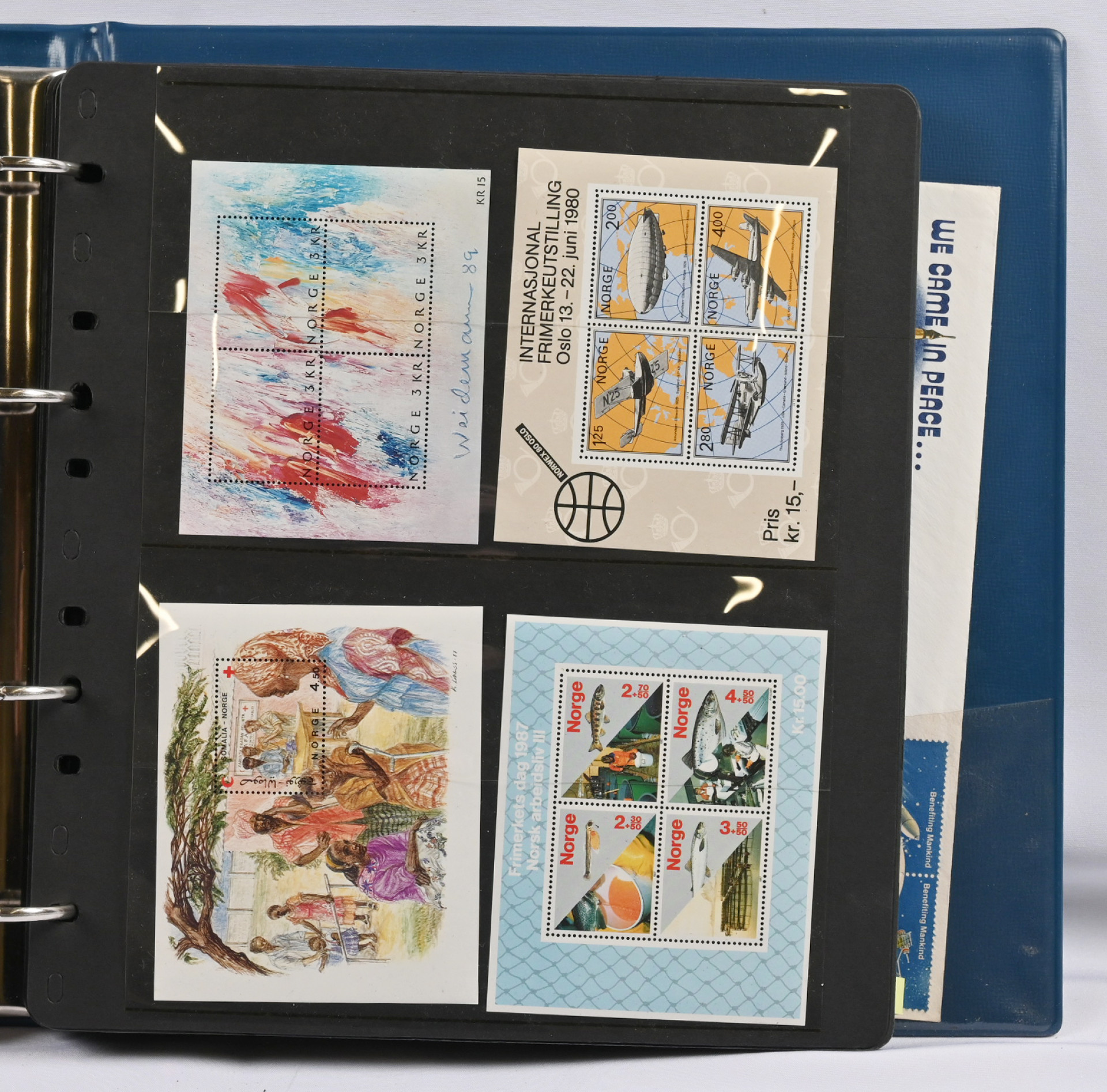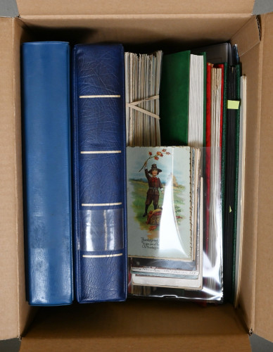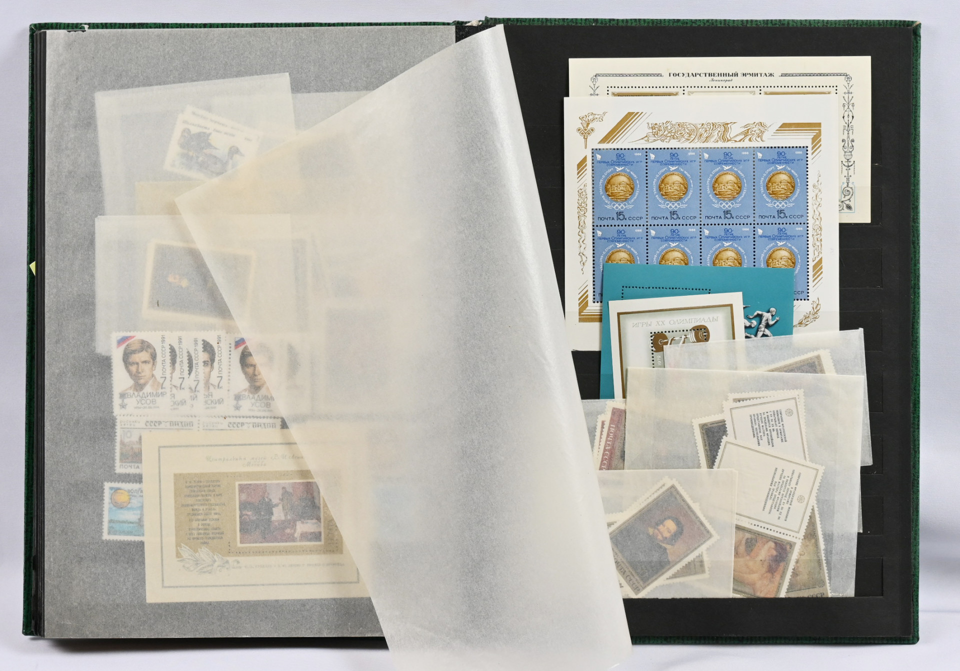 Sekalainen erä ulkomaiden postimerkkejä 3 säiliökirjassa, säilytyslehdillä kansiossa ym. Mm. Pohjoismaita, postituoretta ** Neuvostoliittoa 1980-luvulta, pienoisarkkeja ym. Lisäksi kansio Tanskan / Grönlannin FDC-kuoria sekä pieni laatikko ulkomaisia postikortteja, lähinnä uudempia käyttämättömiä, mutta myös vähän vanhoja ulkomailta Suomeen tulleita.
