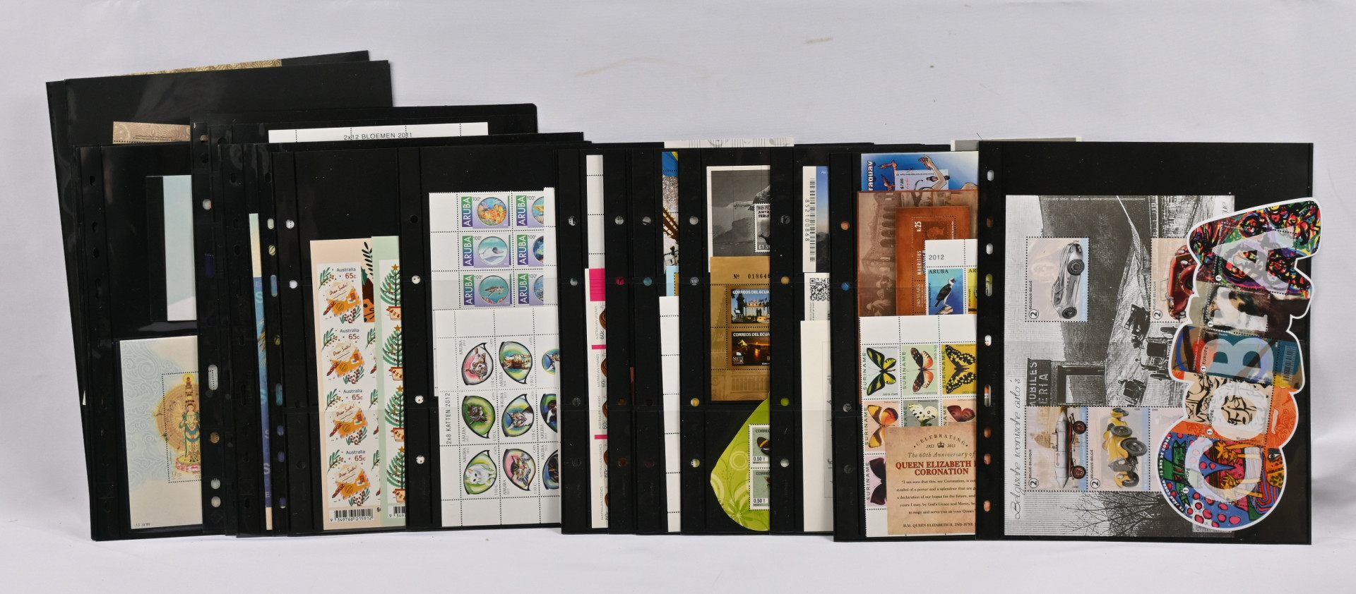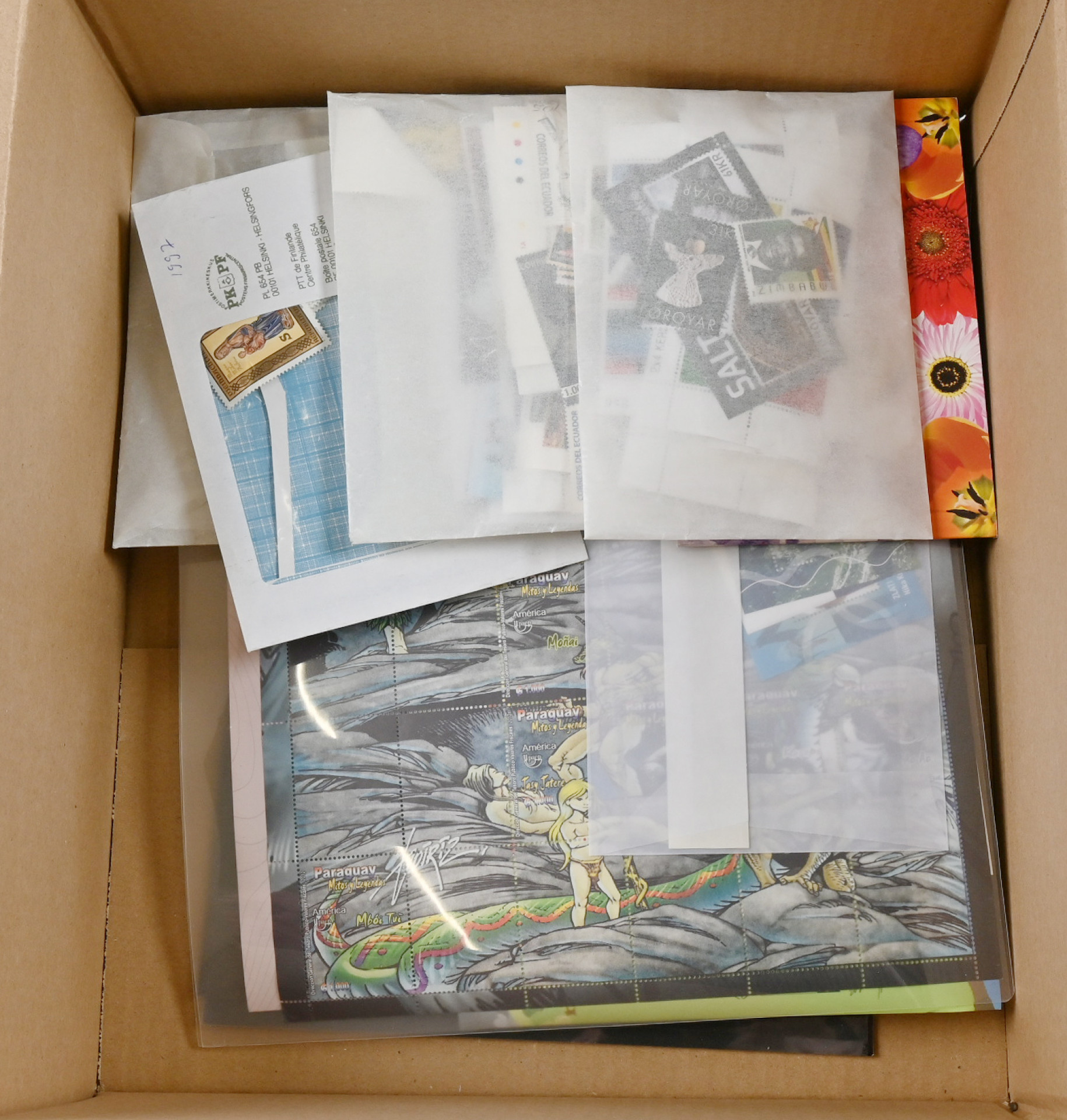 Värikäs moderni erä postituoretta ** materiaalia eri puolilta maailmaa. Runsas aineisto sisältäen merkkejä, sarjoja, ryhmiä, pienoisarkkeja ja vihkoja yi 15 varastosivulla molemmin puolin sekä merkkejä ja sarjoja kolmessa paksussa pergamiinipussissa. Paljon eri aiheita, myös erikoisen muotoisia pienoisarkkeja, erikoisvalmisteisia julkaisuja kuten 3D, kohopainanta jne. Kiintoisa moderni erä - harvoin tarjolla olevaa materiaalia!