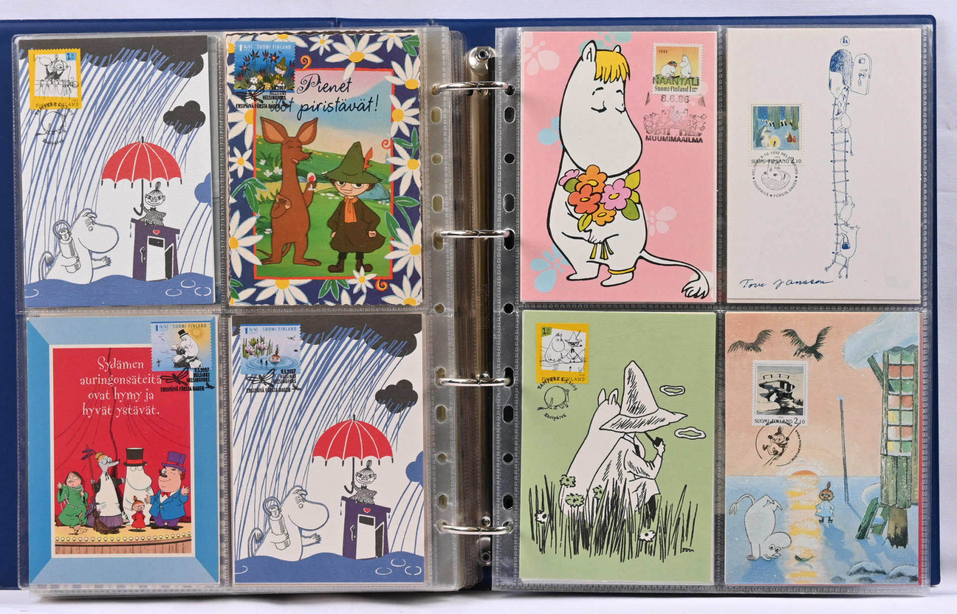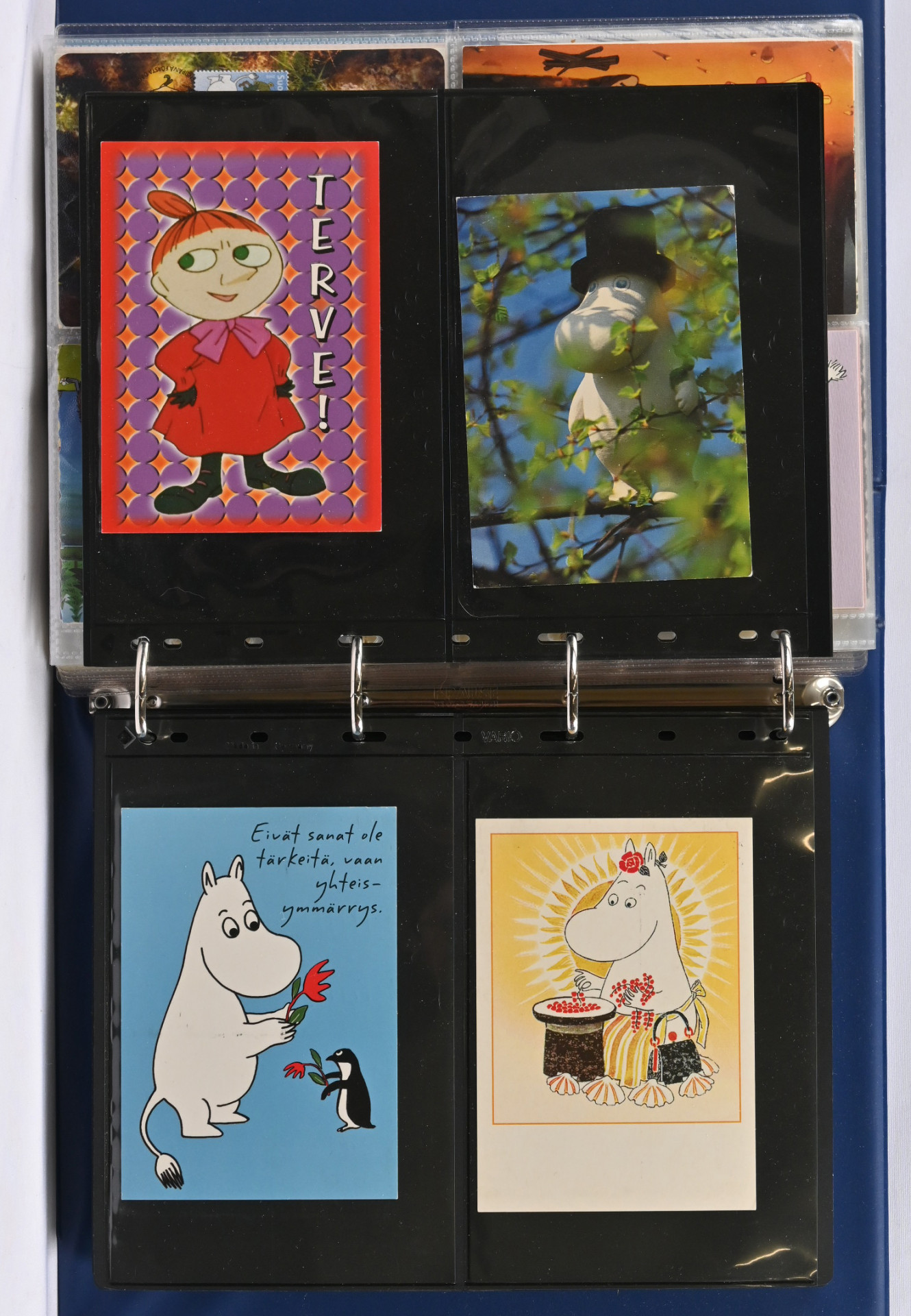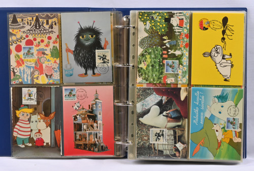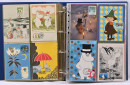 Muumit, kokoelma mapissa sisältäen lähinnä maksikortteja, myös postikortteja, keräilykortteja ym. Yht. yli 200 kohdetta