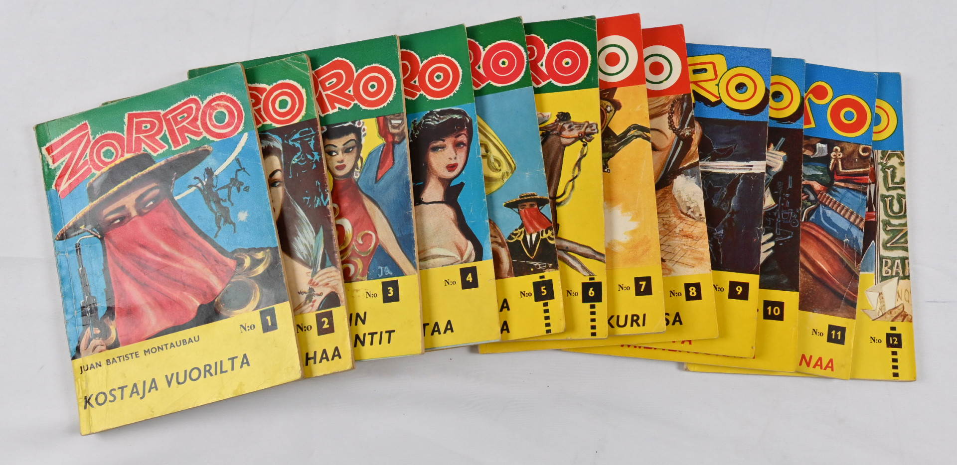 Zorro-lehtiä hieno kokoelma 146 kappaletta 1957 - 1971. Numeroista 1 - 151 puuttuu vain viisi kappaletta (n:o 65 - 69). Normaali luettu laatu. Lisäksi neljä Olli Teerimäki ja kaksi Valkoinen kirppu -lehteä