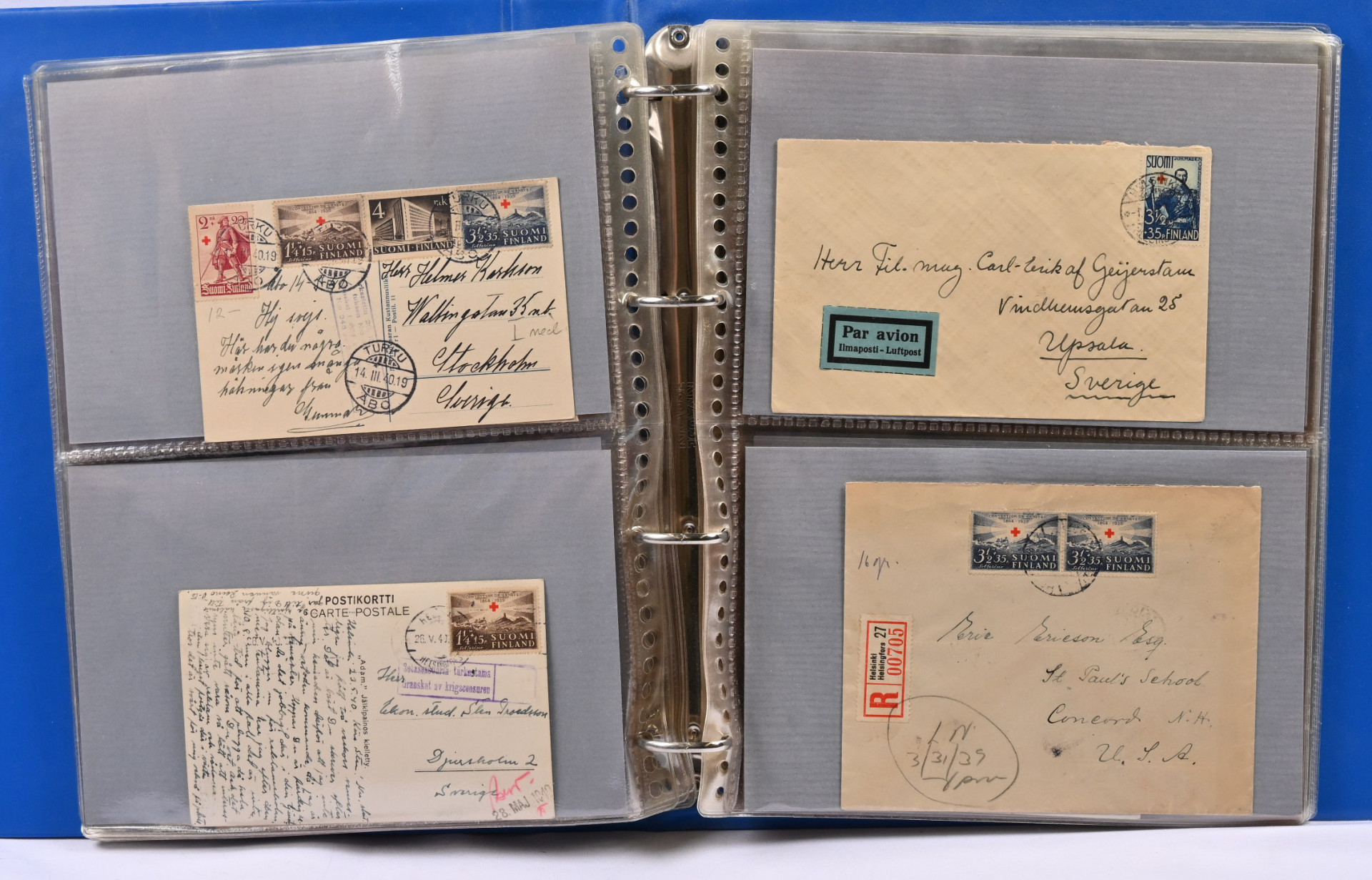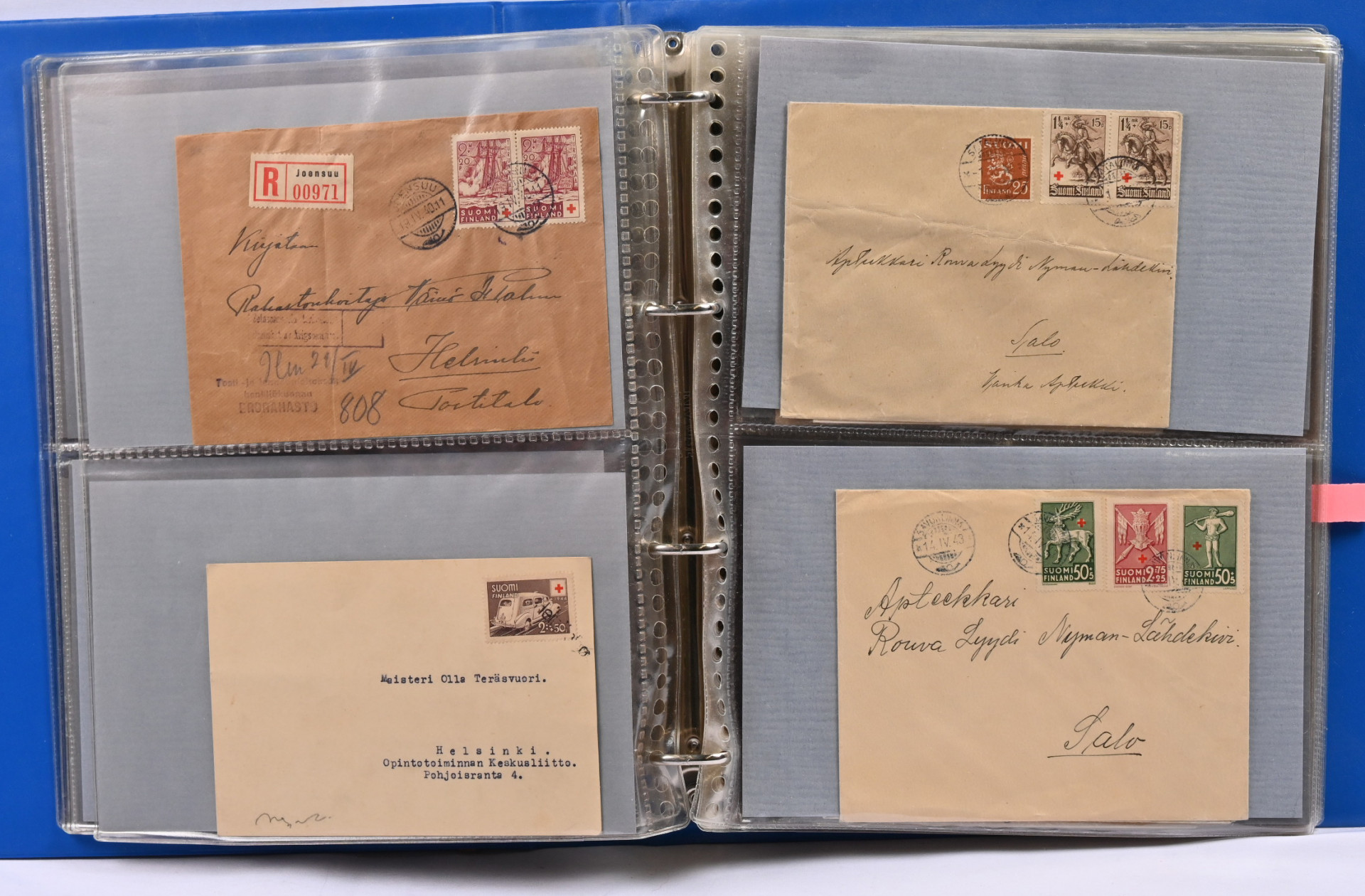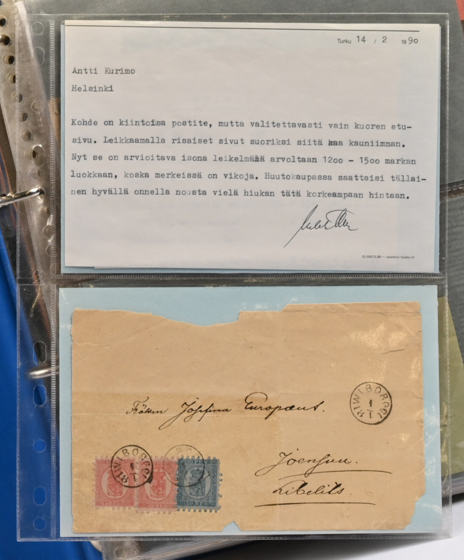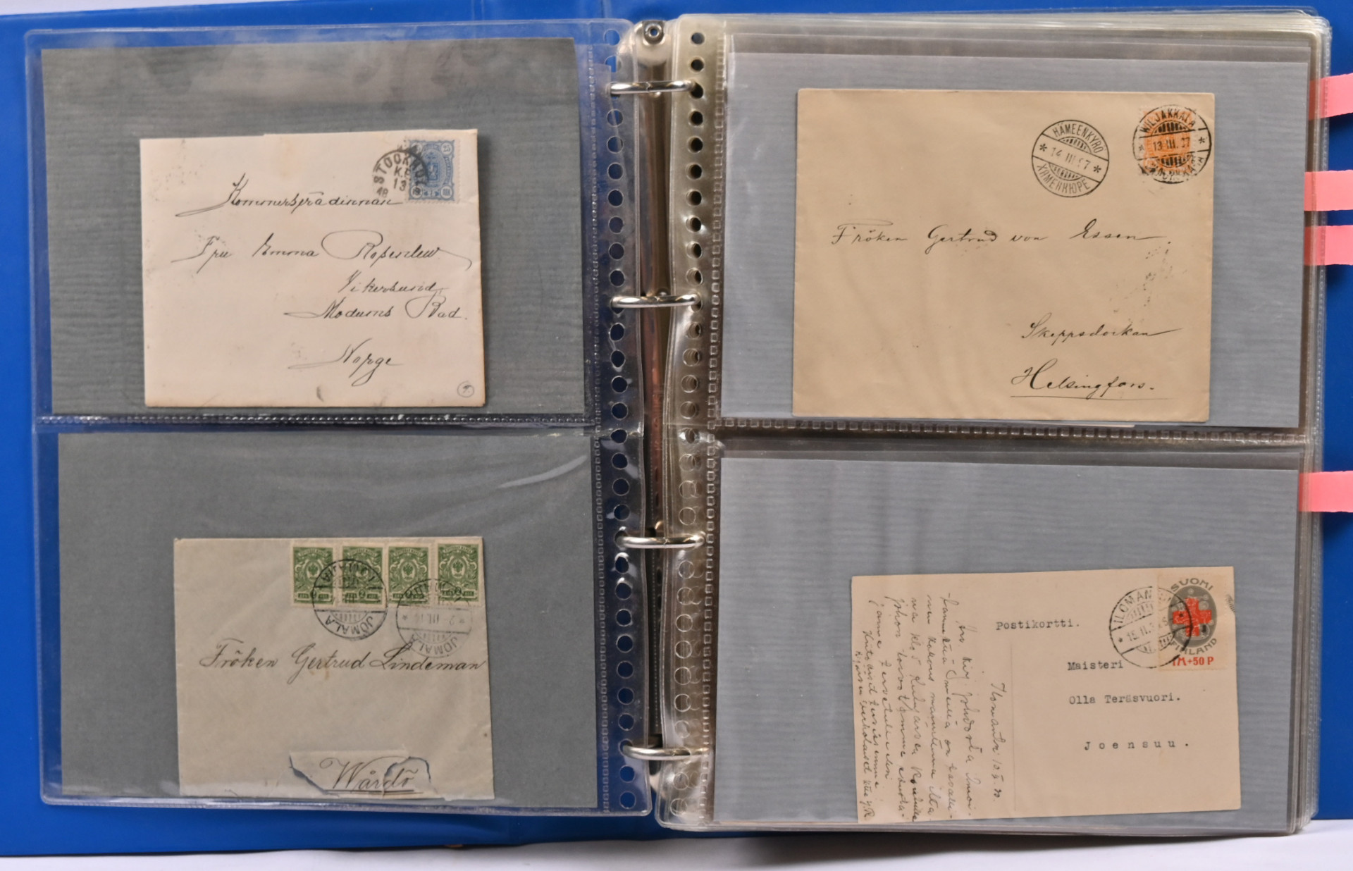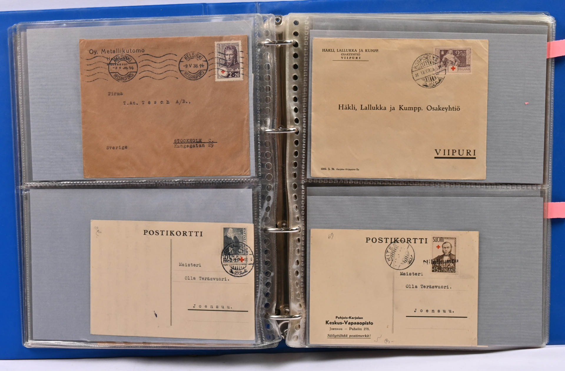 1866 alkaen pieni erä lähetyksiä kansiossa. Lähinnä punaristimerkkien lähetyksiä 1922 - 1949, pp-leimoja, ulkomaille mennyttä postia jne. Lisäksi mm. isohampaiskuoren etusivu 1 markan taksalla (vikoja) ja 1889 25 penniä kuorella Norjaan.