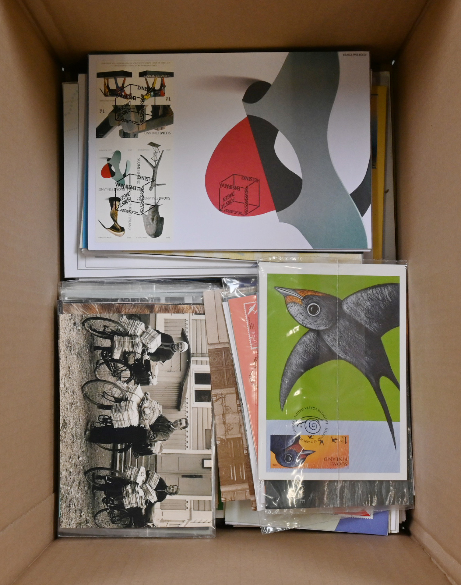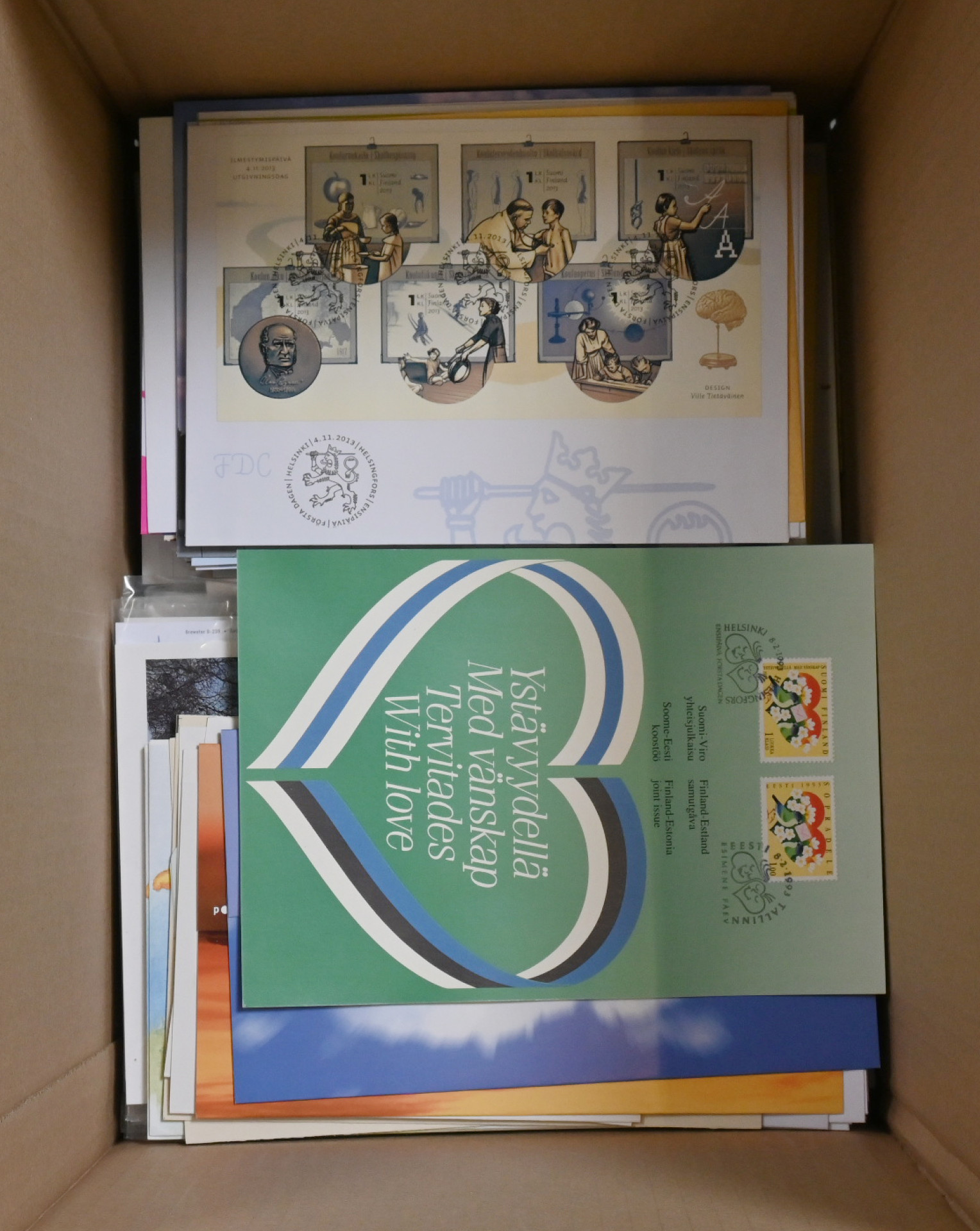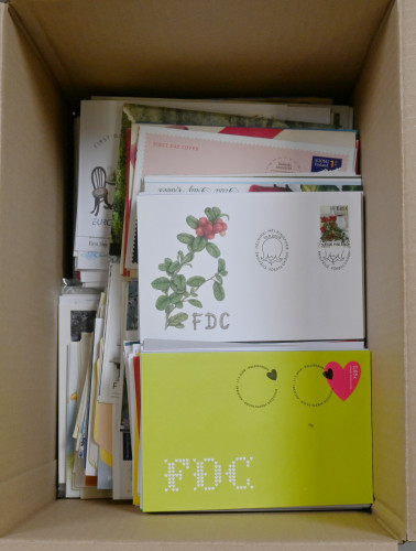 1990-luvulta n. vuoteen 2014 iso erä FDC-kuoria, maksikortteja ym. n. 5 KG laatikossa. Pääosin FDC-kuoria