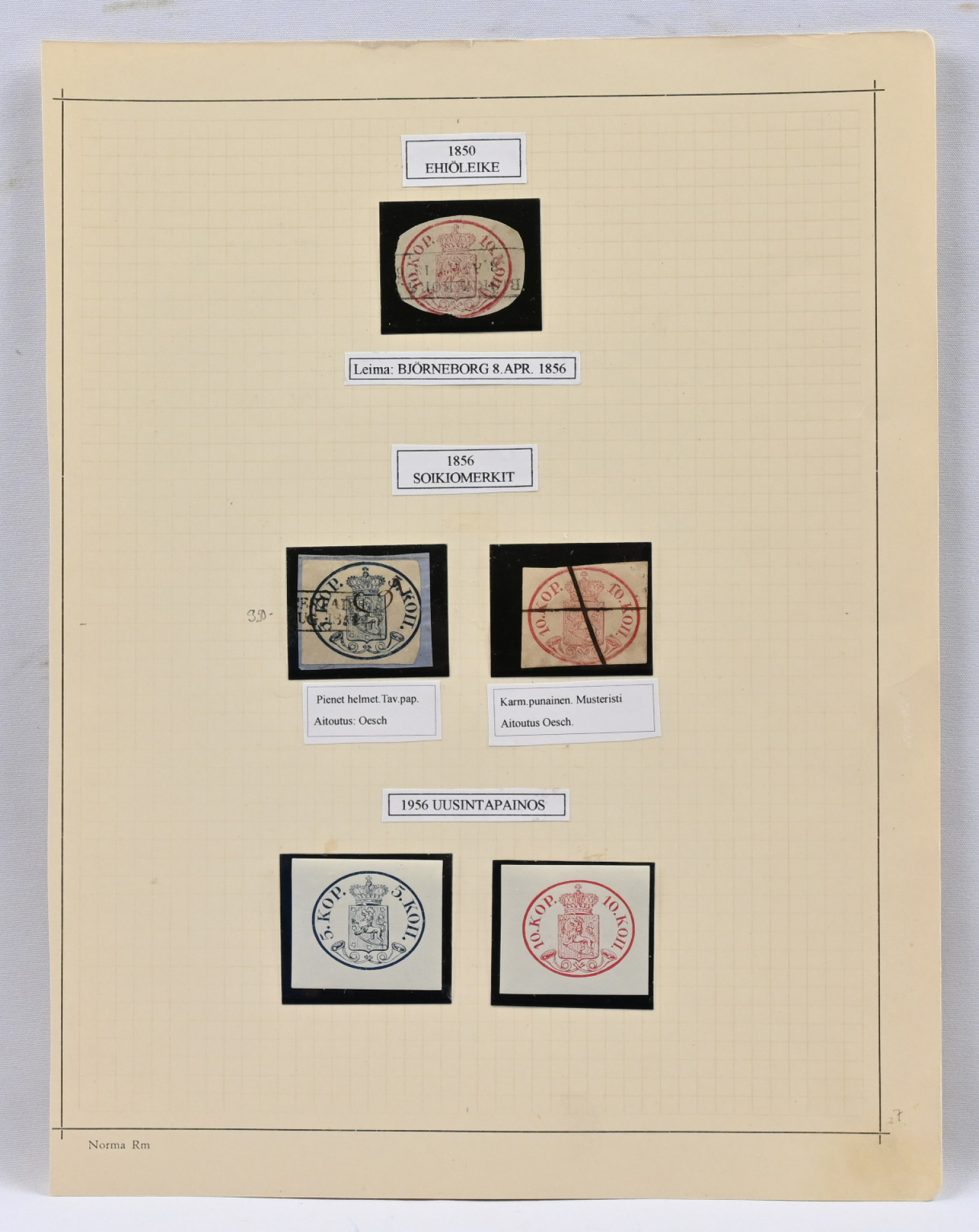 1856 - 1956 hieno erä, jossa mm. 5 kop pienet helmet leikkeellä Brahestad 1856 -leimalla ym. Aitoutukset: Oesch (1998 - 2002)
