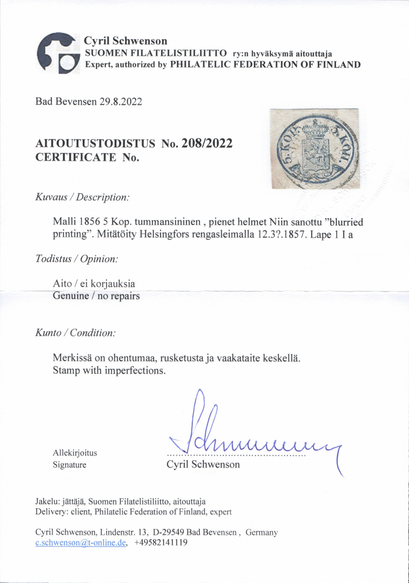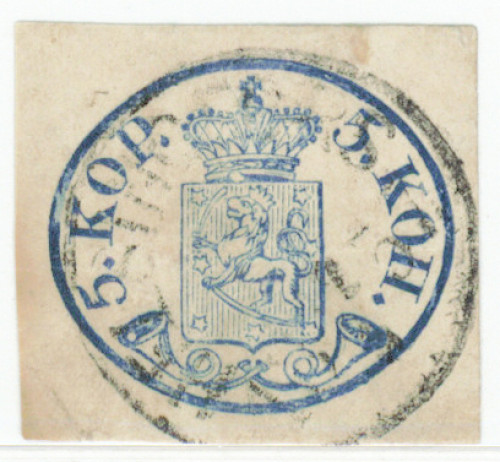 5 kop pienet helmet, tummansininen (ns. blurried printing), leveät reunat, siisti Helsingfors 1857. Ohentumaa, rusketusta ja vaakataite. (L. 1 Ia) Aitoutus: Schwenson (2022)