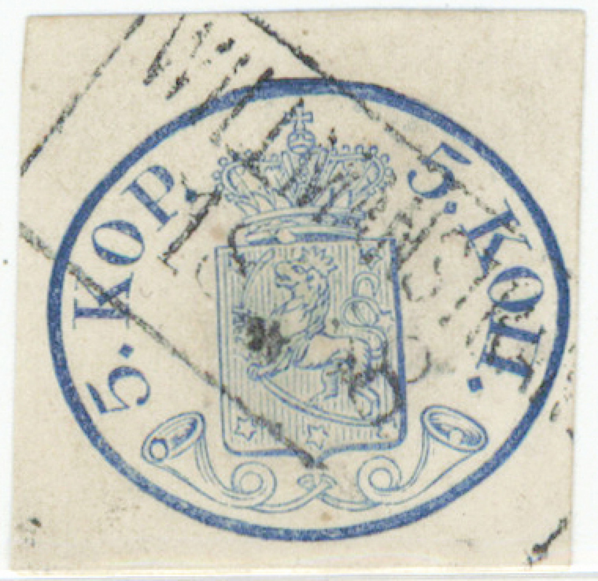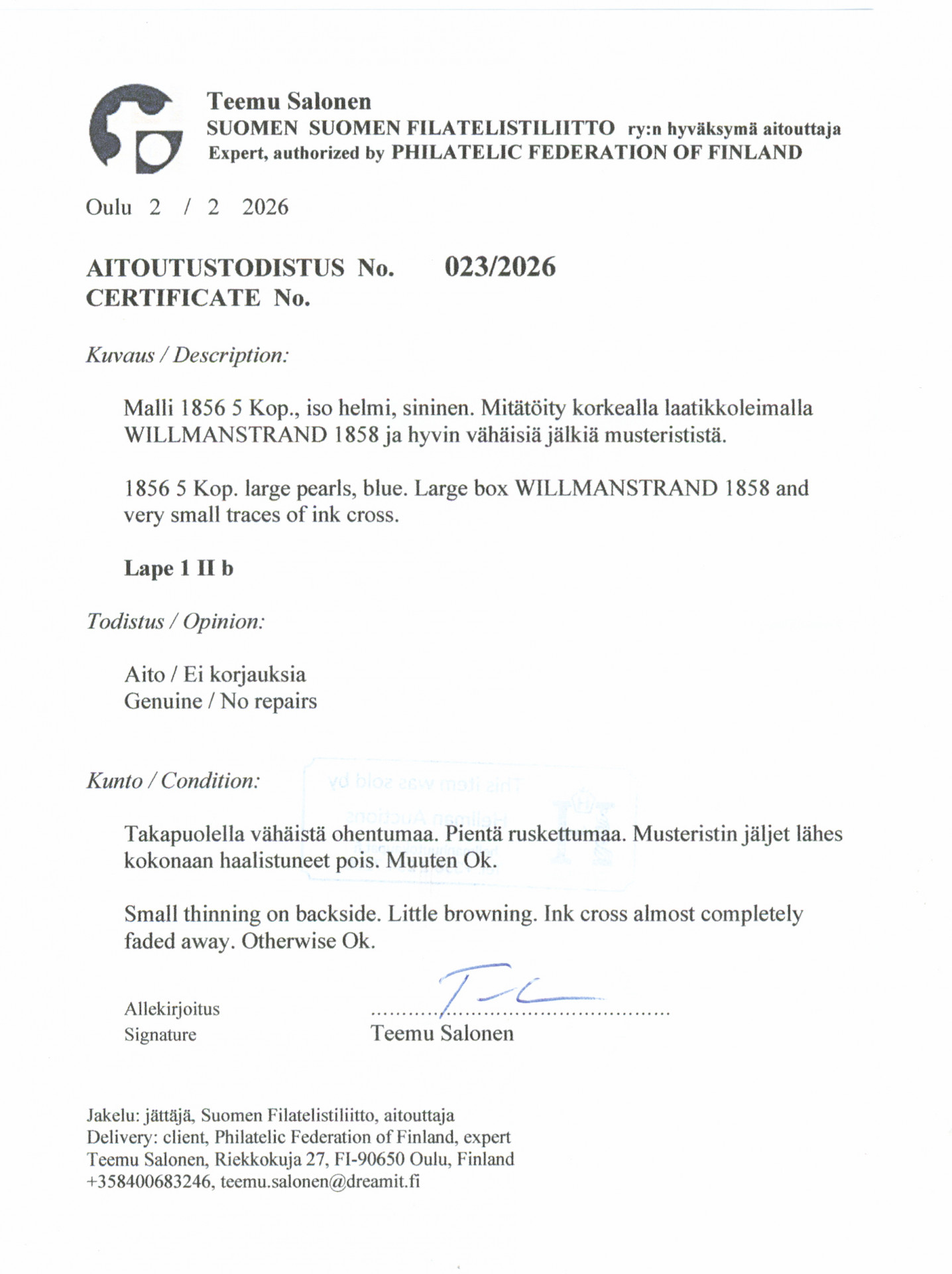 5 kop isot helmet, sininen, kolmelta sivulta leveät reunat, hieno Willmanstrand 1858 ja haalistunut musteristi. Tavanomaista pientä ohentumaa ja ruskettumaa. Hieno merkki! (L. 1 IIb) Aitoutus: Salonen (2026)