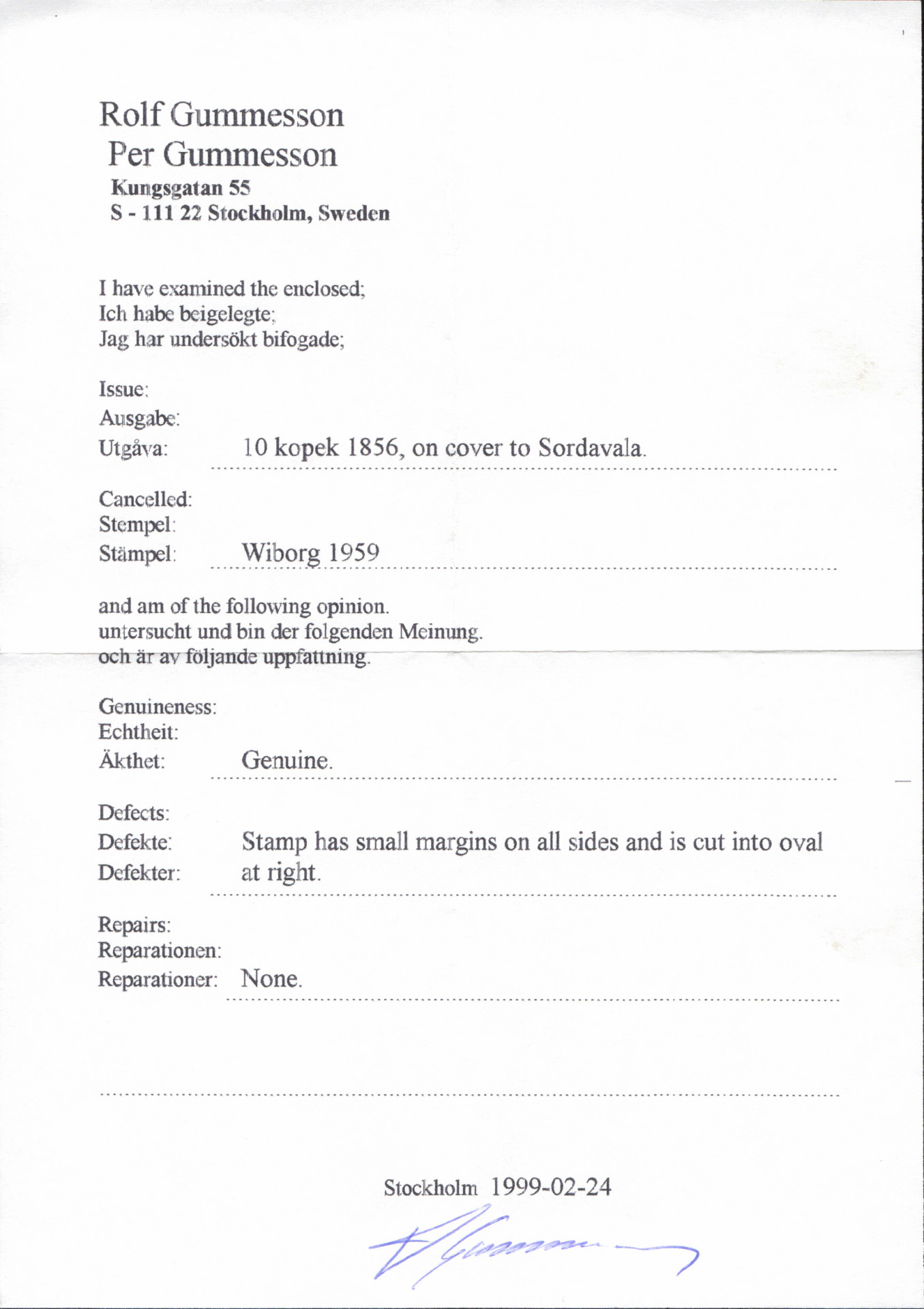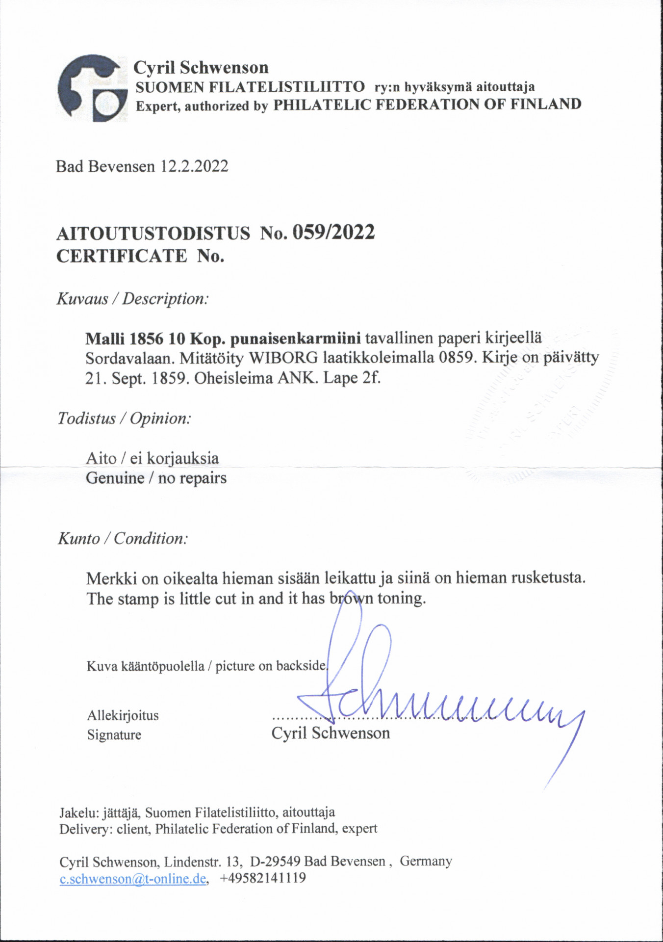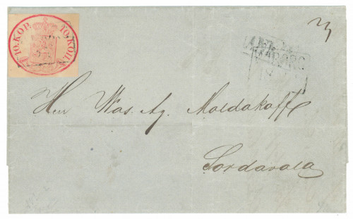 10 kop punaisenkarmiini, niukkareunainen, kirjeellä Wiborg 1859 Sortavalaan, Ank -leima. Merkki hieman sisään leikattu ja aavistus ruskettumaa. (L 2 f) Aitoutus: Schwenson (2022)