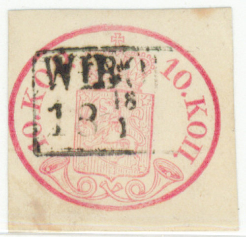 10 kop punaisenkarmiini, yhdeltä sivulta niukka muuten hyvä reunat, kaunis Wiborg -leima. Häivähdys pientä ruskettumaa. (l. 2 f) Aitoutus: Schwenson (2019)
