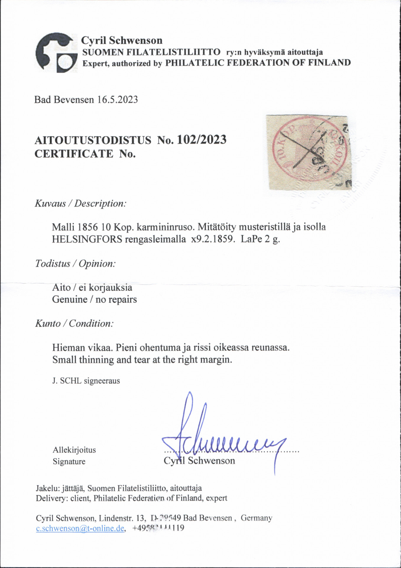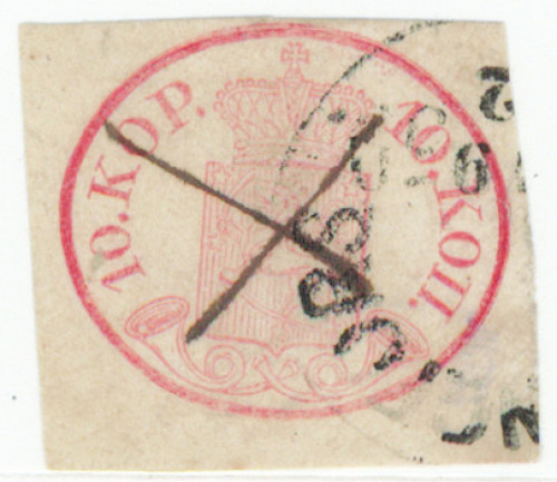 10 kop karmiininruso, kolmelta sivulta hyvät reunat, kaunis Helsingfors ja musteristi. Hieman vikaa. (L. 2 g) Aitoutus: Schwenson (2023)