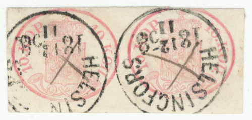 10 kop karmiiniruso, harvinainen pari, kolmelta sivulta hyvät reunat, erittäin kaunis Helsingfors 1858 ja musteristit. Ylhäällä hieman sisäänleikattu ja takana vanhaa paperia ja ajan patinaa. (L. 2 g) Aitoutus: Schwenson (2018)
