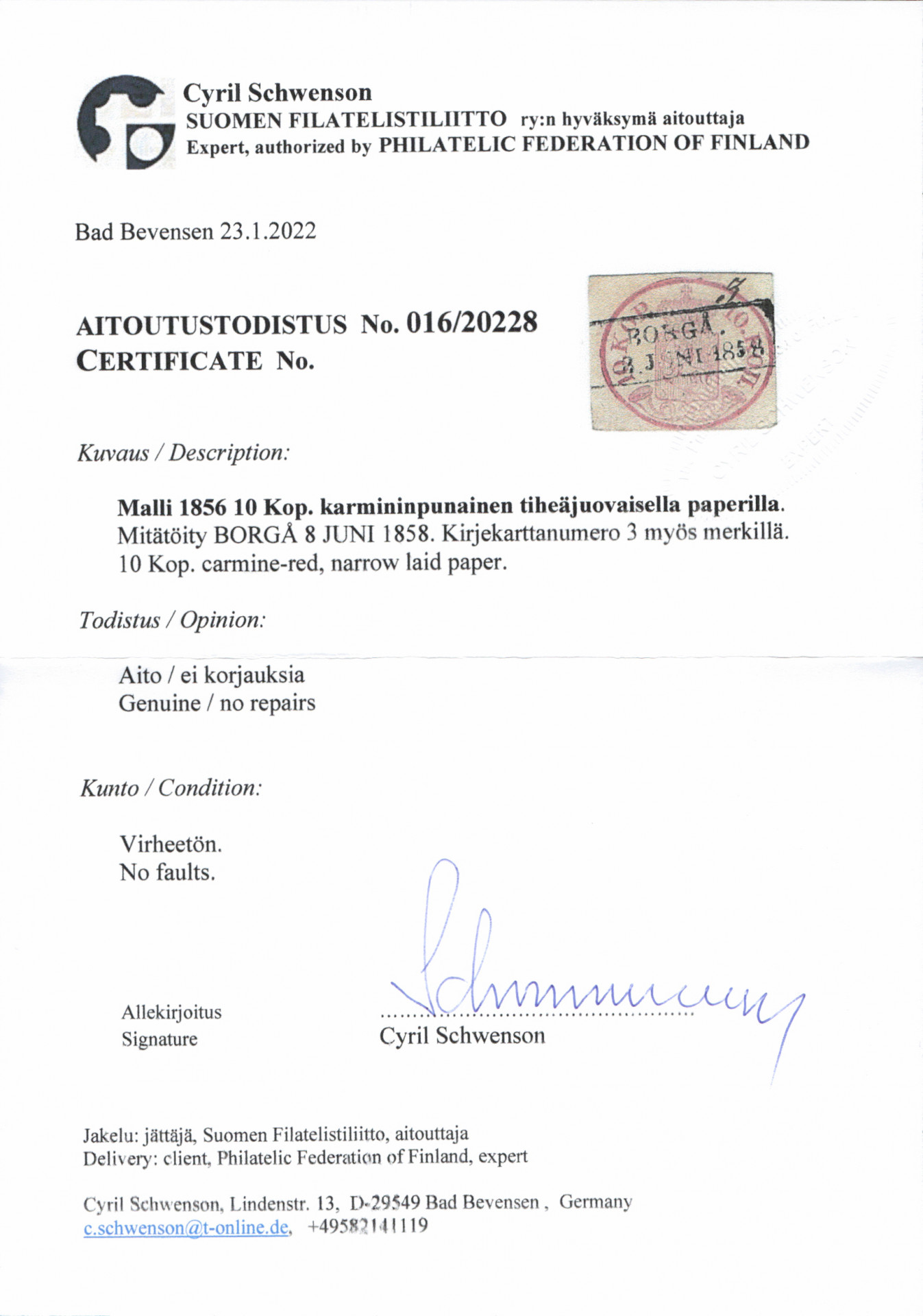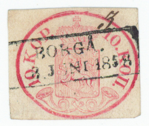 Tiheäjuovainen paperi 10 kop niukkareunainen, lähes loisto Borgå 1858 ja kartteerausnumero. Hieno merkki! Aitoutus: Schwenson (2022)