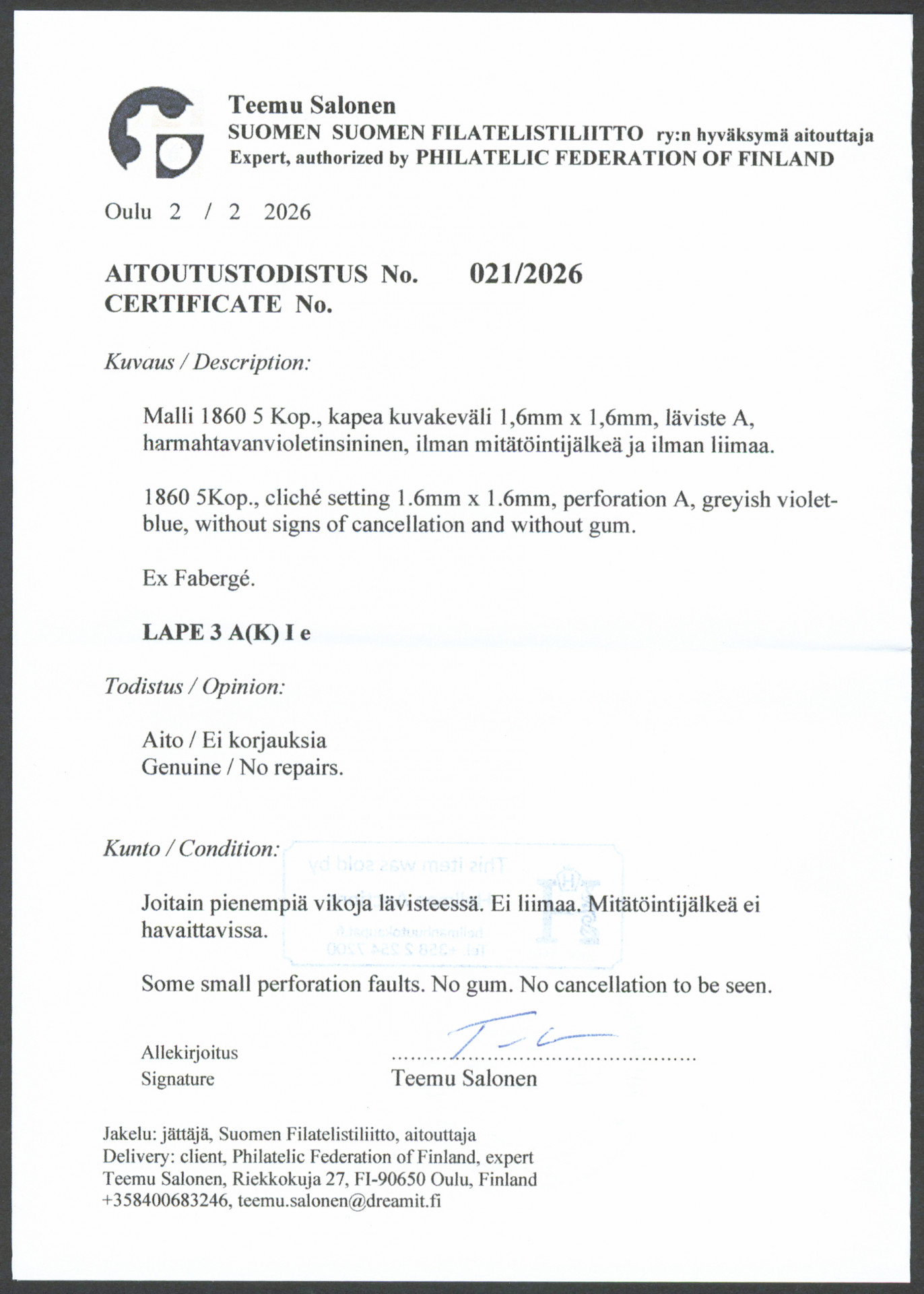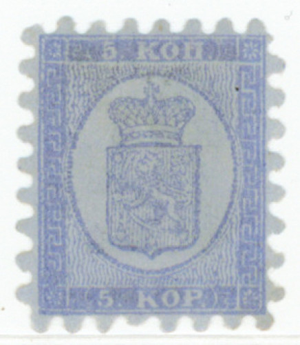 5 kop I harmaanvioletinsininen, kuvakeväli 1,6 x 1,6 mm, käyttämätön (*) ilman liimaa. Mitätöntä pientä vikaa lävisteessä. Ex Fabergé (L. 3 Ie) Aitoutus: Salonen (2026)