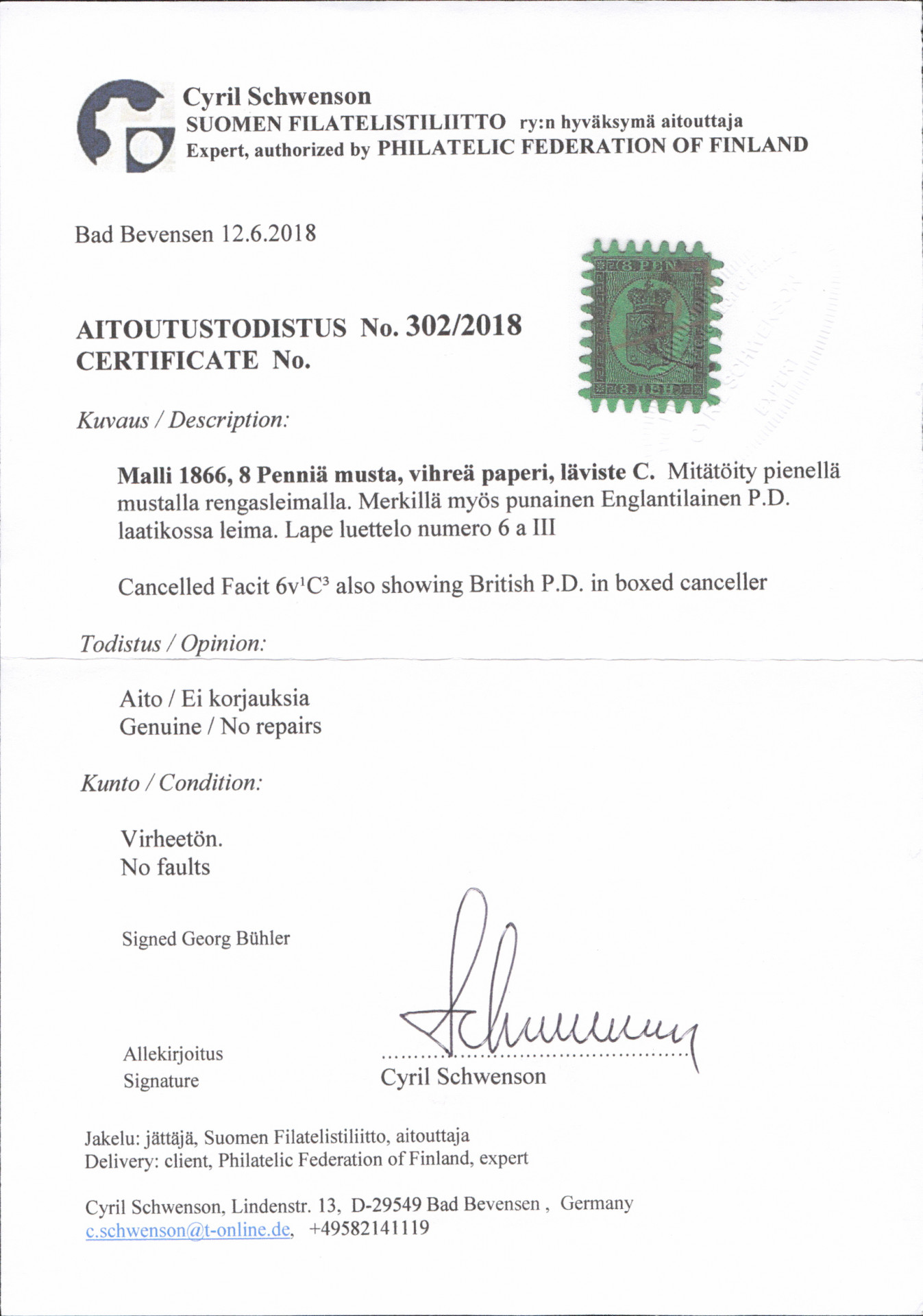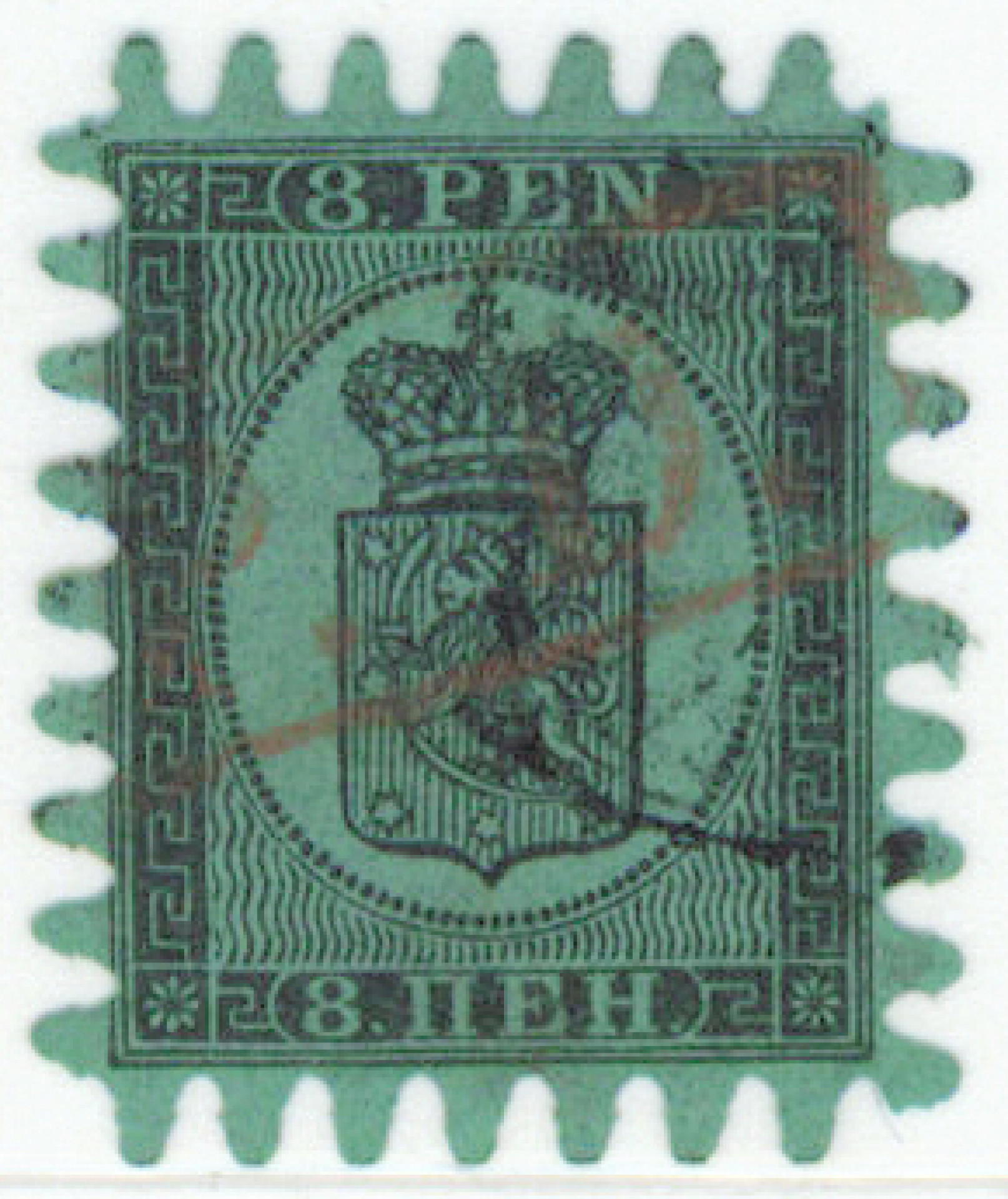 8 penniä III. Virheetön leimattu merkki, jossa suomalaisen leiman lisäksi punainen englantilainen ”PD” -leima. Harvinainen (L. 6a III). Takuu Bühler, aitoutus Schwenson (2018)