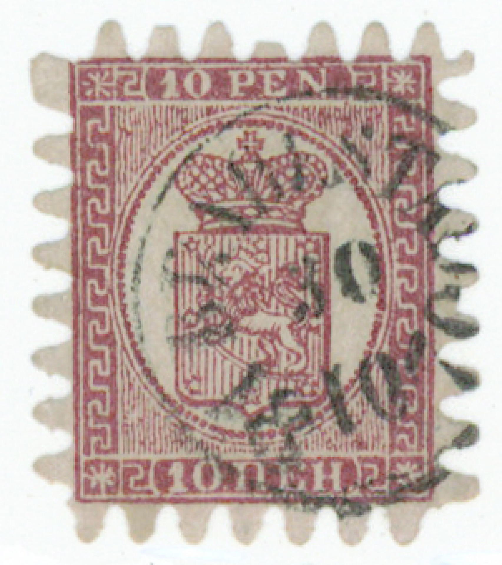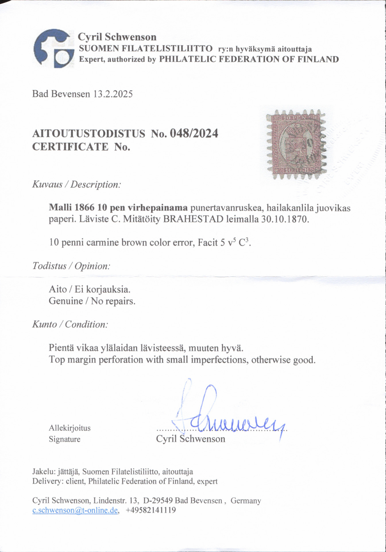 10 penniä harvinainen VÄRIVIRHEPAINAMA, erittäin kaunis Brahestad 1870. Vain pientä vikaa ylälaidassa. Aitoutus: Schwenson (2024)