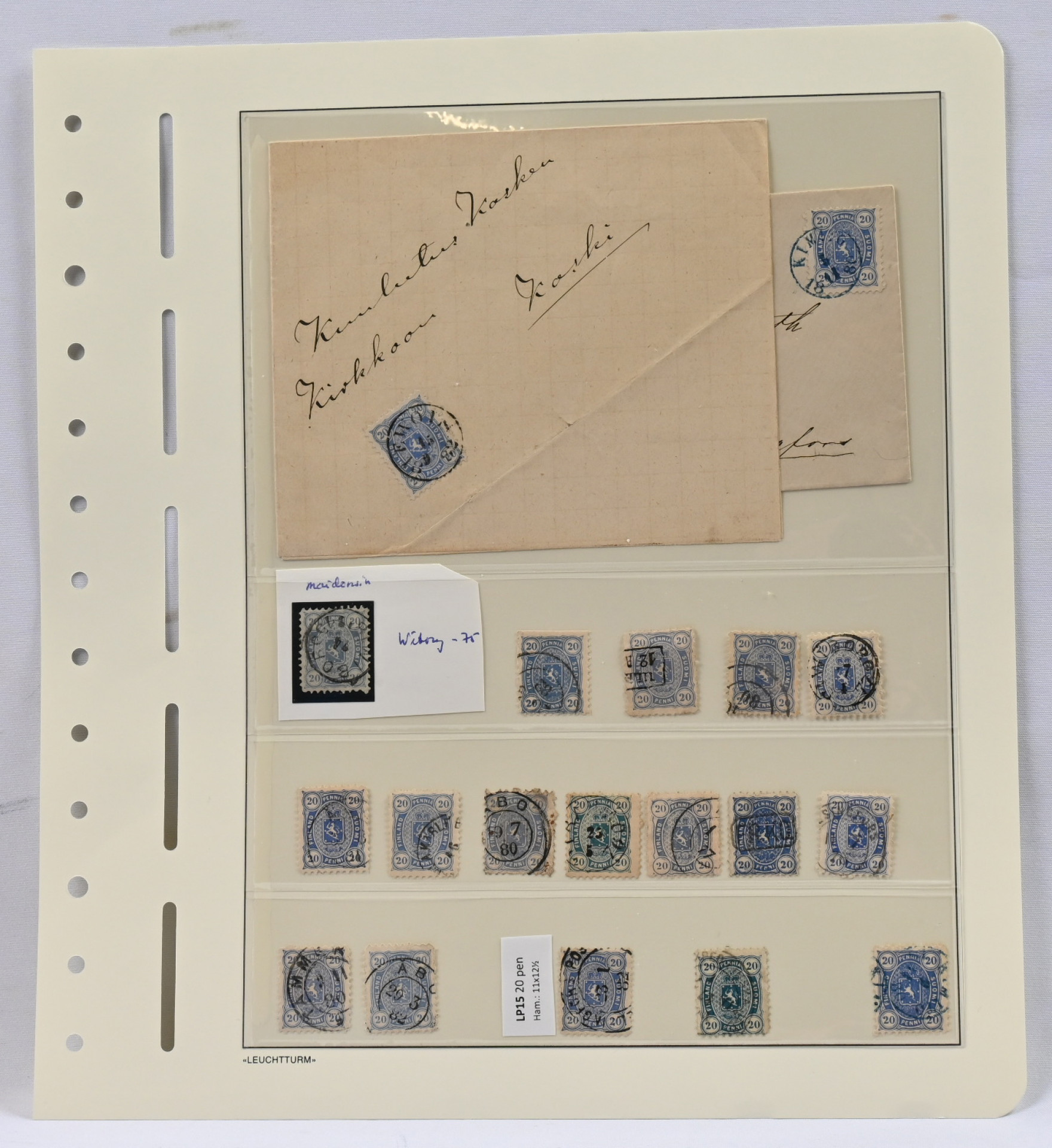 20 penniä 1875-82 hyvä valikoima värejä ym kahdella sivulla myös kolme lähetystä
