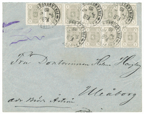 2 penniä vaaleanoliivinharmaa 10 kpl kuorella, erittäin kaunis Helsingfors 1889. Hieman rypppyä kuoressa