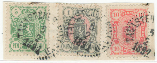 10 penniä sekapostiteleikkeellä m/89 5 penniä ja 1 markan kanssa, erittäin kaunis Tavastehus 1891.