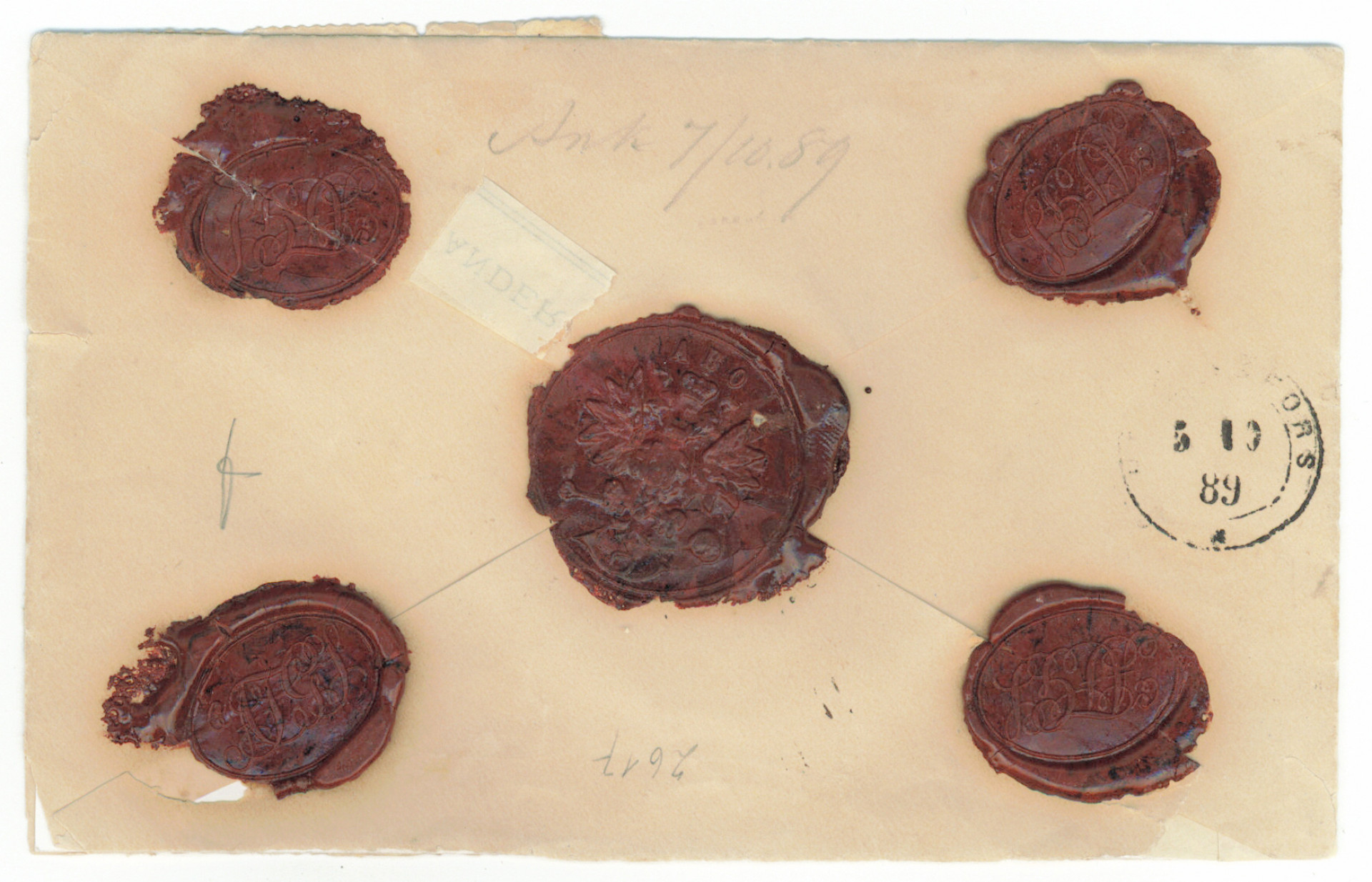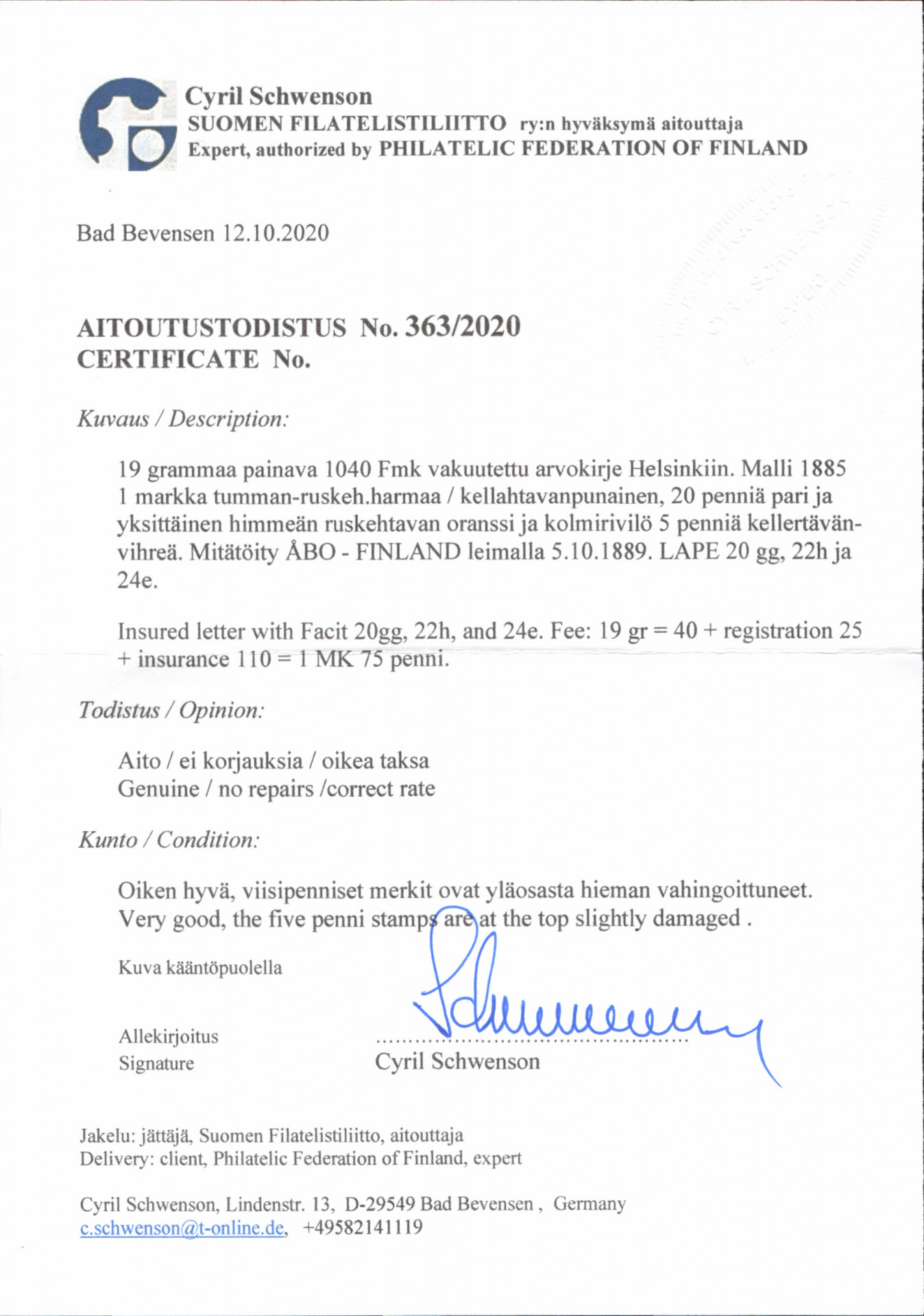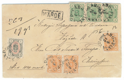 1 markka, 3x 20 penniä ja 3x 5 penniä hienolla pienikokoisella vakuutetulla kuorella. Kaunis Åbo 5.10.1889. Taksa oikein. (L. 20gg, 22h ja 24e). Aitoutus Schwenson (2020). Hieno kokoelmakohde!