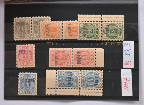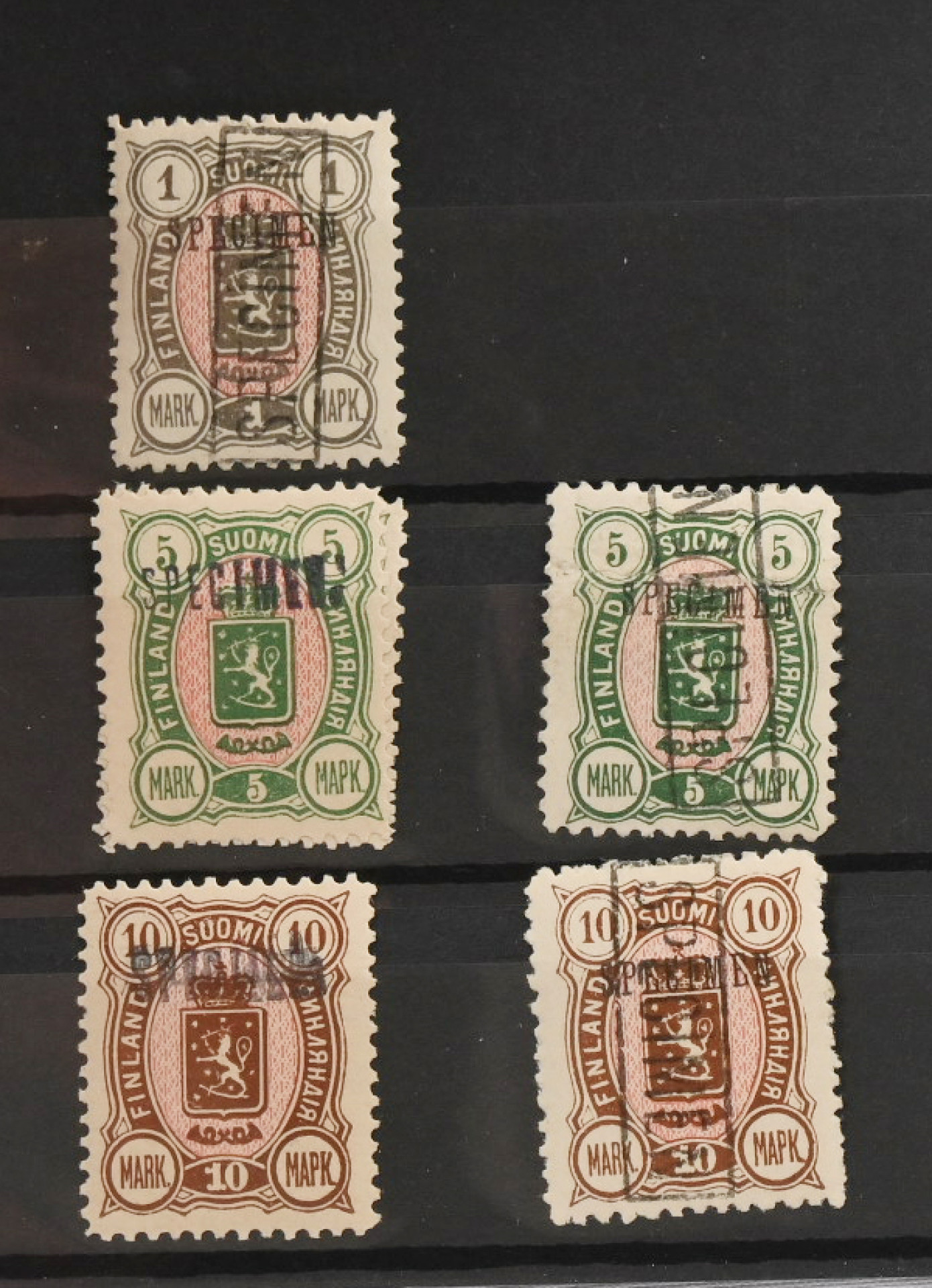 Harvinainen erä Specimen merkkejä leimasimella leimattuja 2 pennistä 10 markkaan yhteensä 17 merkkiä!