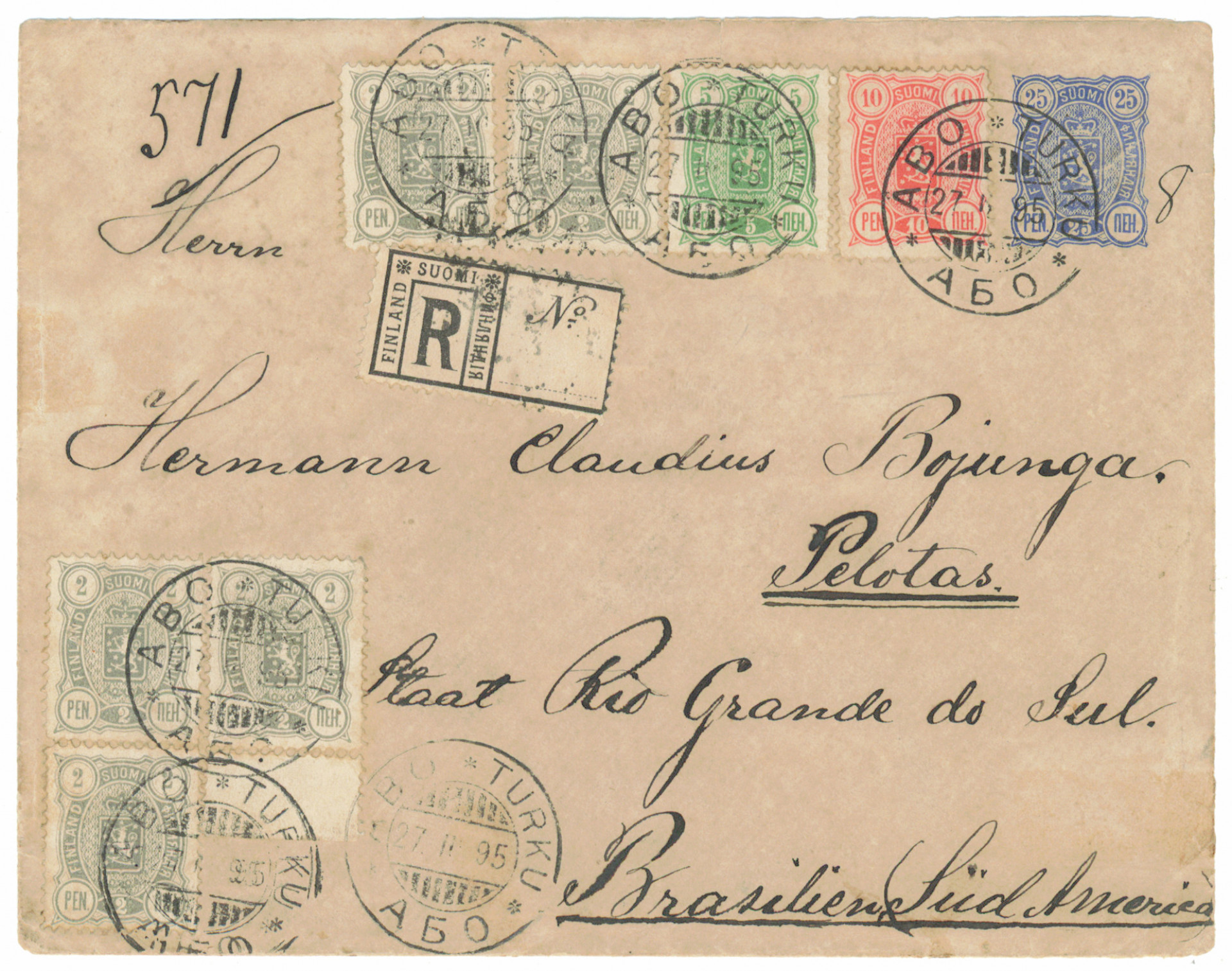 2 penniä viisi kpl, 5 penniä ja 10 penniä A 25 pennin kirjatulla ehiökuorella Brasiliaan! Erittäin kaunis Turku 1895, tuloleima - matkalla yli 2 kuukautta. Ajan patinaa