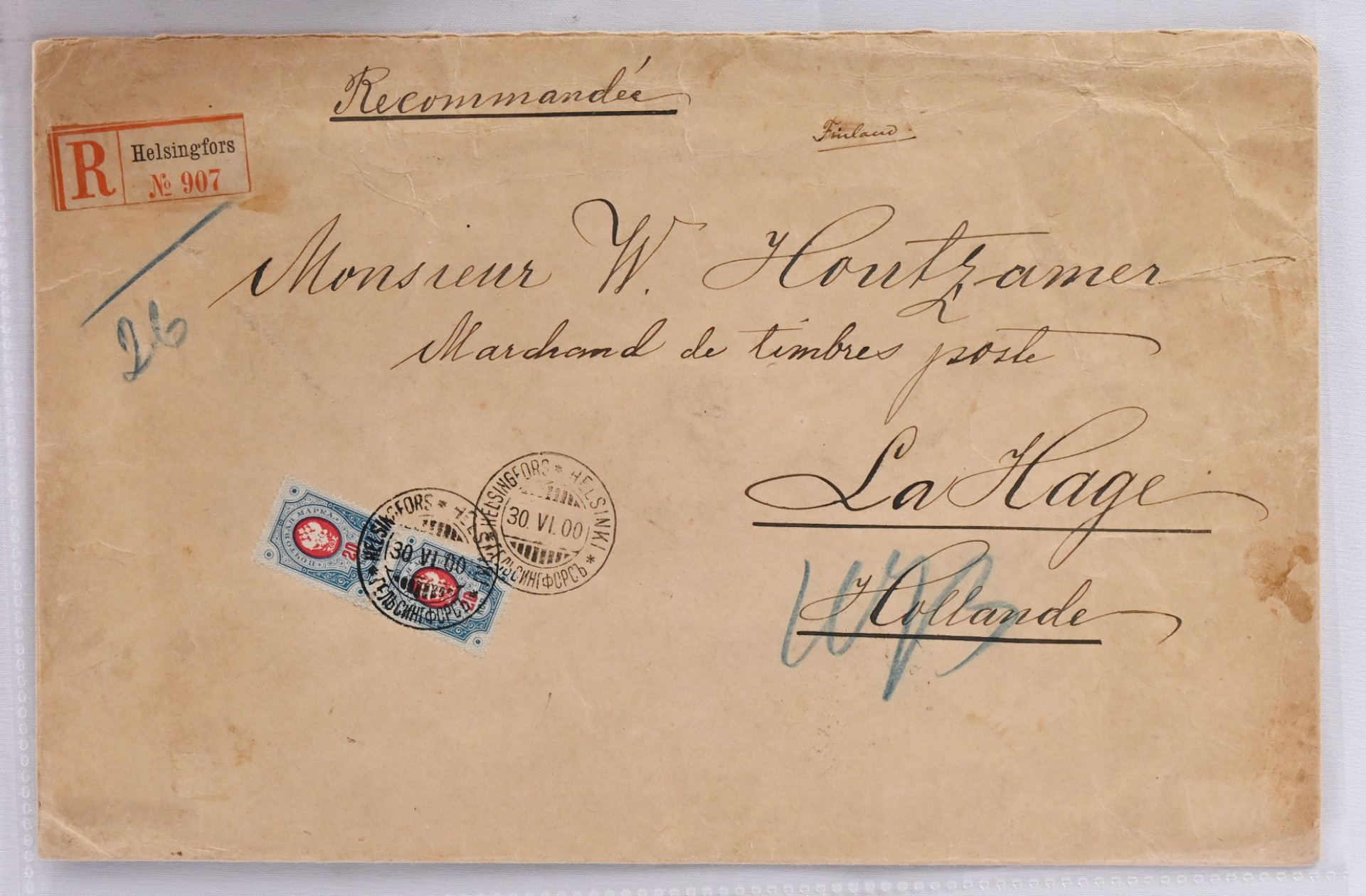 20 kop pystypari kirjatulla kirjeellä Hollantiin, kaunis Helsinki 1900, tuloleimat. Aavistus ajan patinaa ja pientä tavanomaista taittumaa