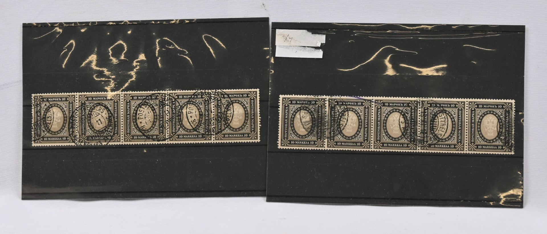 1902 10 markkaa kaksi leimattua viisirivilöä. Toisessa hieman ylimääräistä väriä (L. 60)