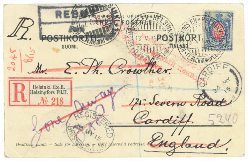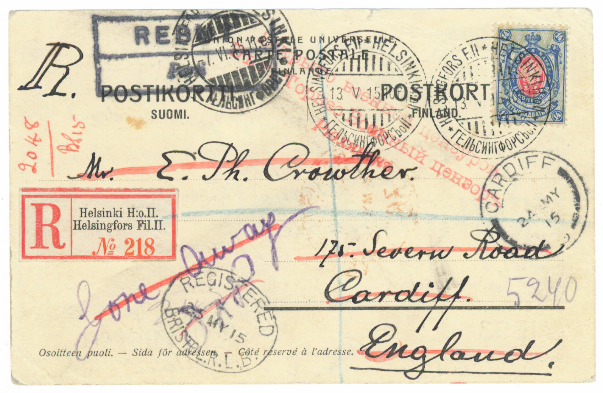 1910 14 kop kirjatulla kortilla Englantiin, kaunis Helsinki 1915. Useita leimoja ja merkintöjä. Hieman ajan patinaa ja taittumaa