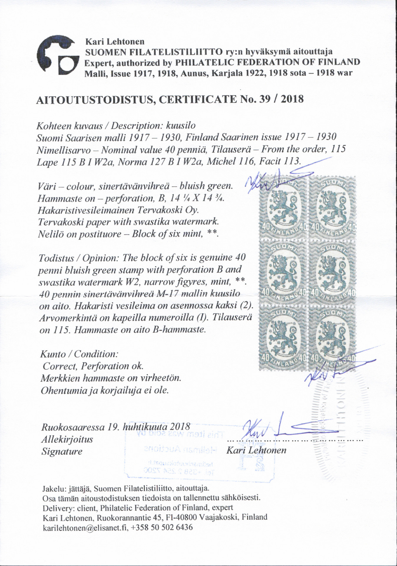 40 penniä BIW2 postituore ** kuusilo tilauserästä 115. Aitoutus Lehtonen (2018) (L. 115 BIW2a)
