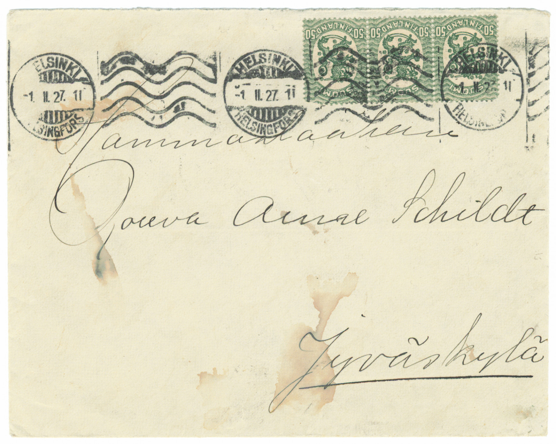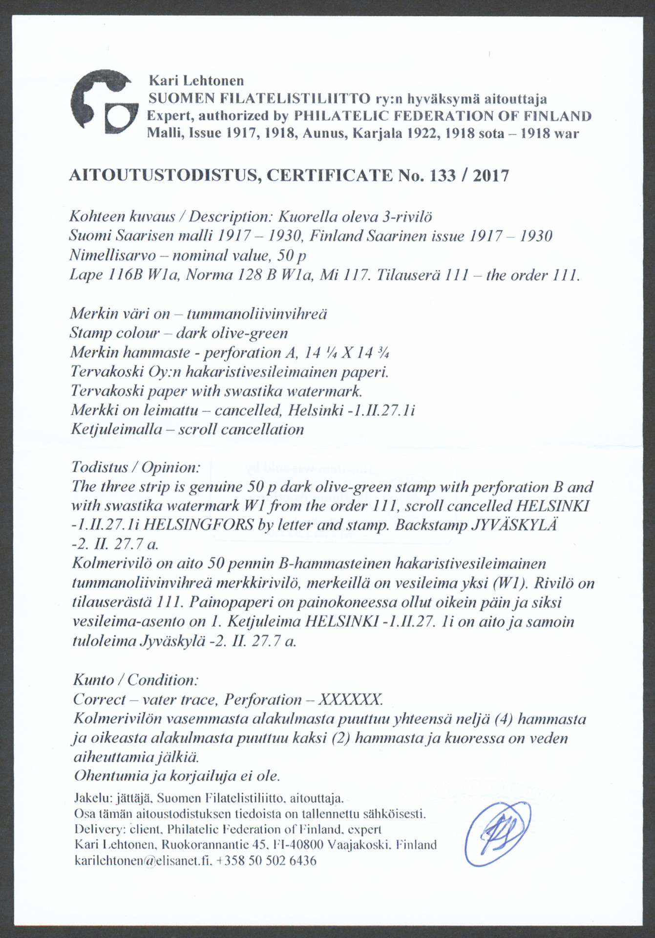 50 penniä BW1a kolmirivilö kuorella. B-hammasteessa harvinainen tummanoliivinvihreä (tilauserä 111). Hammasvikaa ja ajan patinaa. Aitoutus Lehtonen (2017). (L. 116 BW1a) .