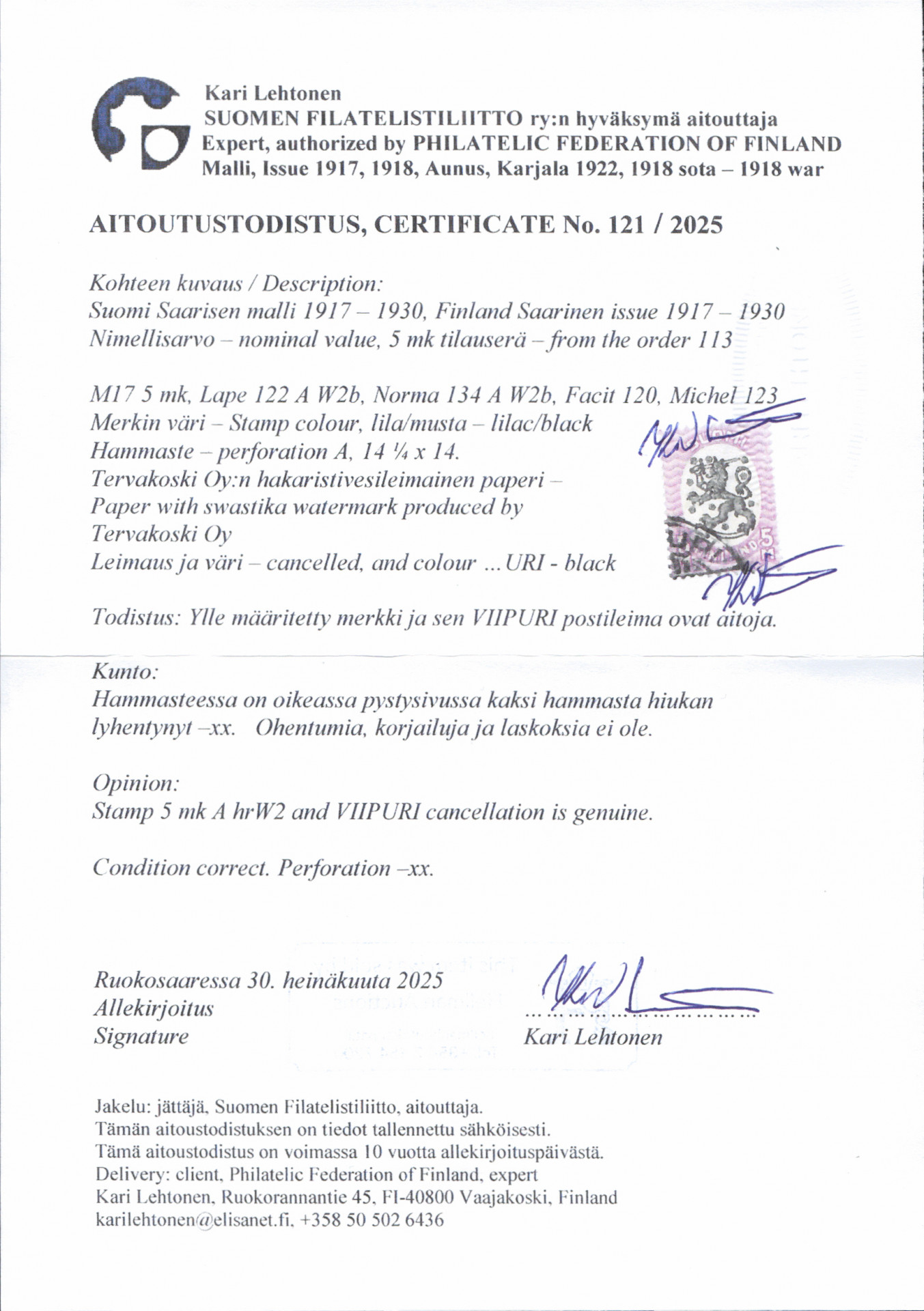 5 markkaa lila/musta AW2 harvinaisemmasta tilauserästä 113 (L. 122 AW2b). Aitoutus Lehtonen (2025)