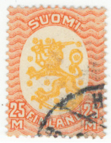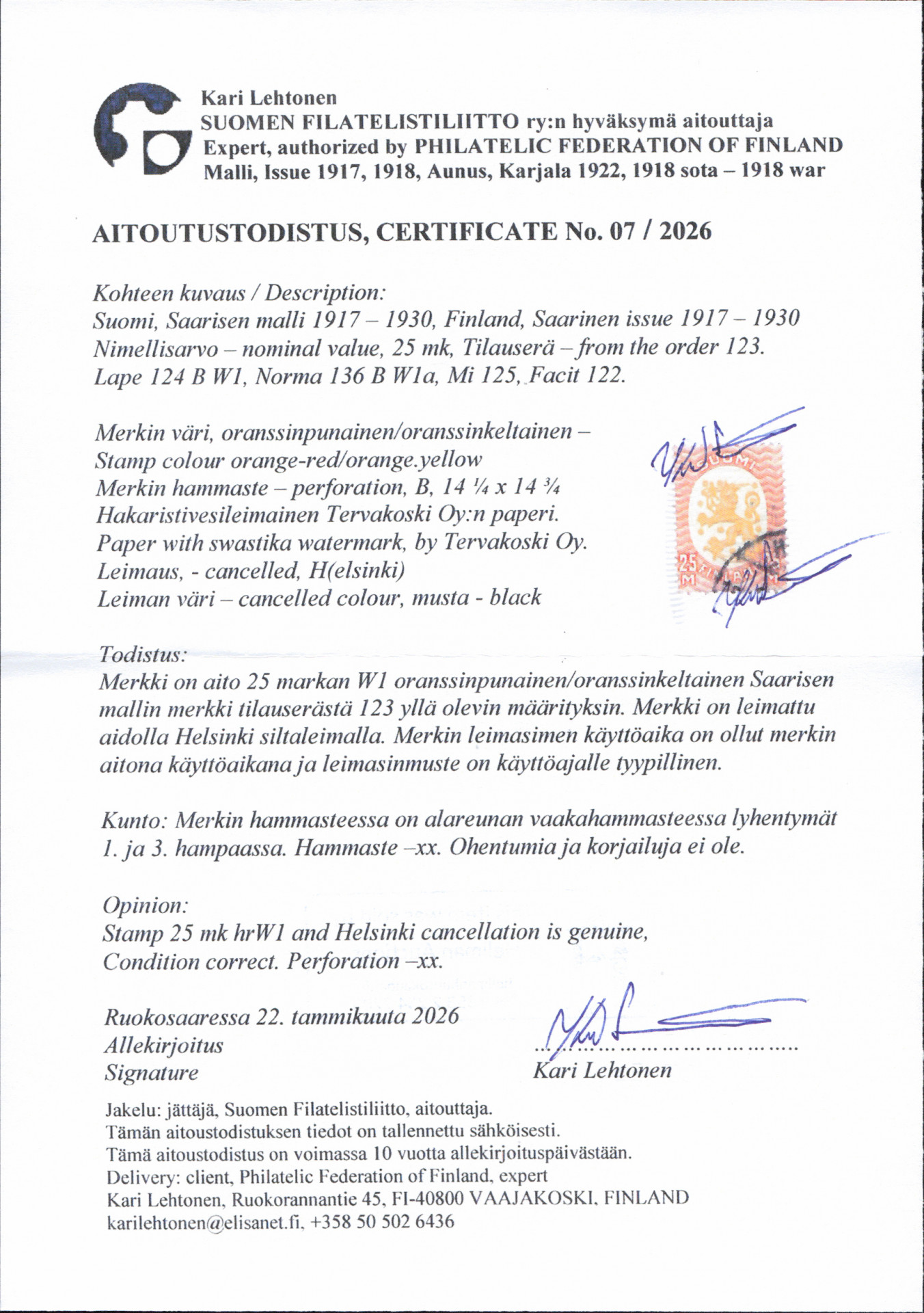 25 markkaa BW1 erittäin harvinainen leimattu. Kaksi hiukan lyhyttä hammasta. (L. 124BW1) Aitoutus: Lehtonen (2026)
