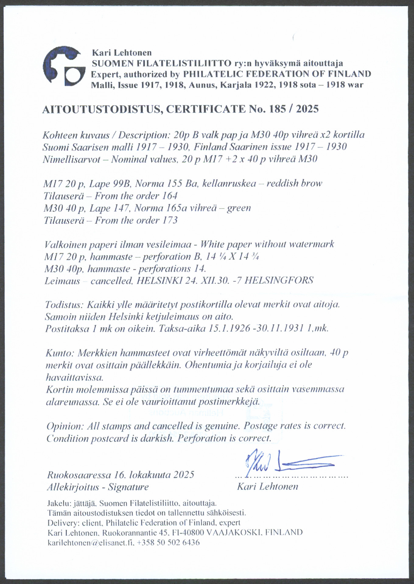 20 penniä sekapostitteena m/30 40 penniä kahden merkin kera kortilla, Helsinki 1930. Kortin reunoissa hieman tummentumaa. Aitoutus: Lehtonen (2025)