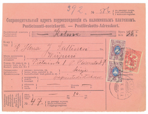 Sekapostite 10 penniä m/11 40 penniä parin kanssa postietuantikortilla, kaunis Wärtsilä 1918