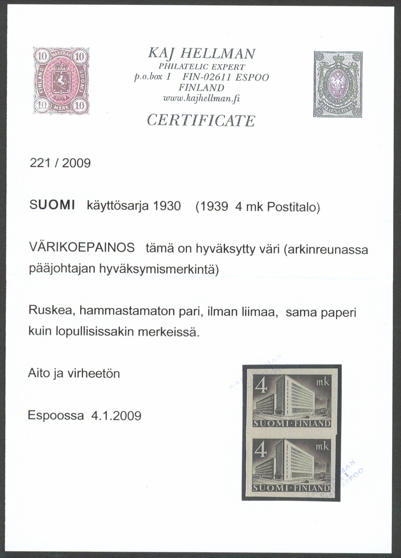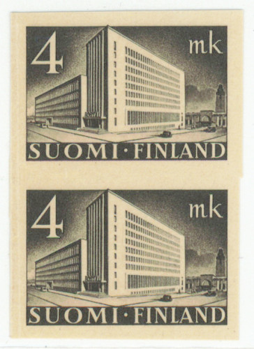 4 markkaa Postitalo hammastamaton pystypari, käyttämätön (*) ilman liimaa. Lausunto: Kaj Hellman (2009)