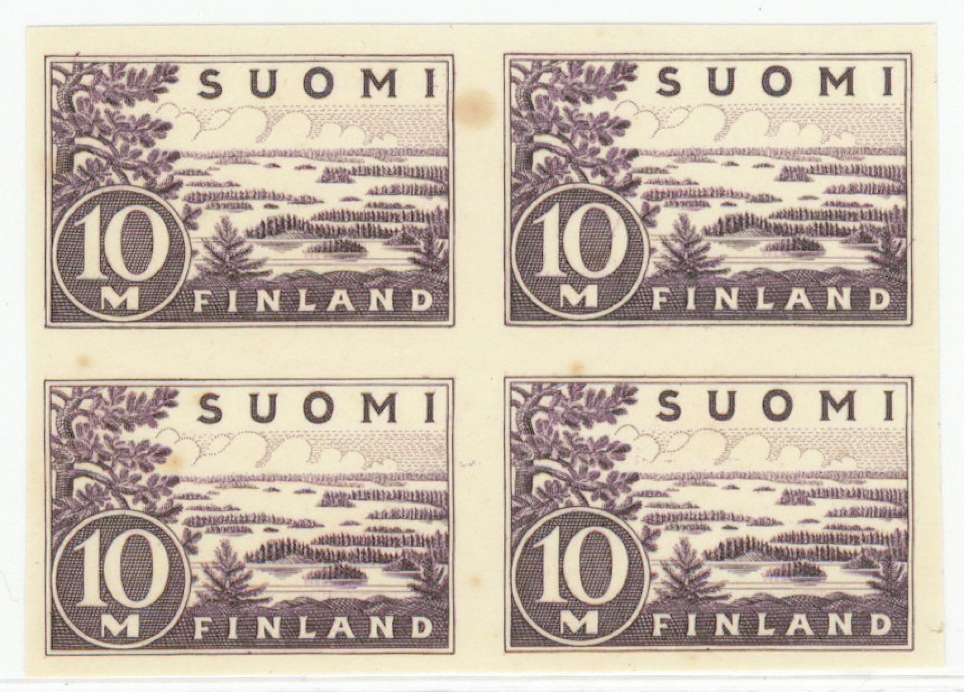 10 markkaa Saimaa hammastamaton nelilö, käyttämätön (*) ilman liimaa. Pieni tummentuma