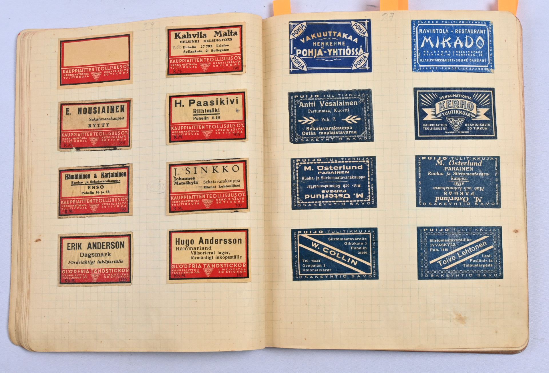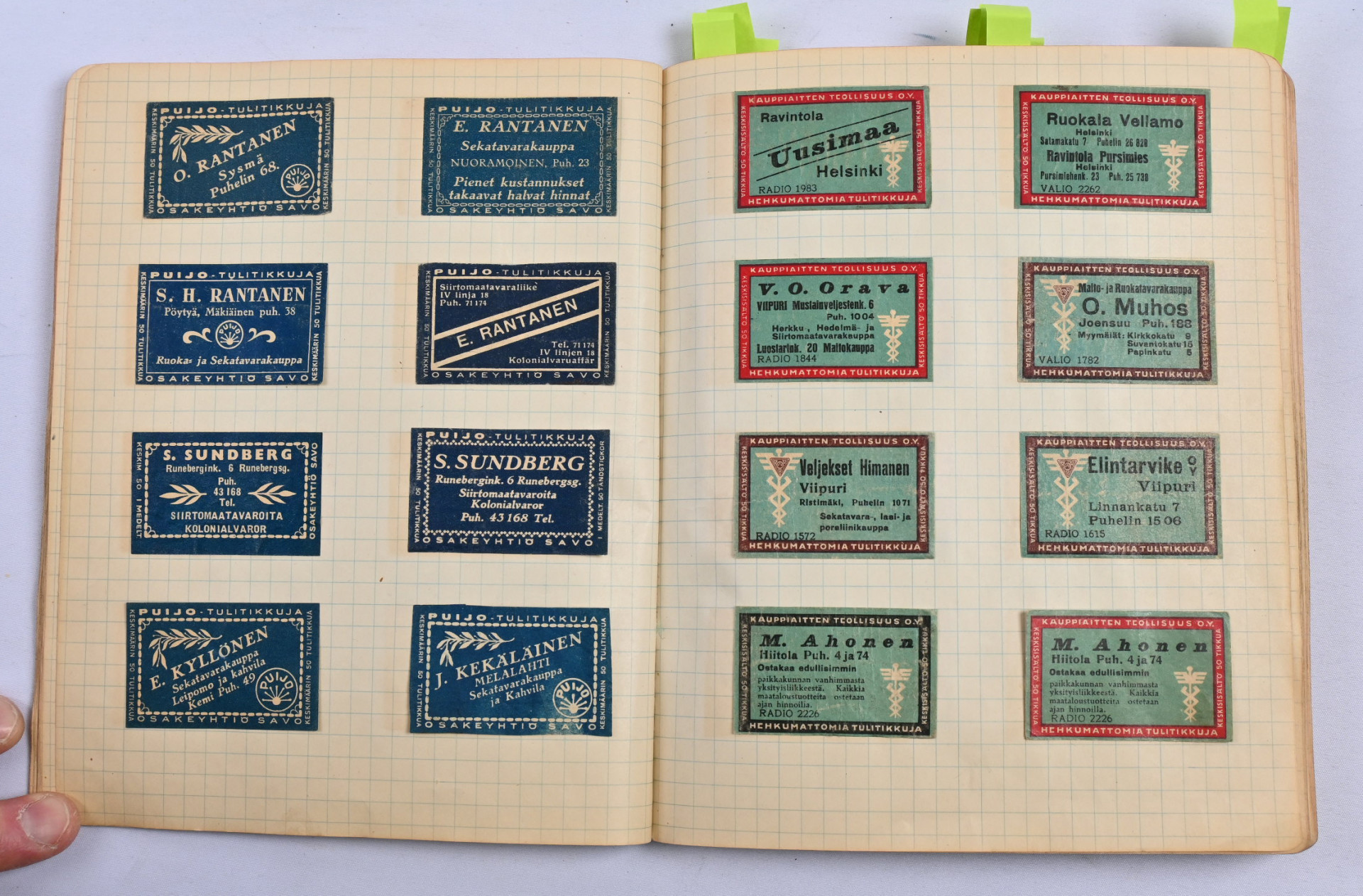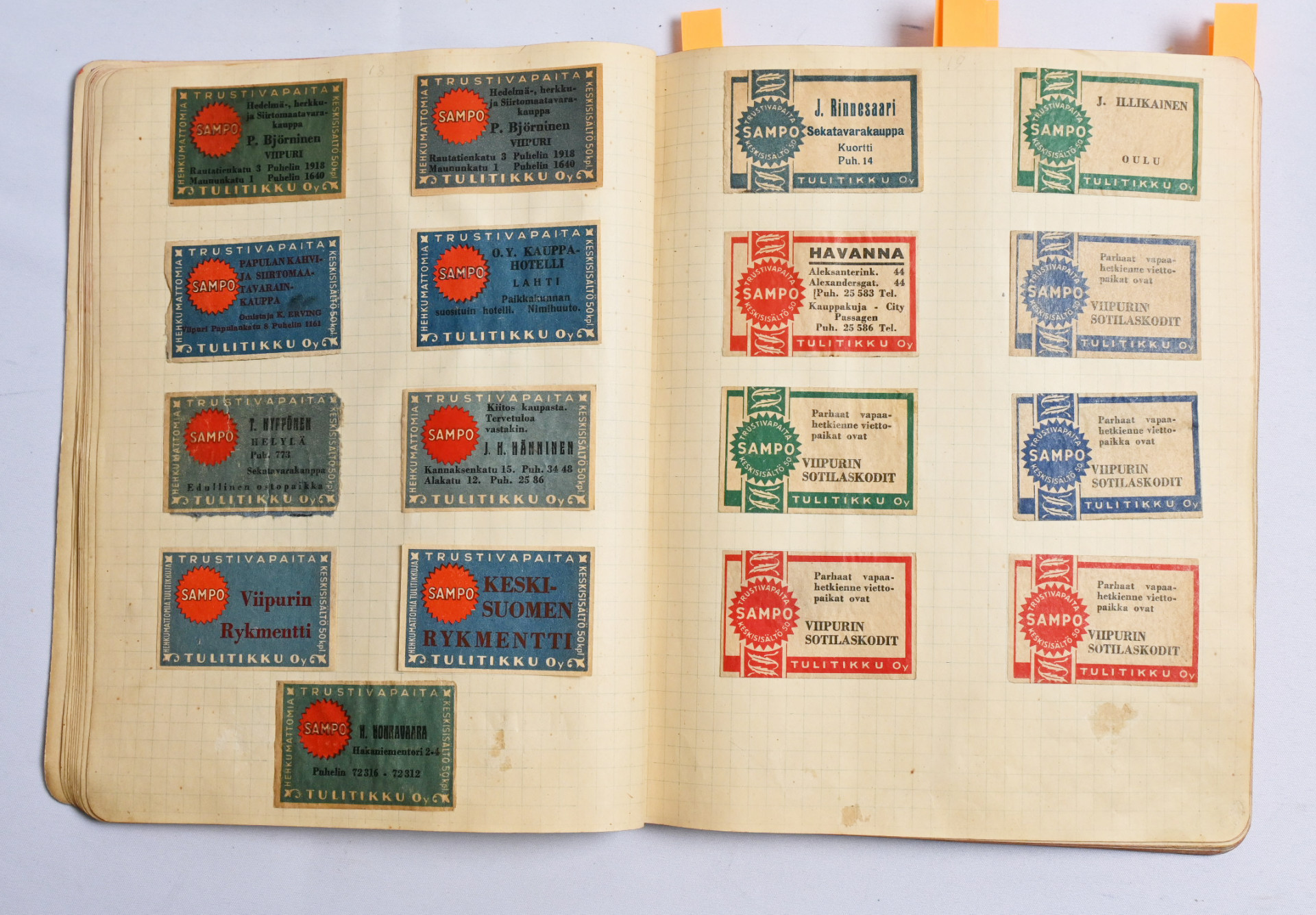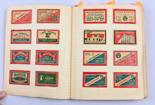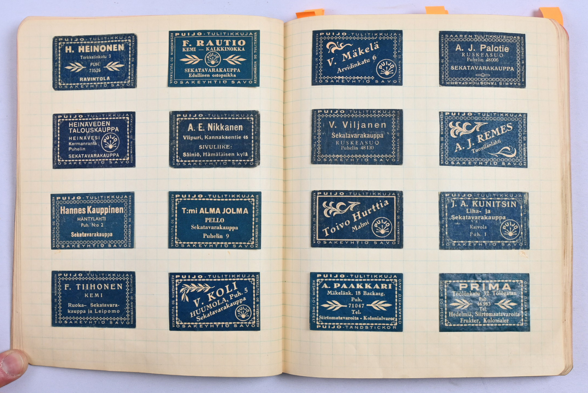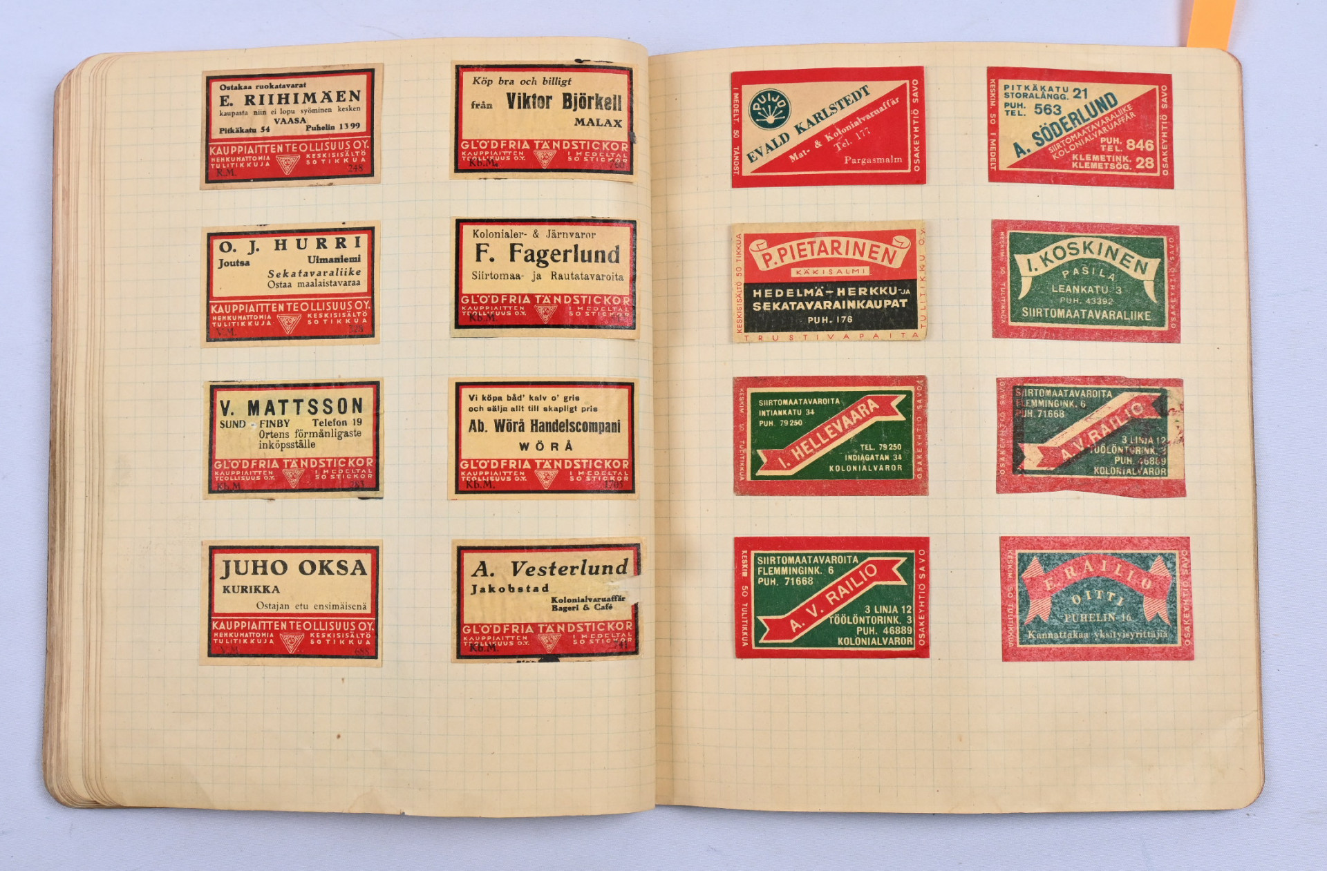Vanhoja tulitikkuetikettejä upea vanha, 1960-luvulla tehty kokoelma neljässä vihkossa. Yli 3000 ilmeisesti pääasiassa erilaista etikettiä, vain vanhaa. Lähinnä kauppiasetikettejä, mutta myös vähän muutakin (vientietikettejä, isokokoisia). Kiinnitetty sivuille pienillä liimatipoilla ja irtoavat siististi rikkoontumatta. Erittäin monipuolinen, myös runsaasti (noin 250) luovutettua aluetta. Tilaisuus. Nähtävä! .