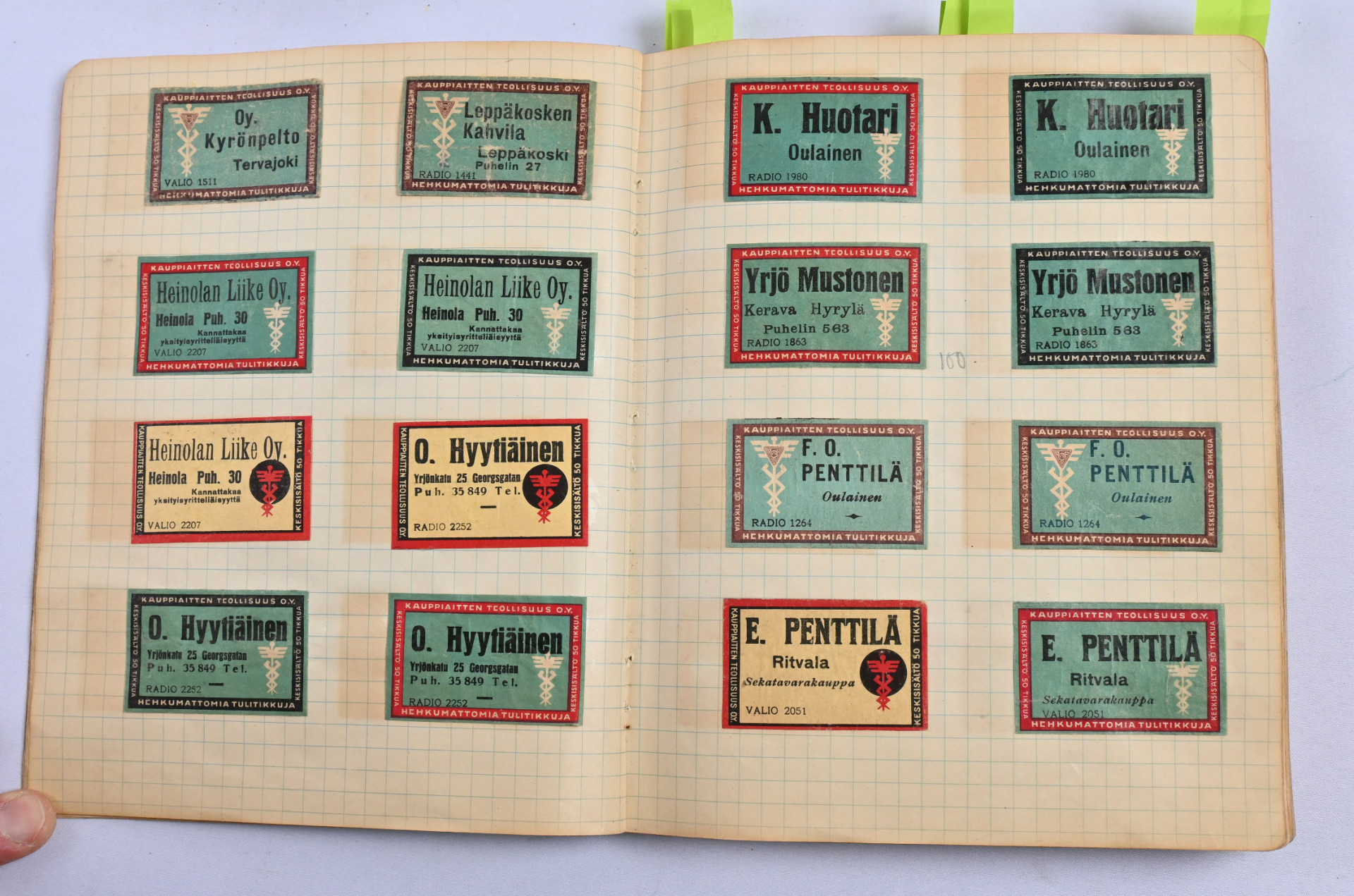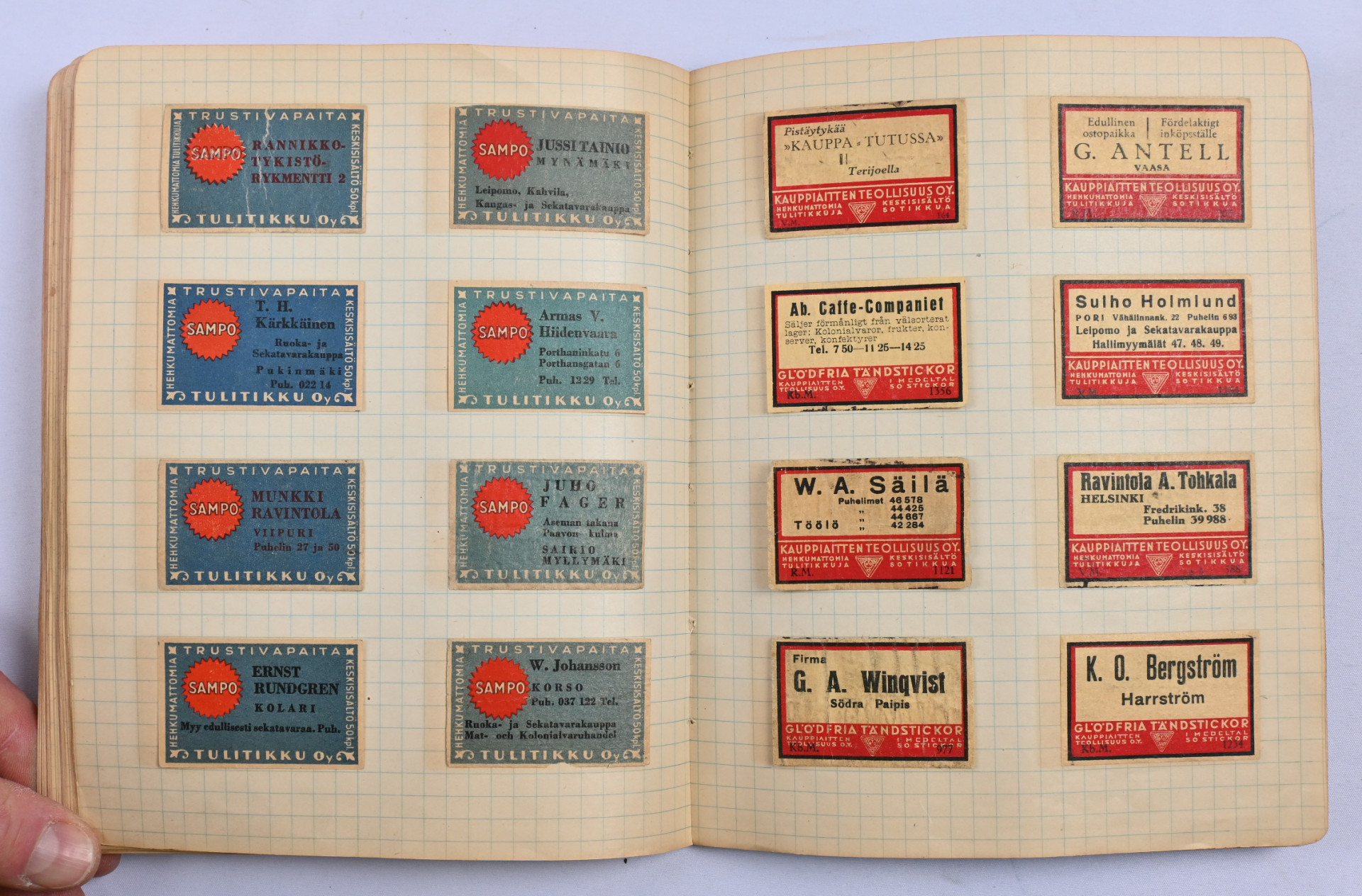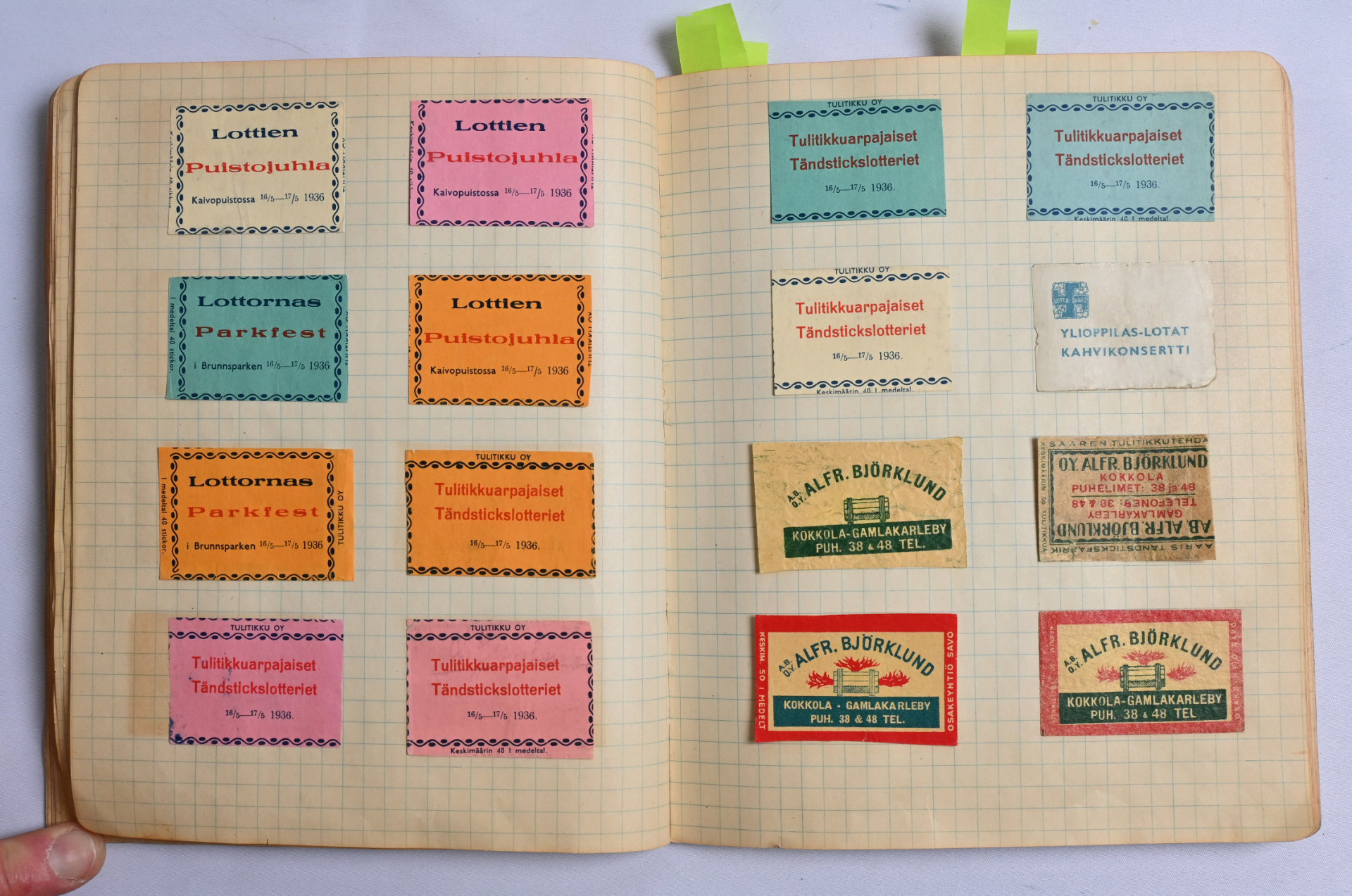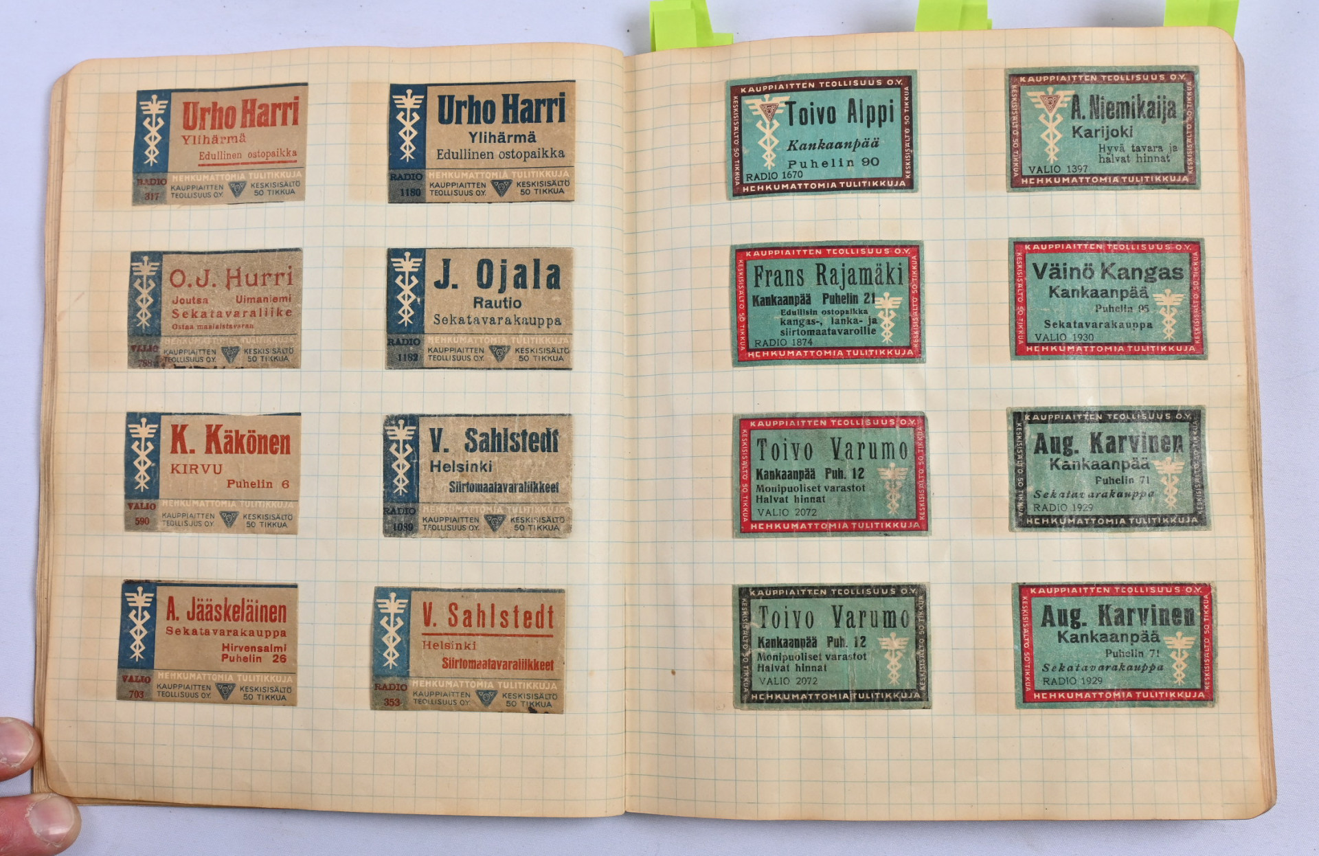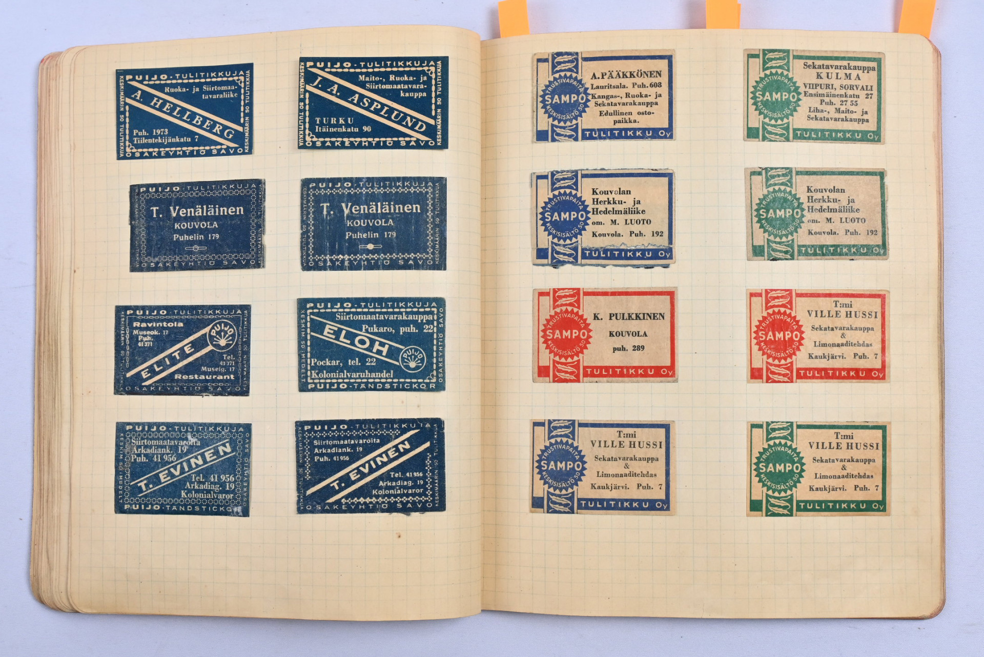 Vanhoja tulitikkuetikettejä upea vanha, 1960-luvulla tehty kokoelma neljässä vihkossa. Yli 3000 ilmeisesti pääasiassa erilaista etikettiä, vain vanhaa. Lähinnä kauppiasetikettejä, mutta myös vähän muutakin (vientietikettejä, isokokoisia). Kiinnitetty sivuille pienillä liimatipoilla ja irtoavat siististi rikkoontumatta. Erittäin monipuolinen, myös runsaasti (noin 250) luovutettua aluetta. Tilaisuus. Nähtävä! .
