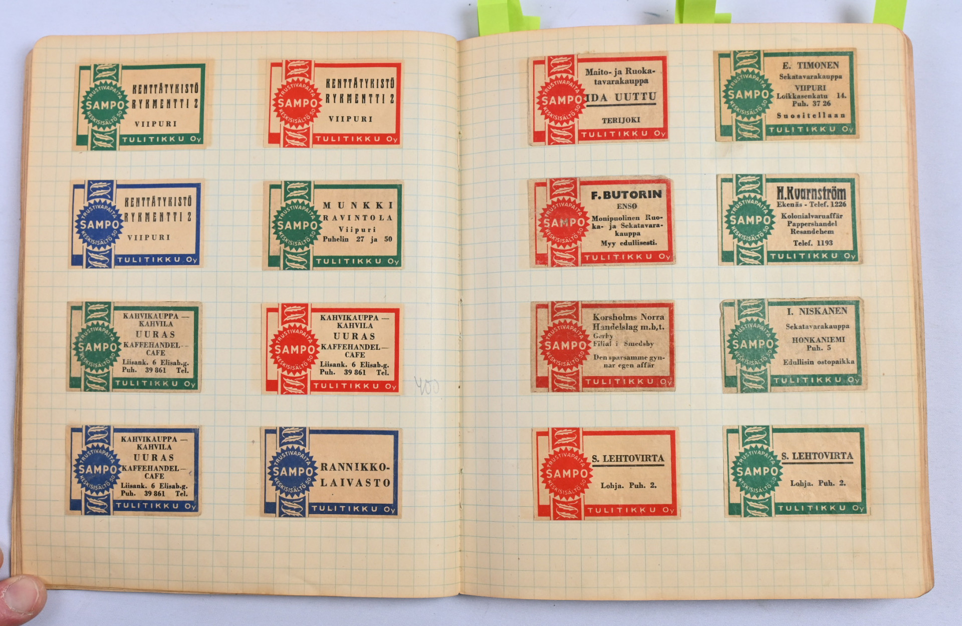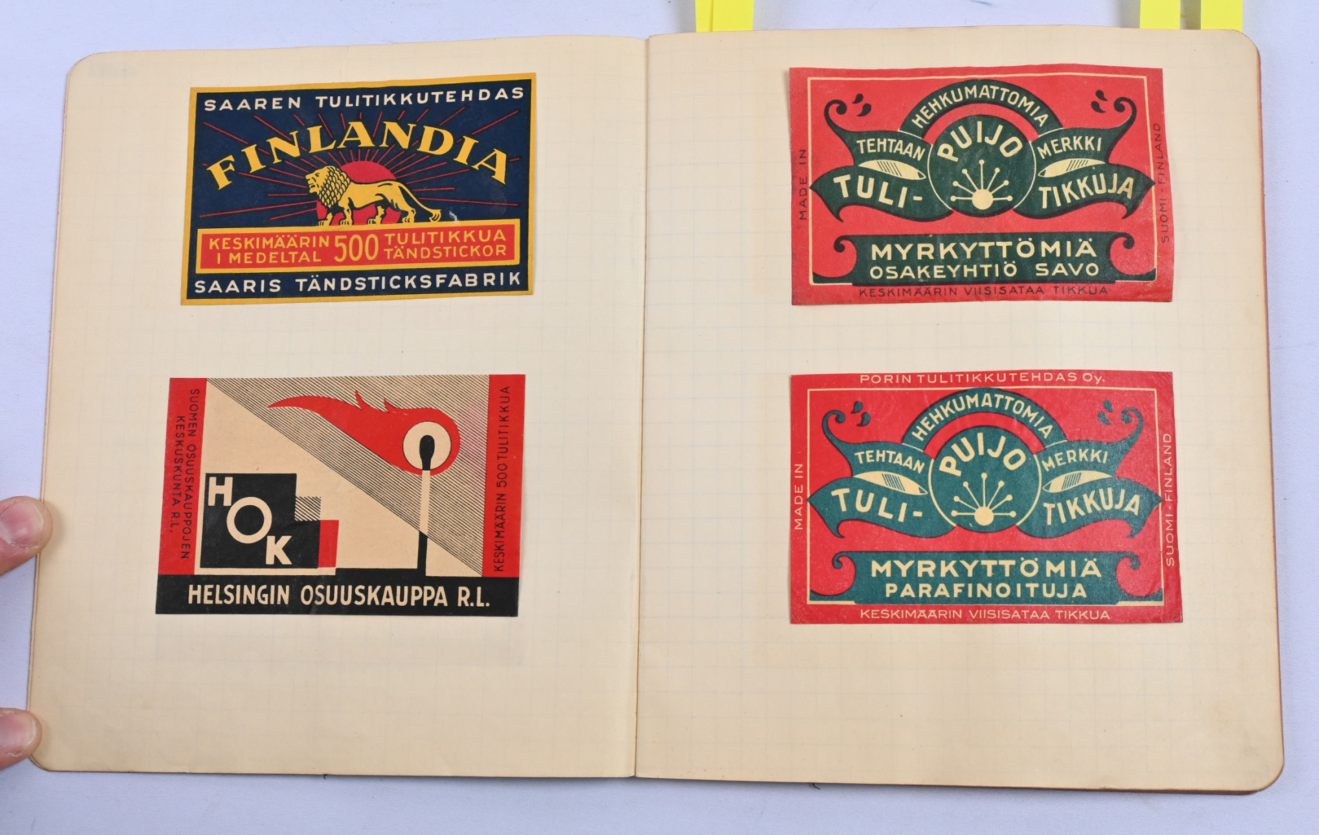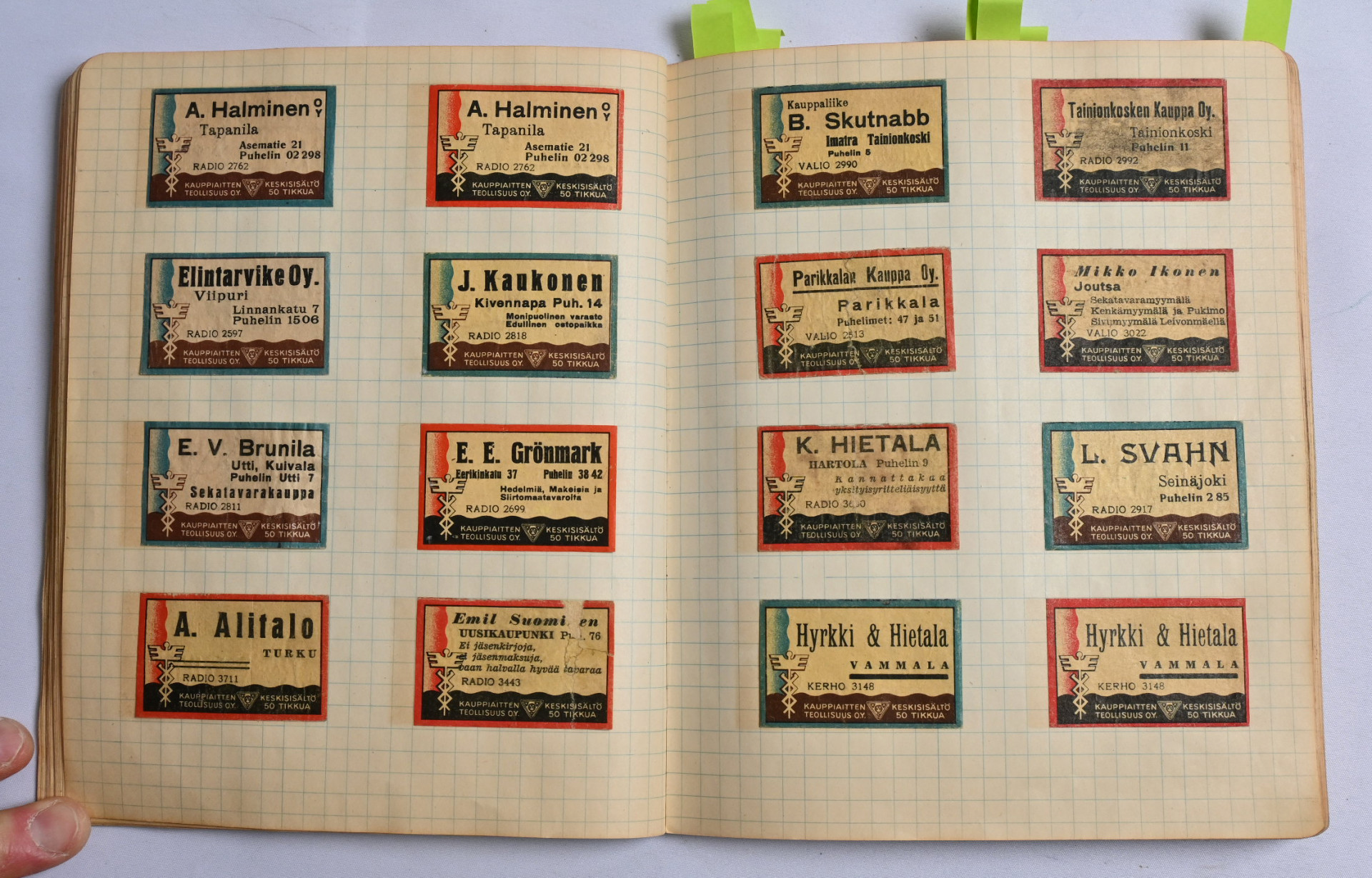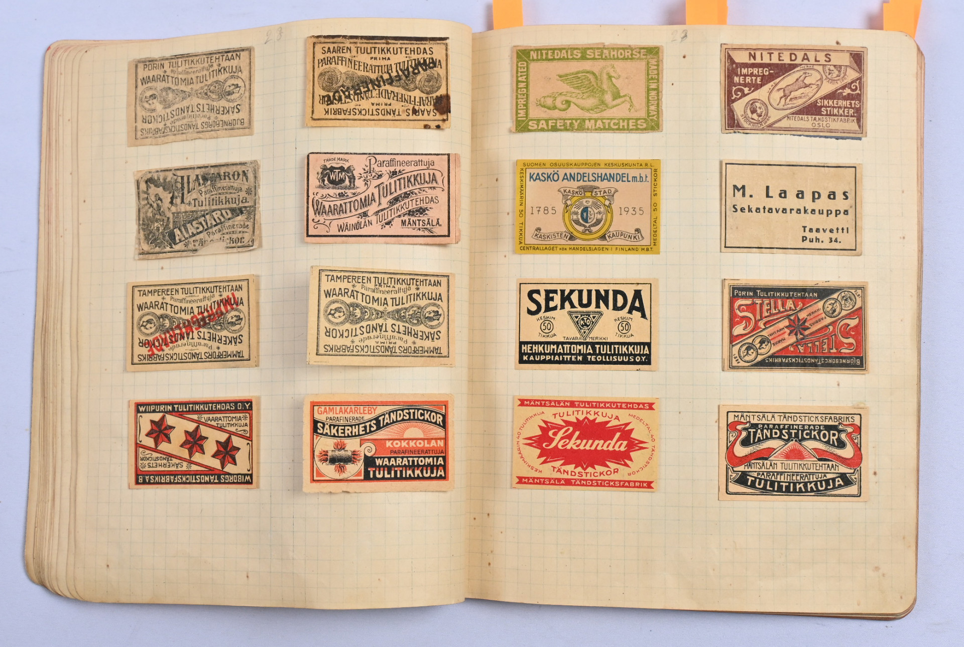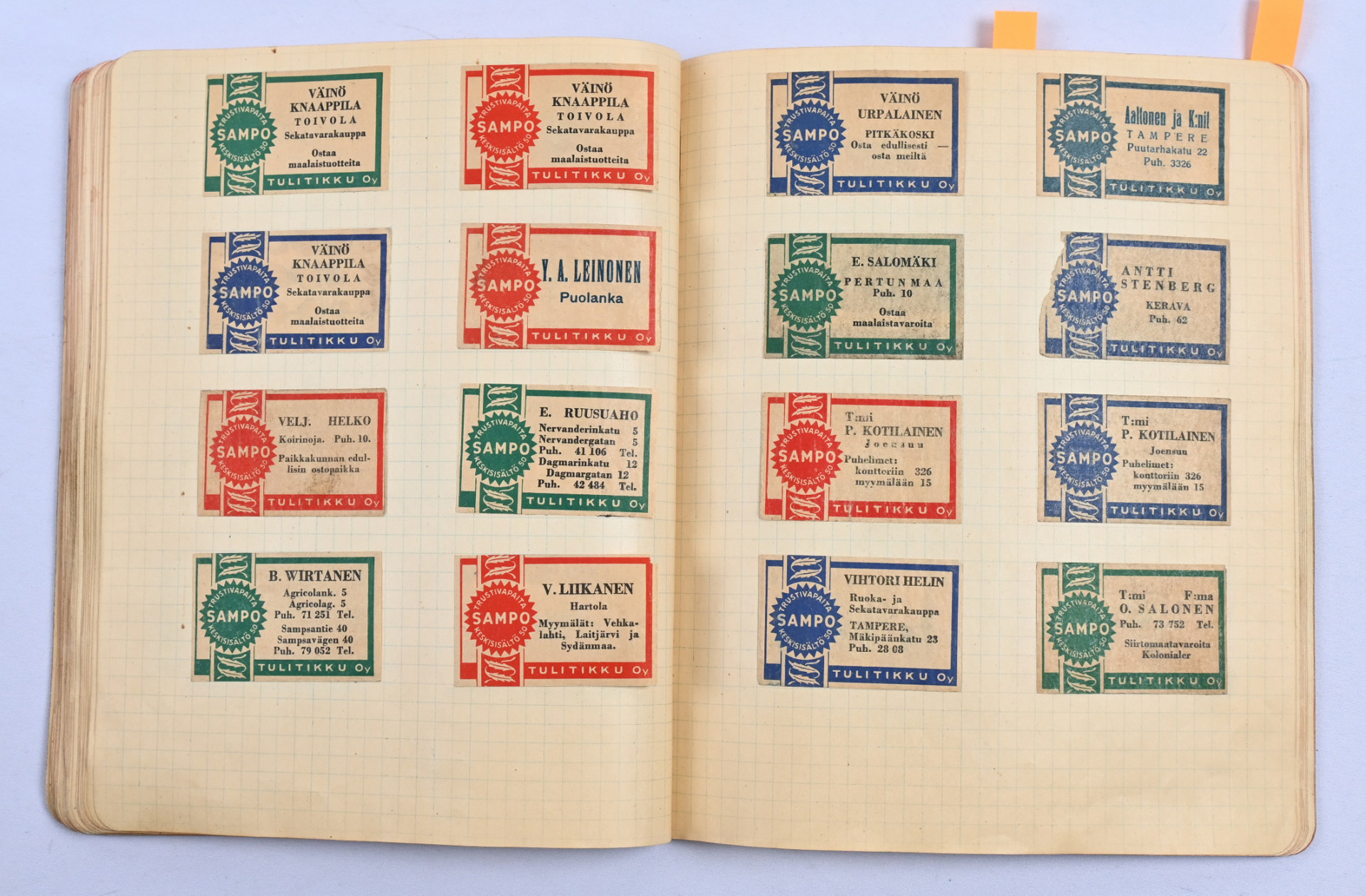 Vanhoja tulitikkuetikettejä upea vanha, 1960-luvulla tehty kokoelma neljässä vihkossa. Yli 3000 ilmeisesti pääasiassa erilaista etikettiä, vain vanhaa. Lähinnä kauppiasetikettejä, mutta myös vähän muutakin (vientietikettejä, isokokoisia). Kiinnitetty sivuille pienillä liimatipoilla ja irtoavat siististi rikkoontumatta. Erittäin monipuolinen, myös runsaasti (noin 250) luovutettua aluetta. Tilaisuus. Nähtävä! .