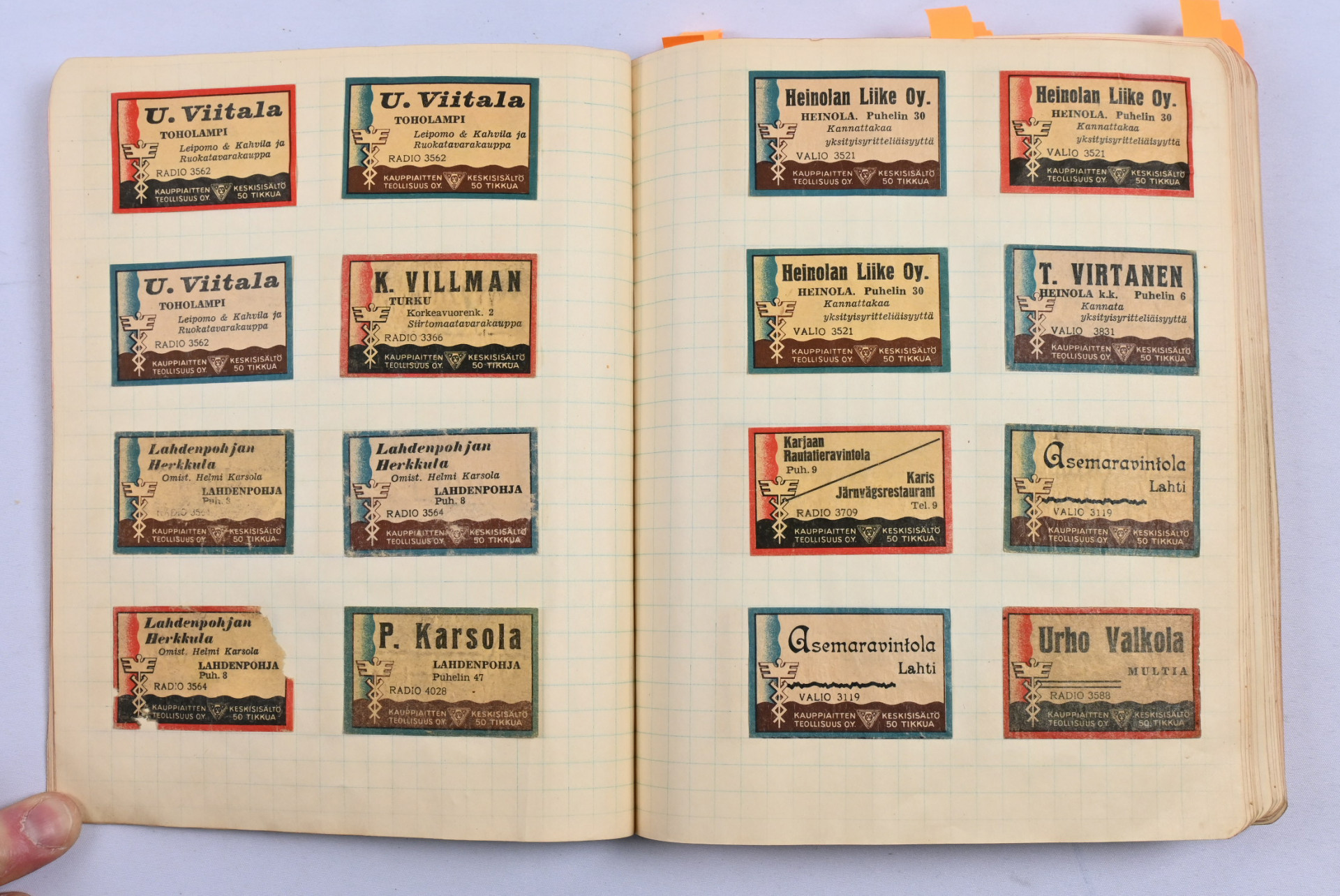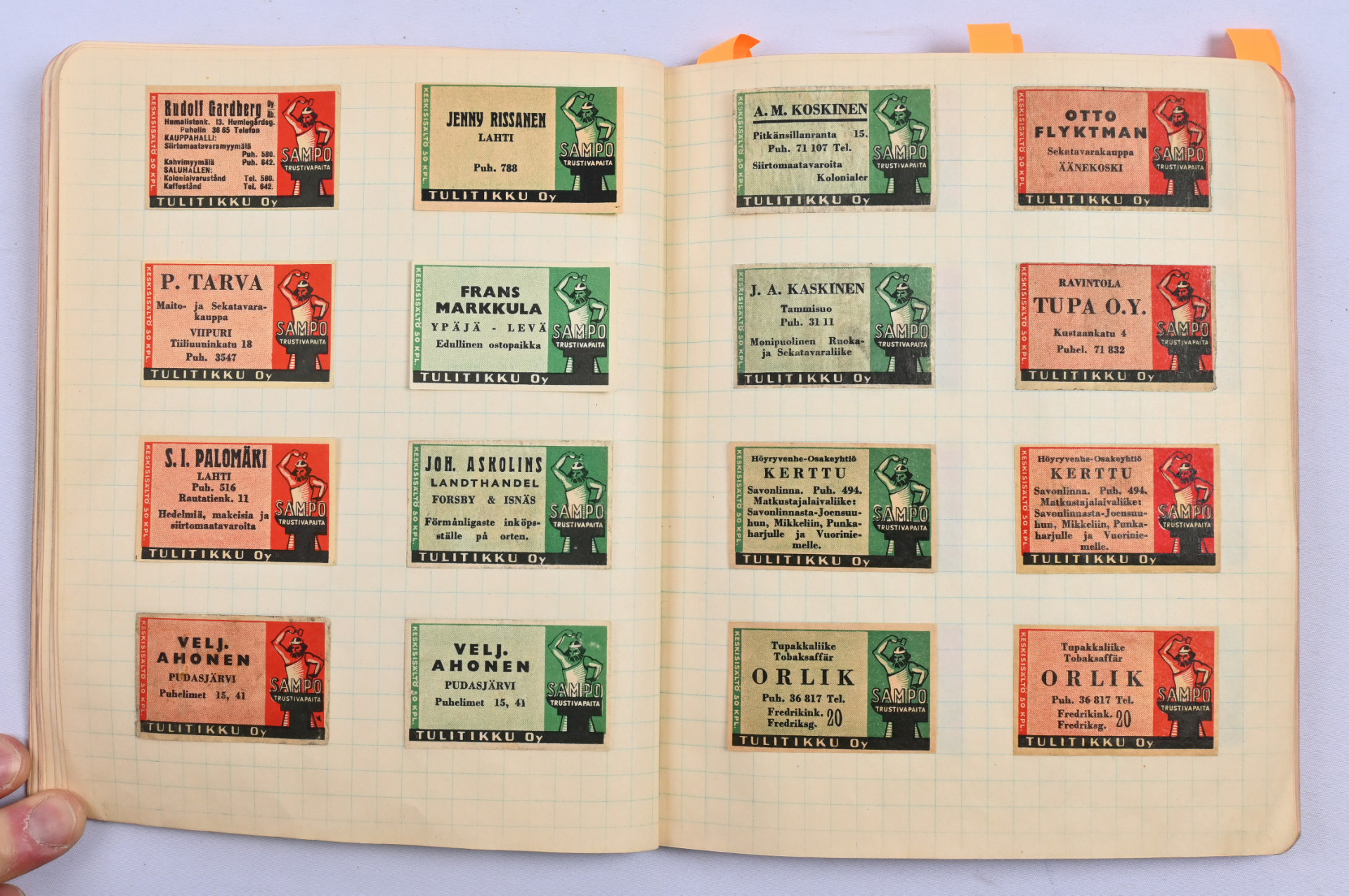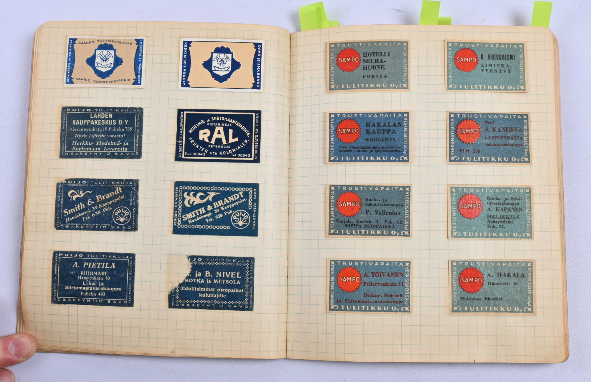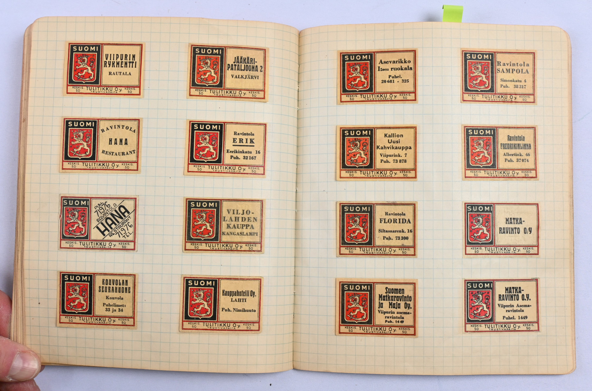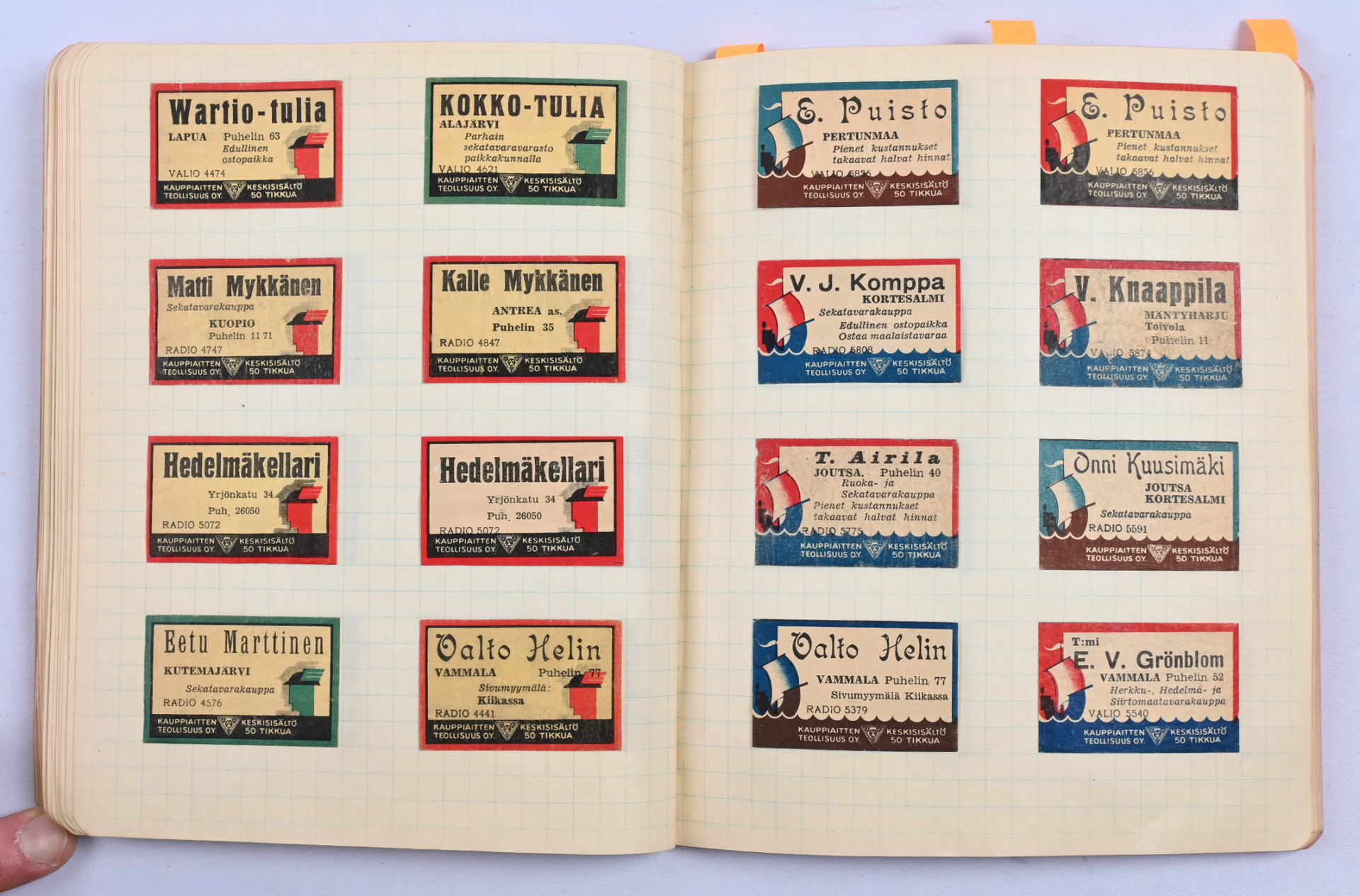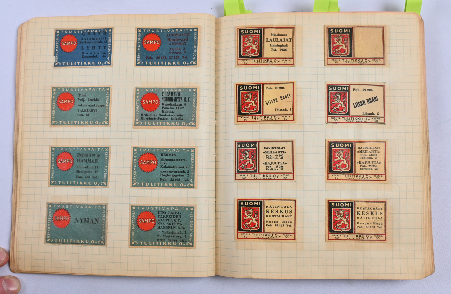 Vanhoja tulitikkuetikettejä upea vanha, 1960-luvulla tehty kokoelma neljässä vihkossa. Yli 3000 ilmeisesti pääasiassa erilaista etikettiä, vain vanhaa. Lähinnä kauppiasetikettejä, mutta myös vähän muutakin (vientietikettejä, isokokoisia). Kiinnitetty sivuille pienillä liimatipoilla ja irtoavat siististi rikkoontumatta. Erittäin monipuolinen, myös runsaasti (noin 250) luovutettua aluetta. Tilaisuus. Nähtävä! .